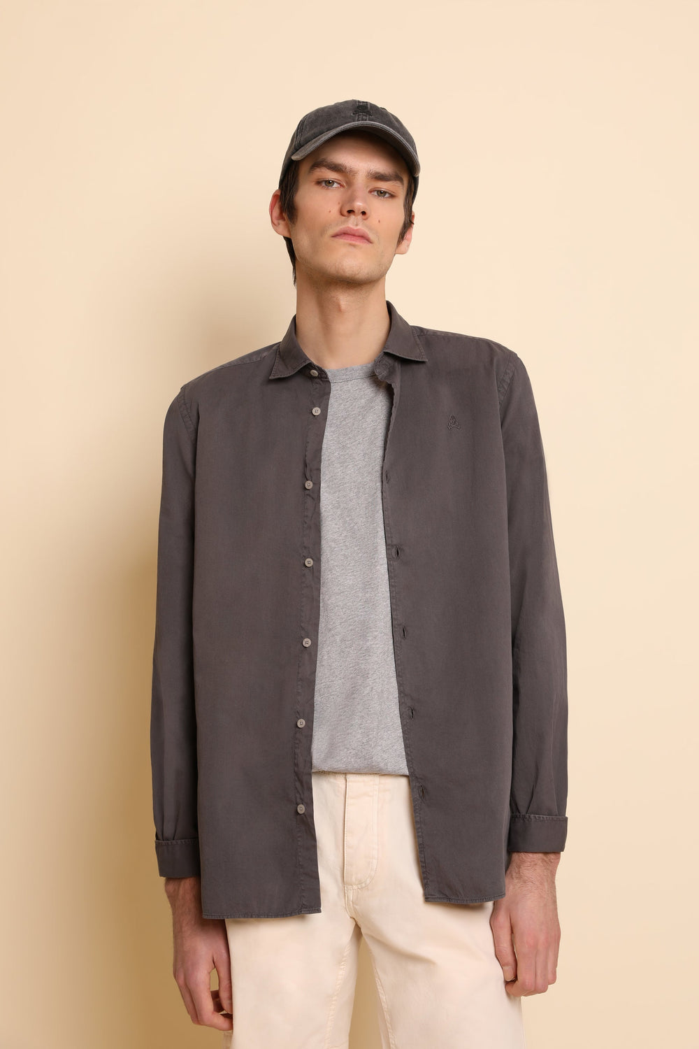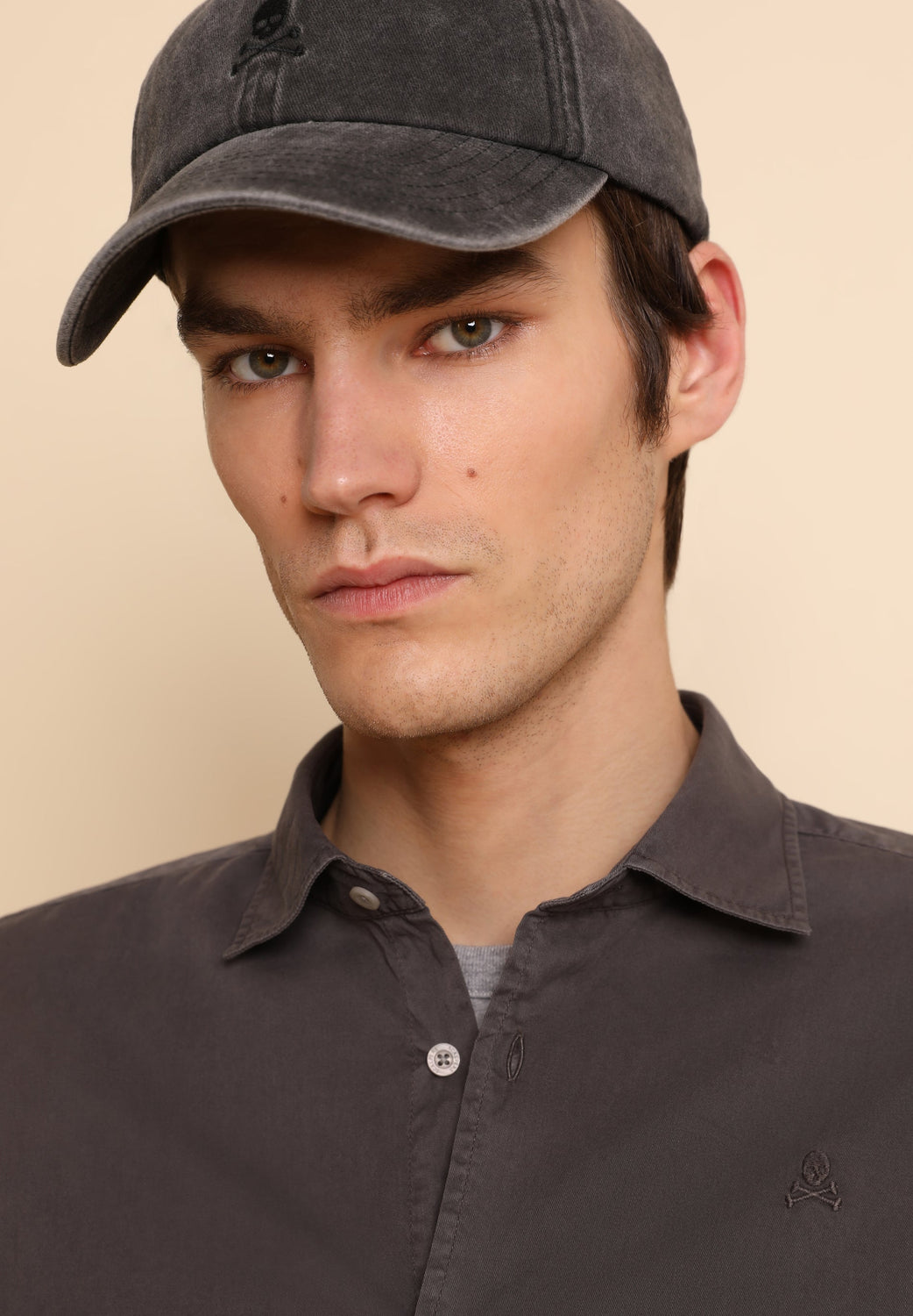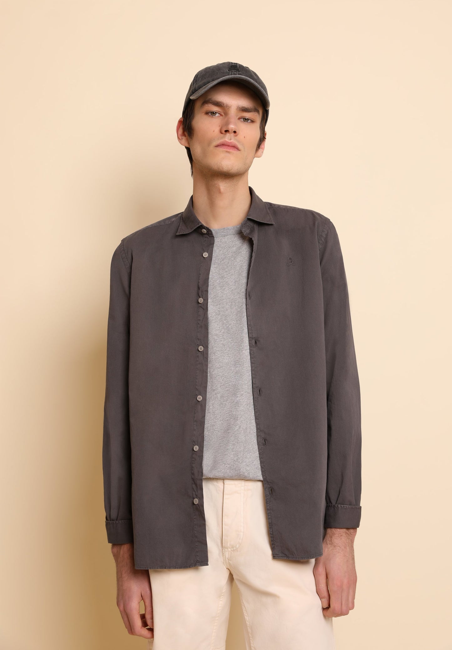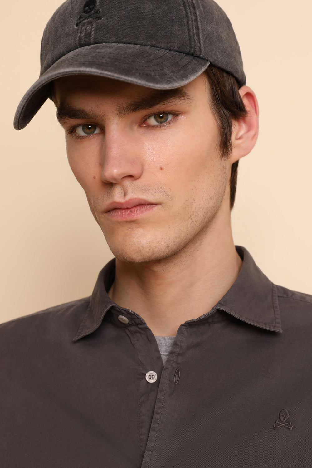 Camisa lavada con calavera bordada a tono.