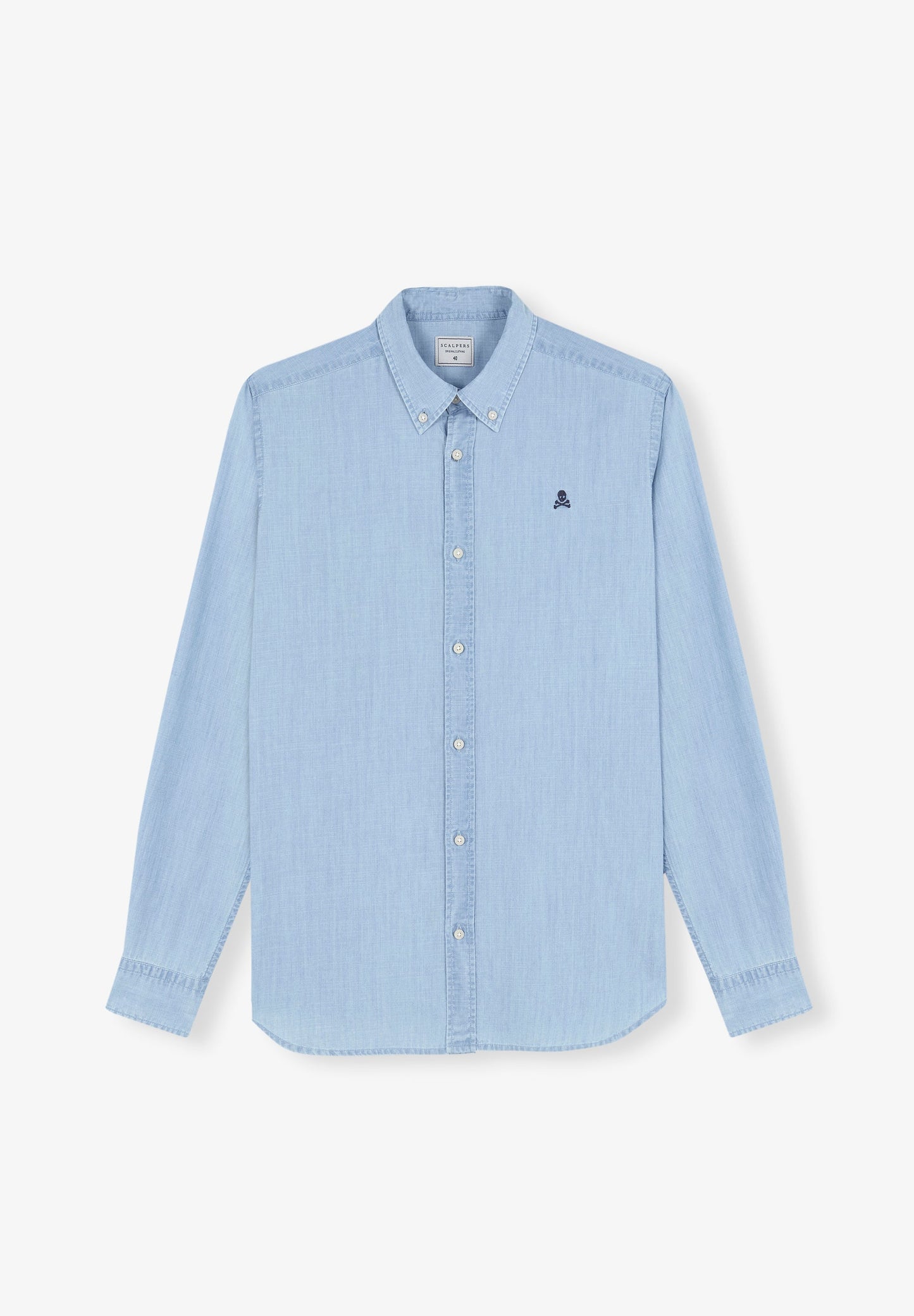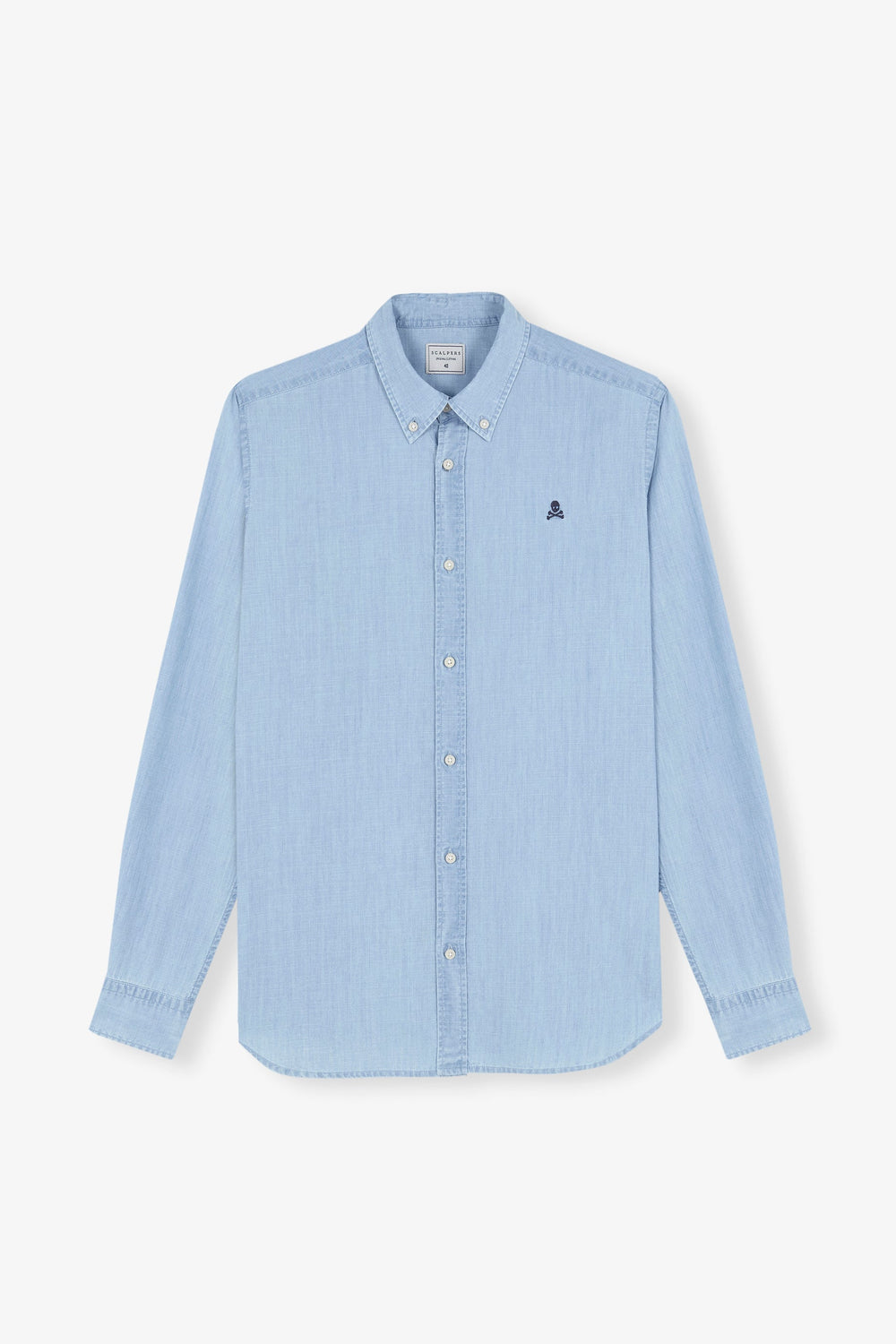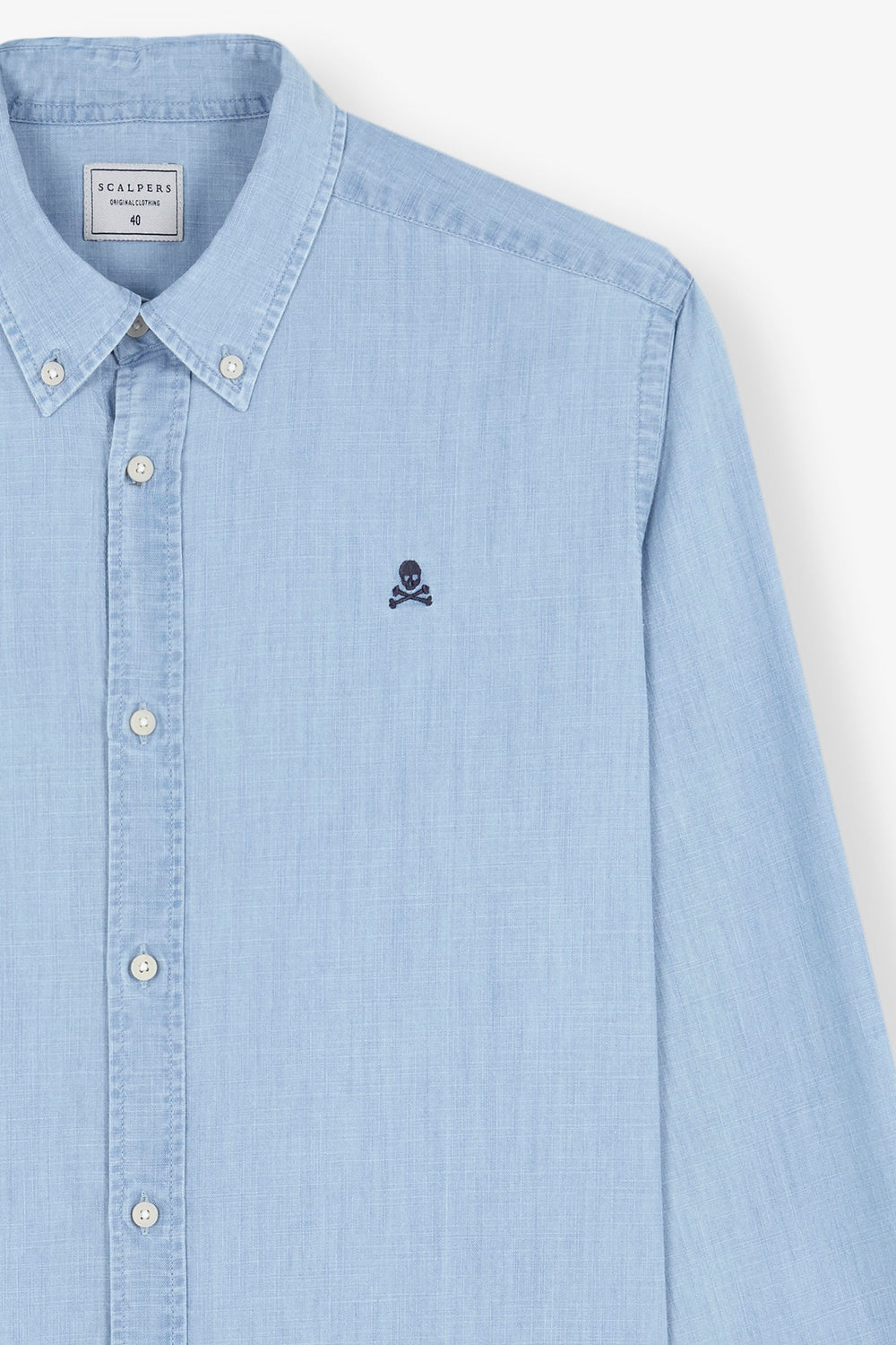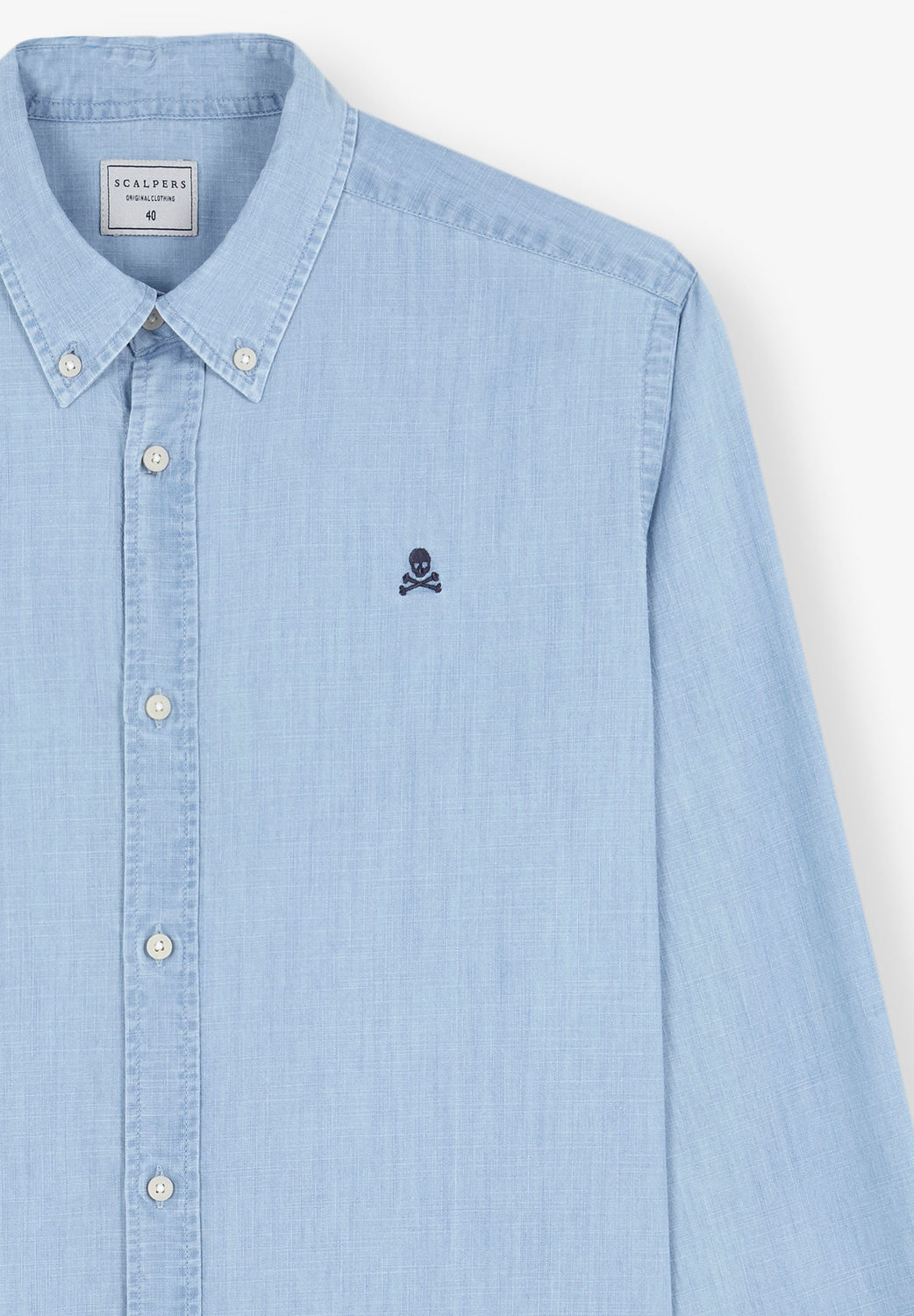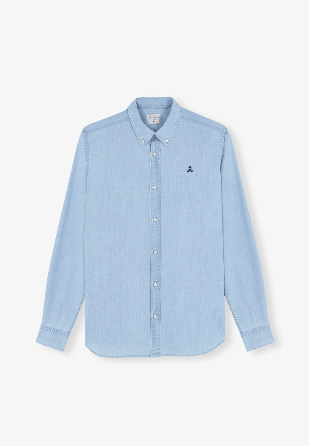 Camisa denim confeccionada en 100% algodón orgánico. Corte Regular Fit, cuello clásico y cierre con botones. Manga larga y detalle de calavera bordada a contraste.