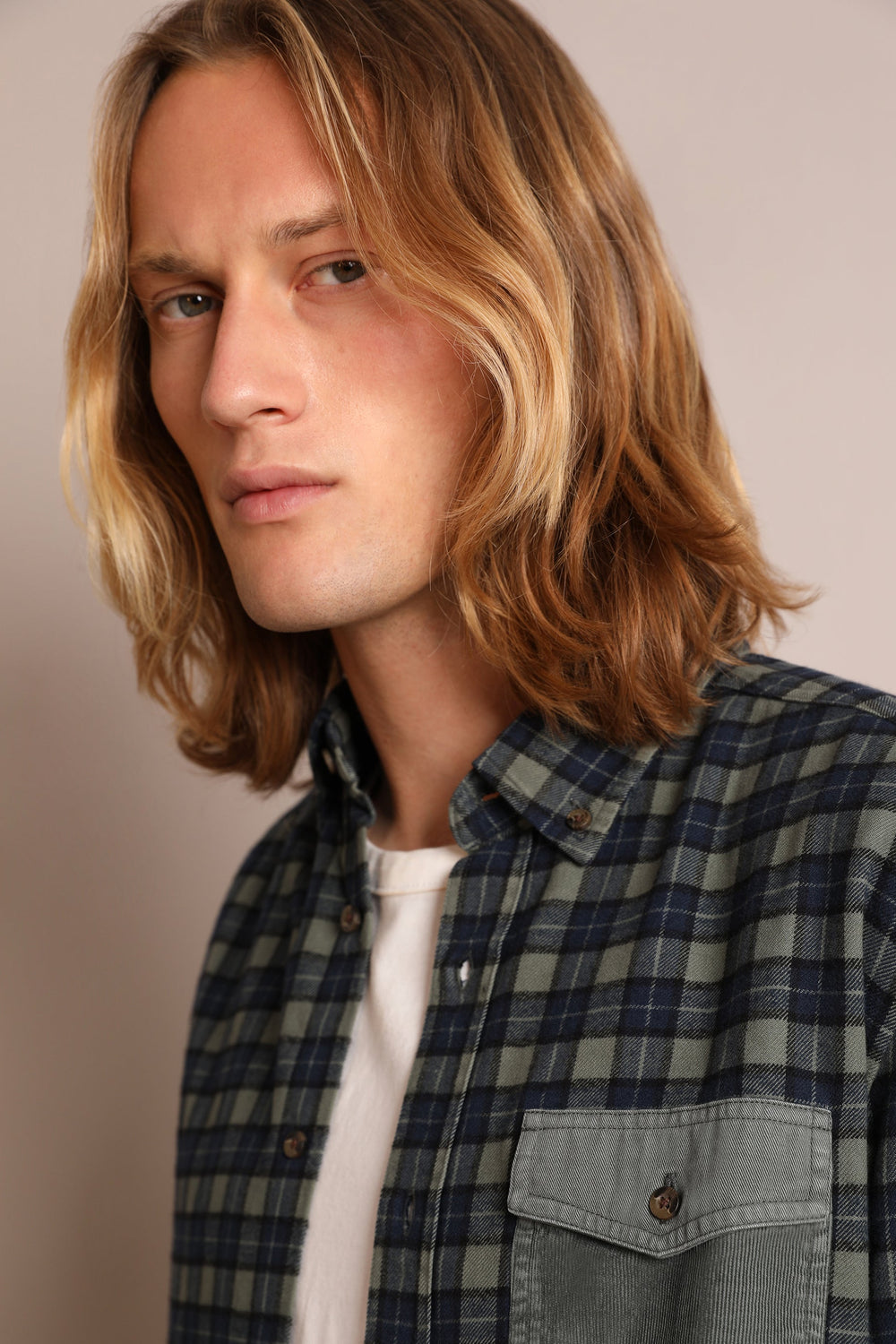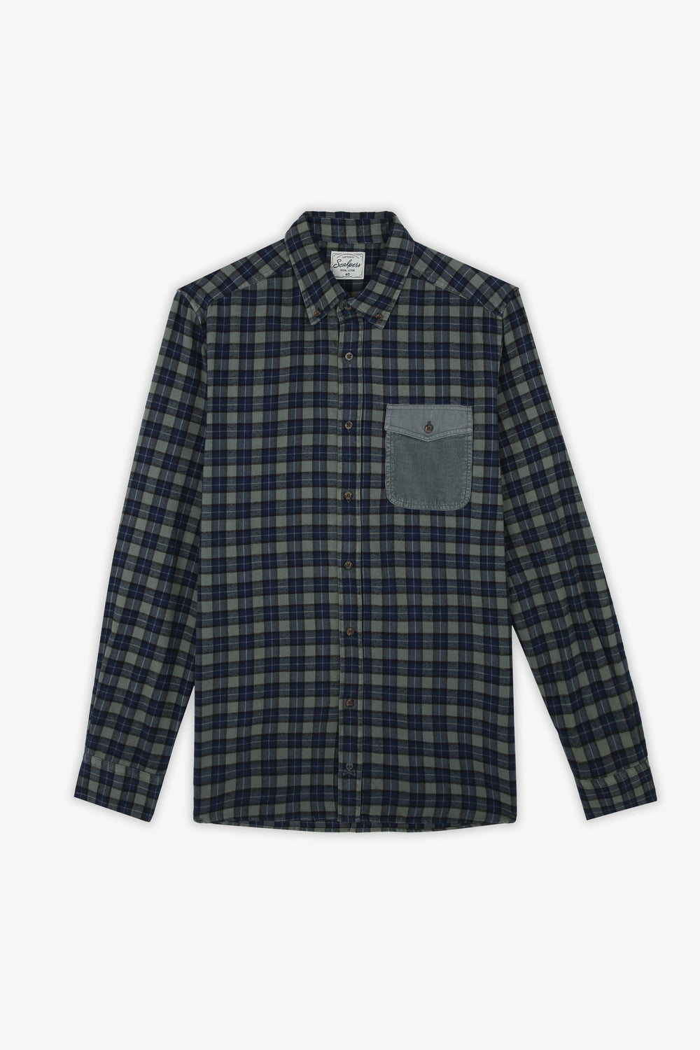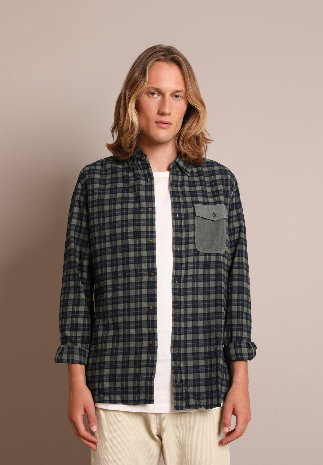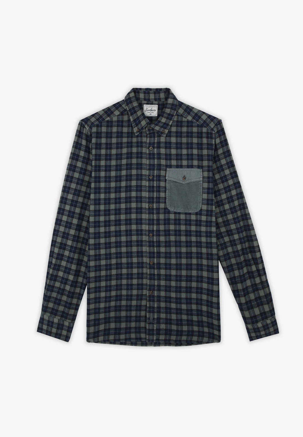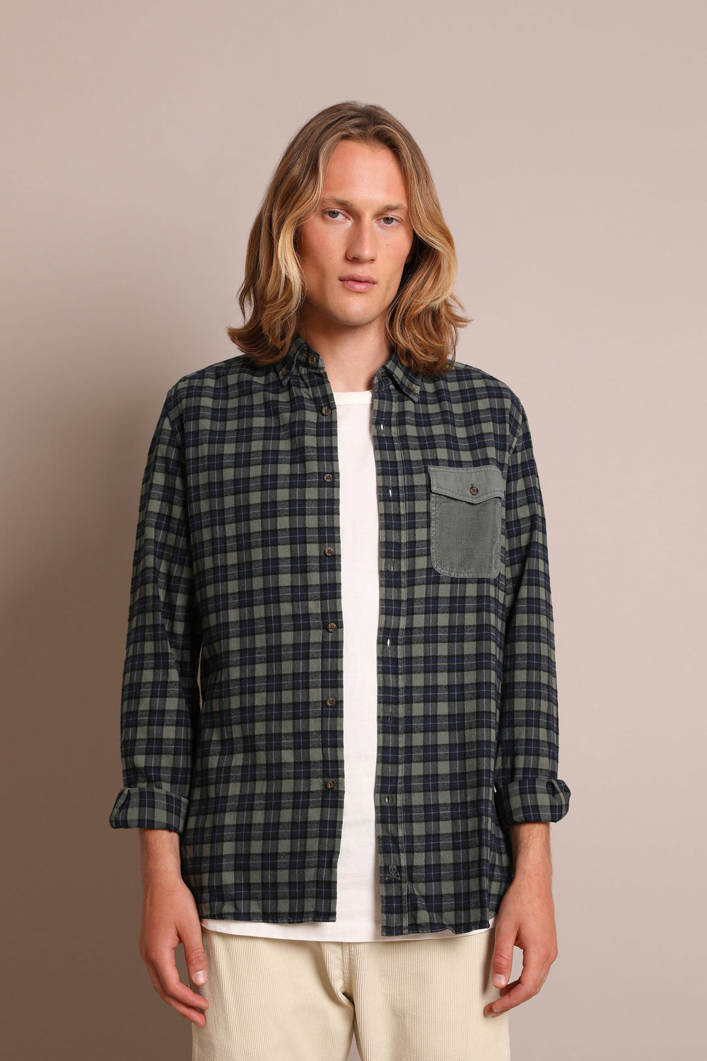- Bolsillo tipo parche de distinto tejido en el pecho