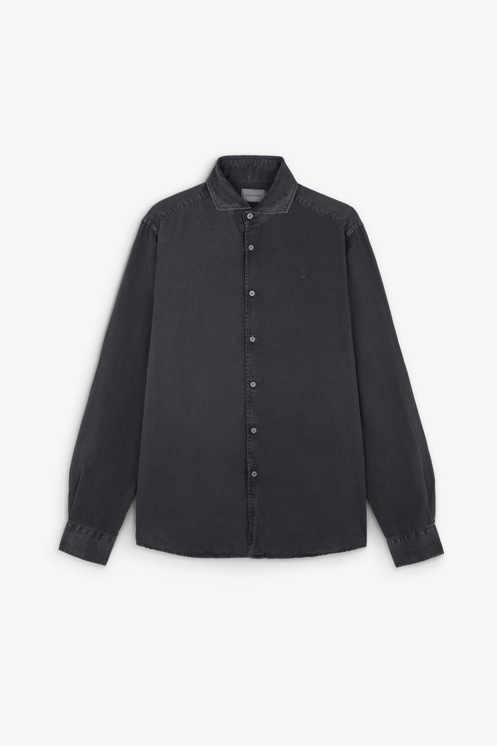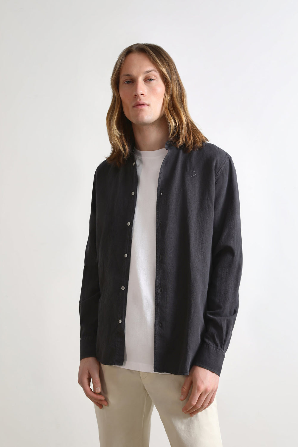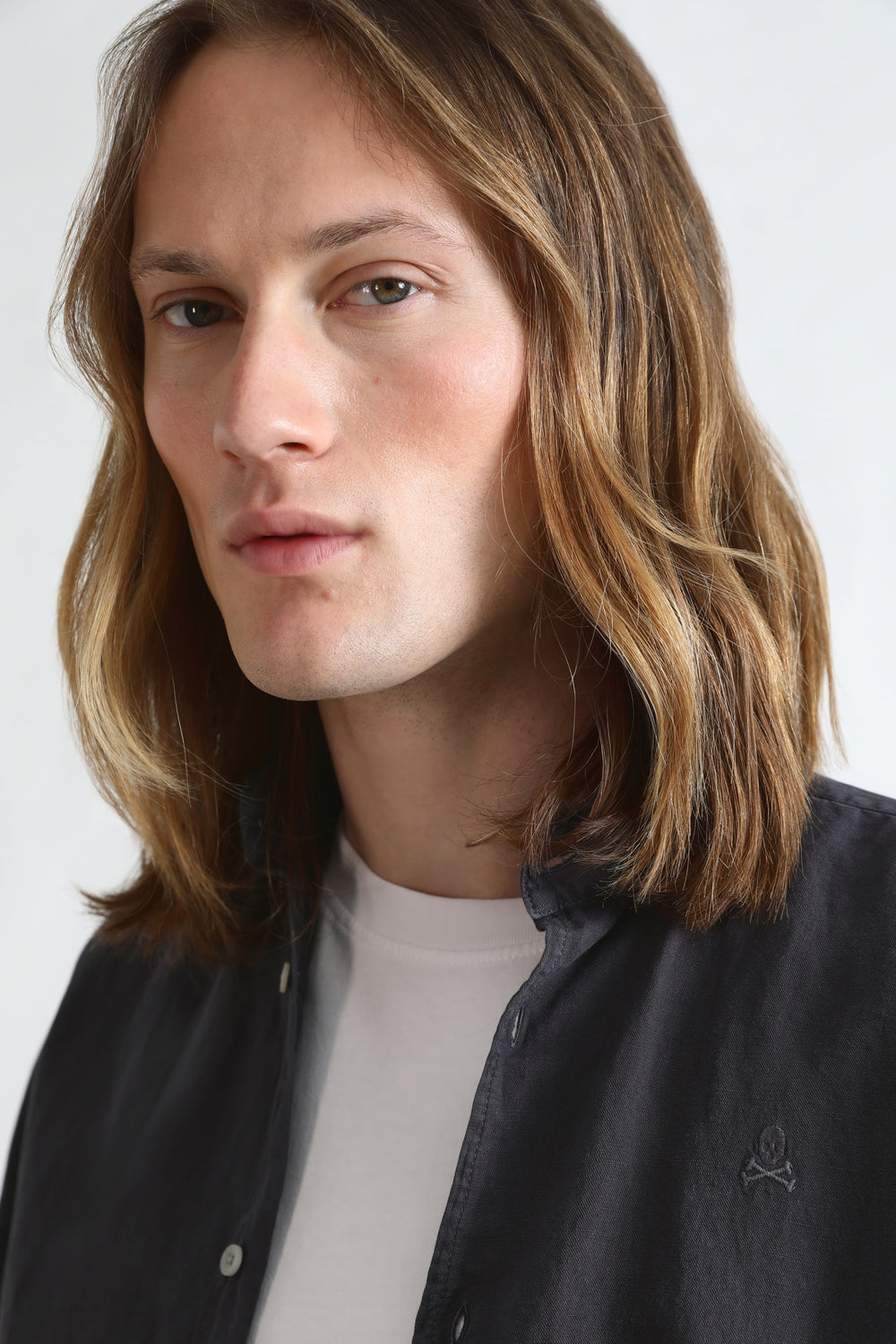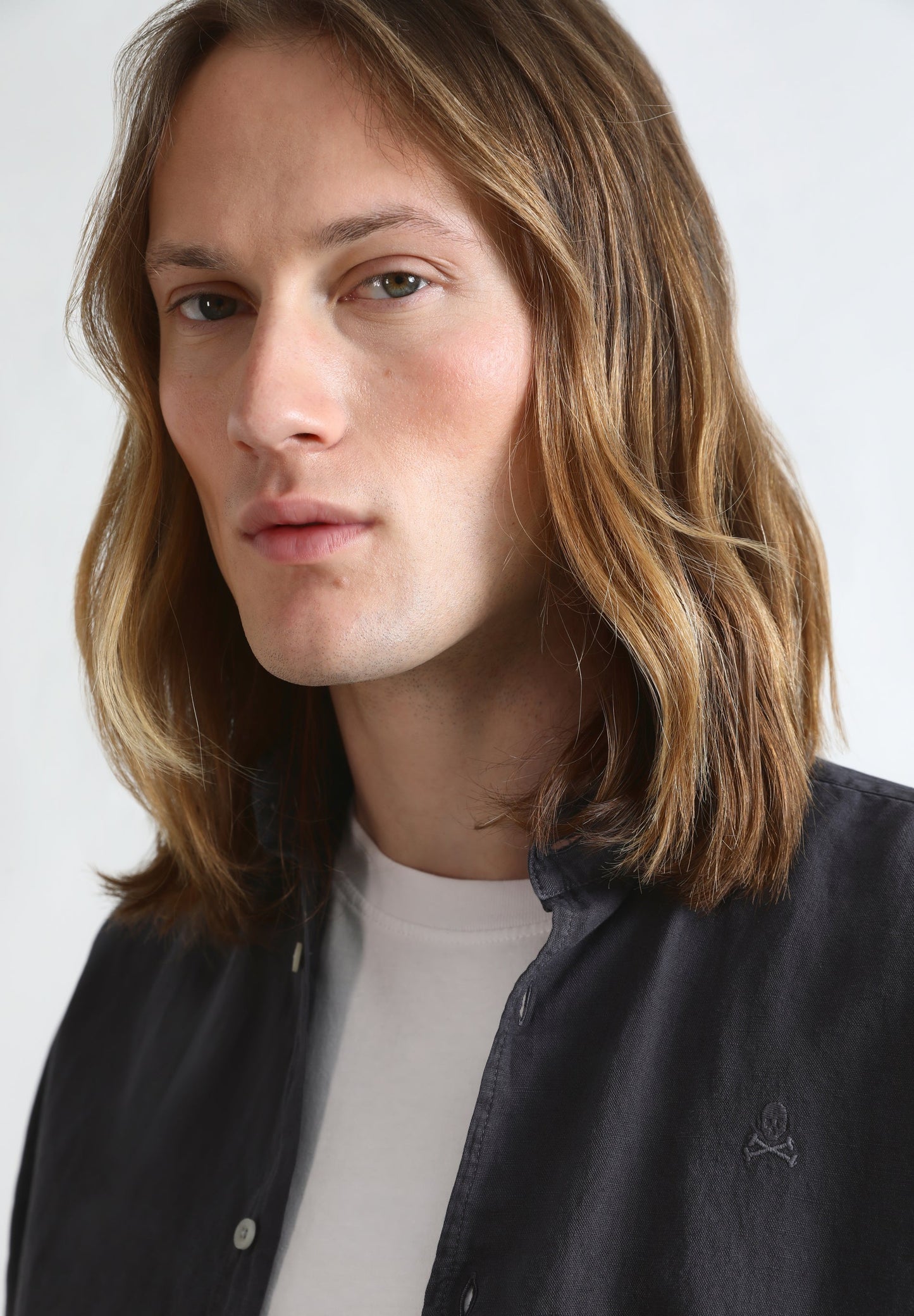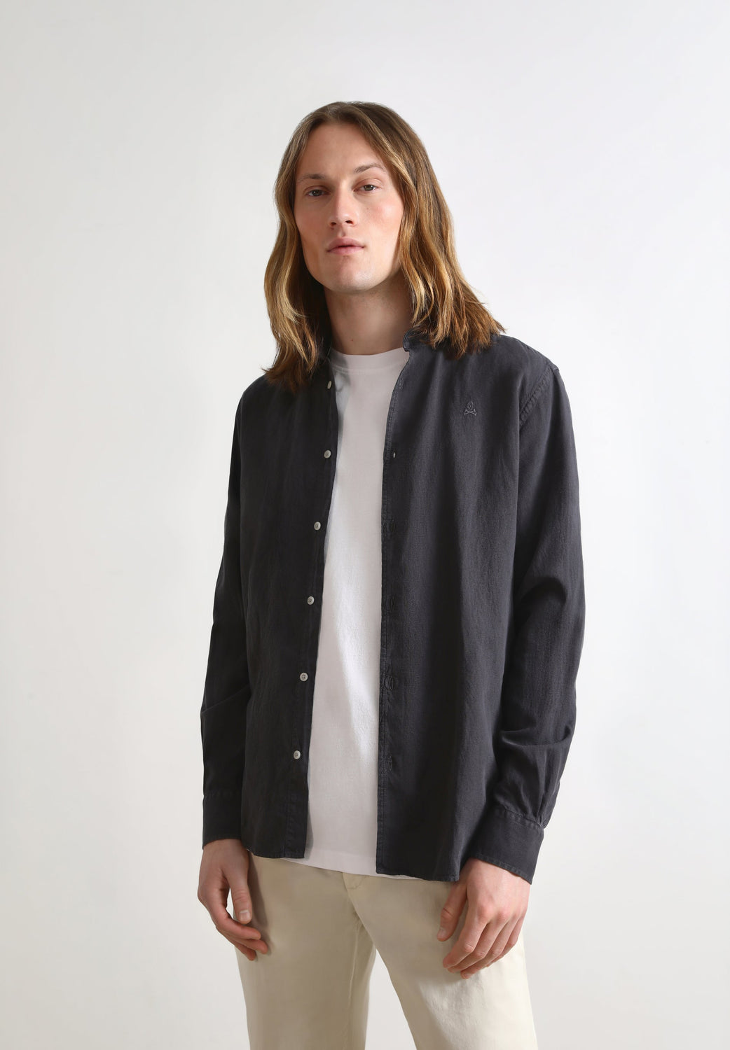 Camisa lino con calavera bordada a tono.