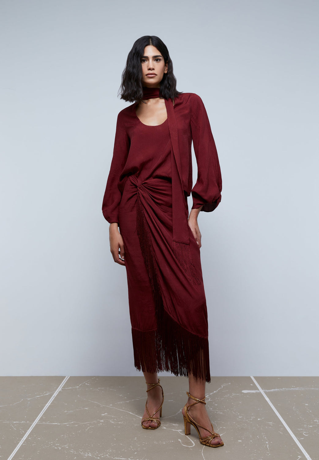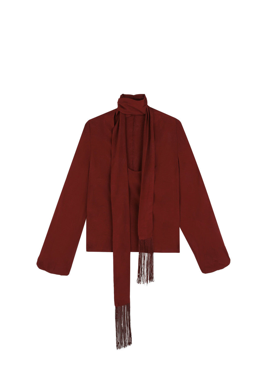 - Cuello redondo con lazada terminada en flecos
