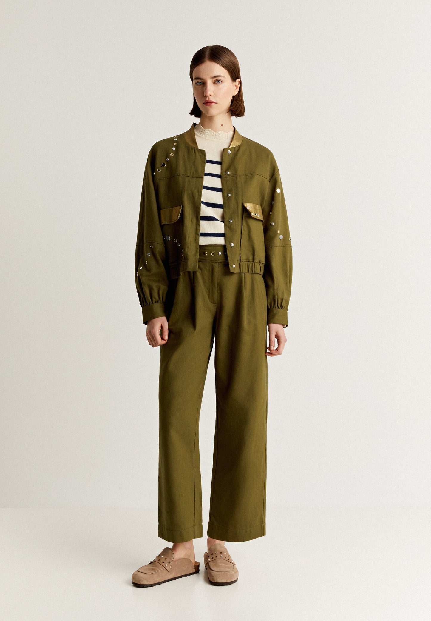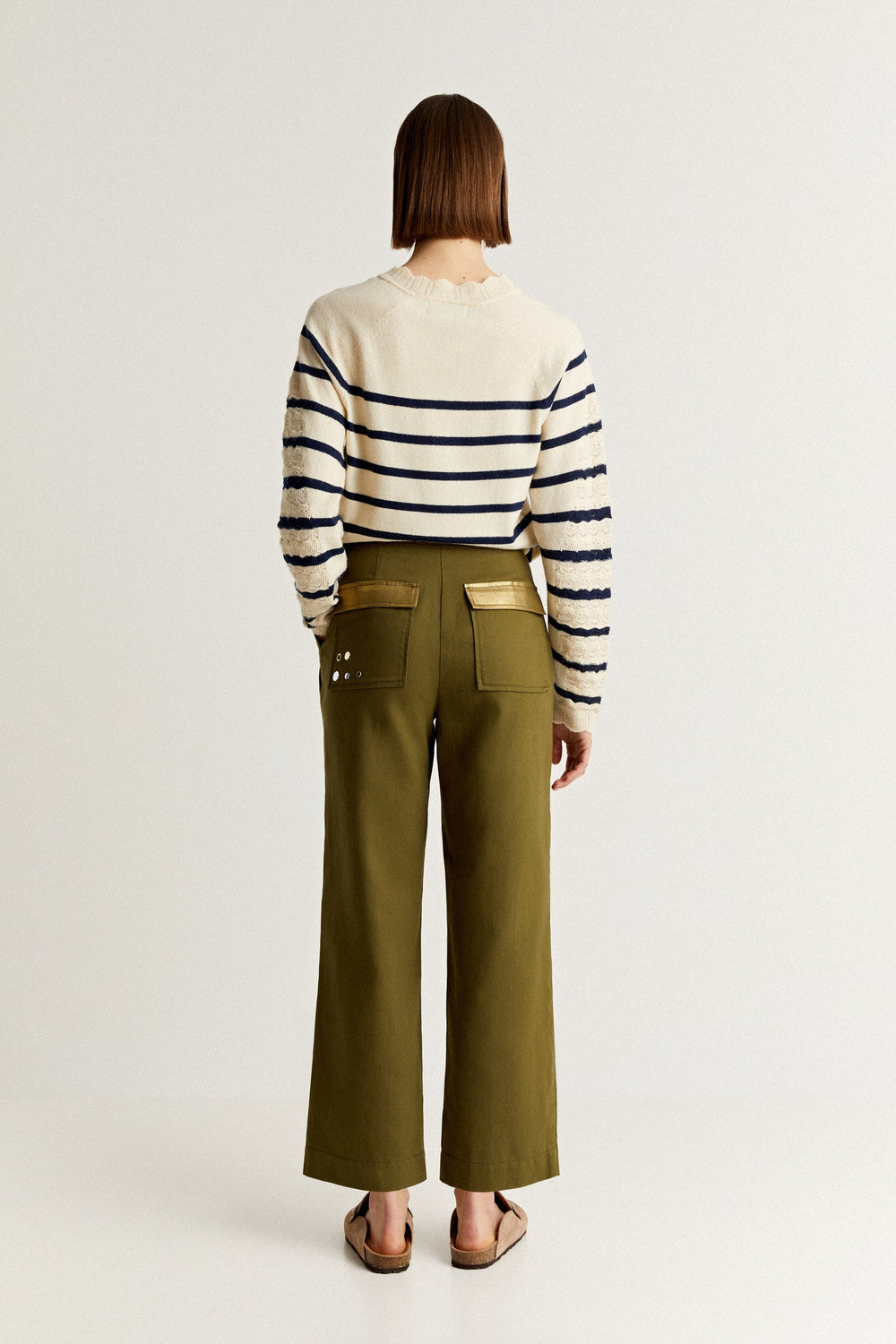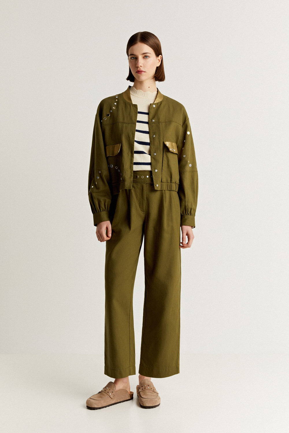 Pantalón rectos con pinzas y detalles de tachuelas.