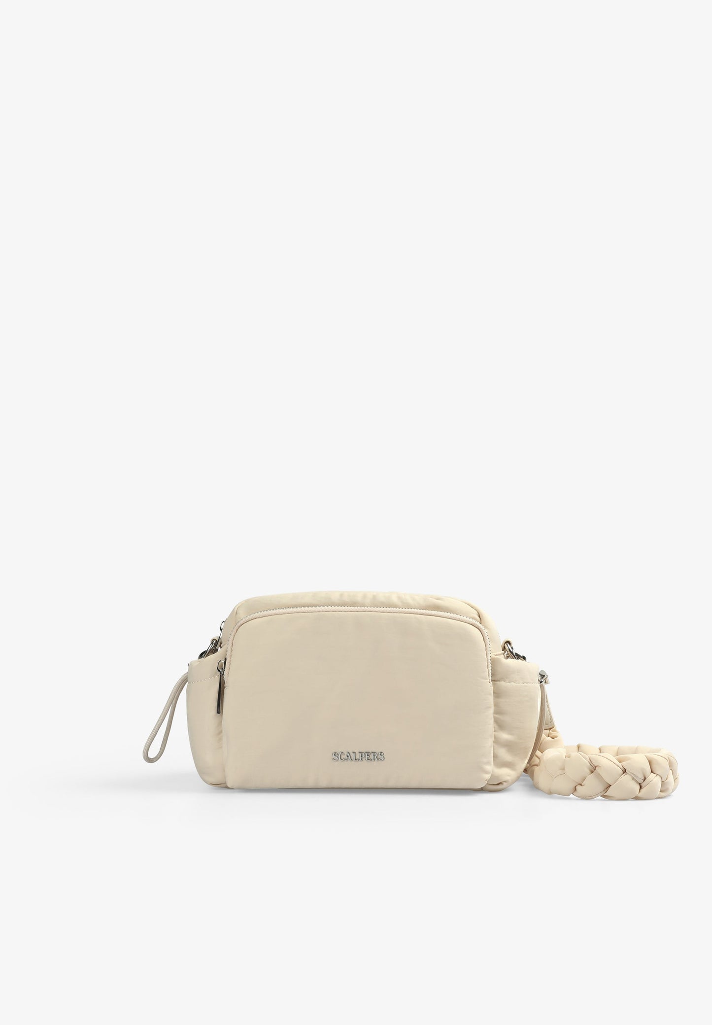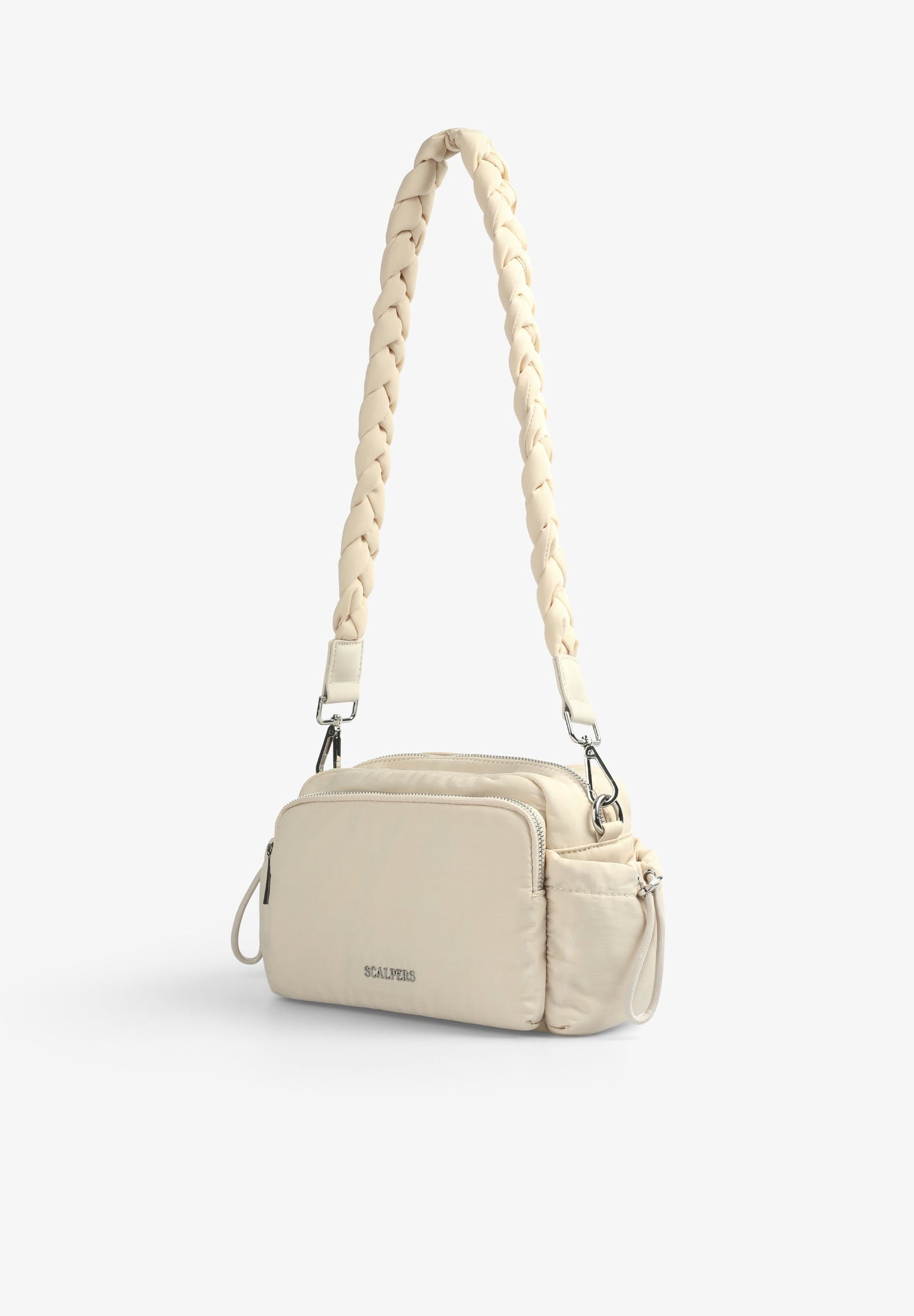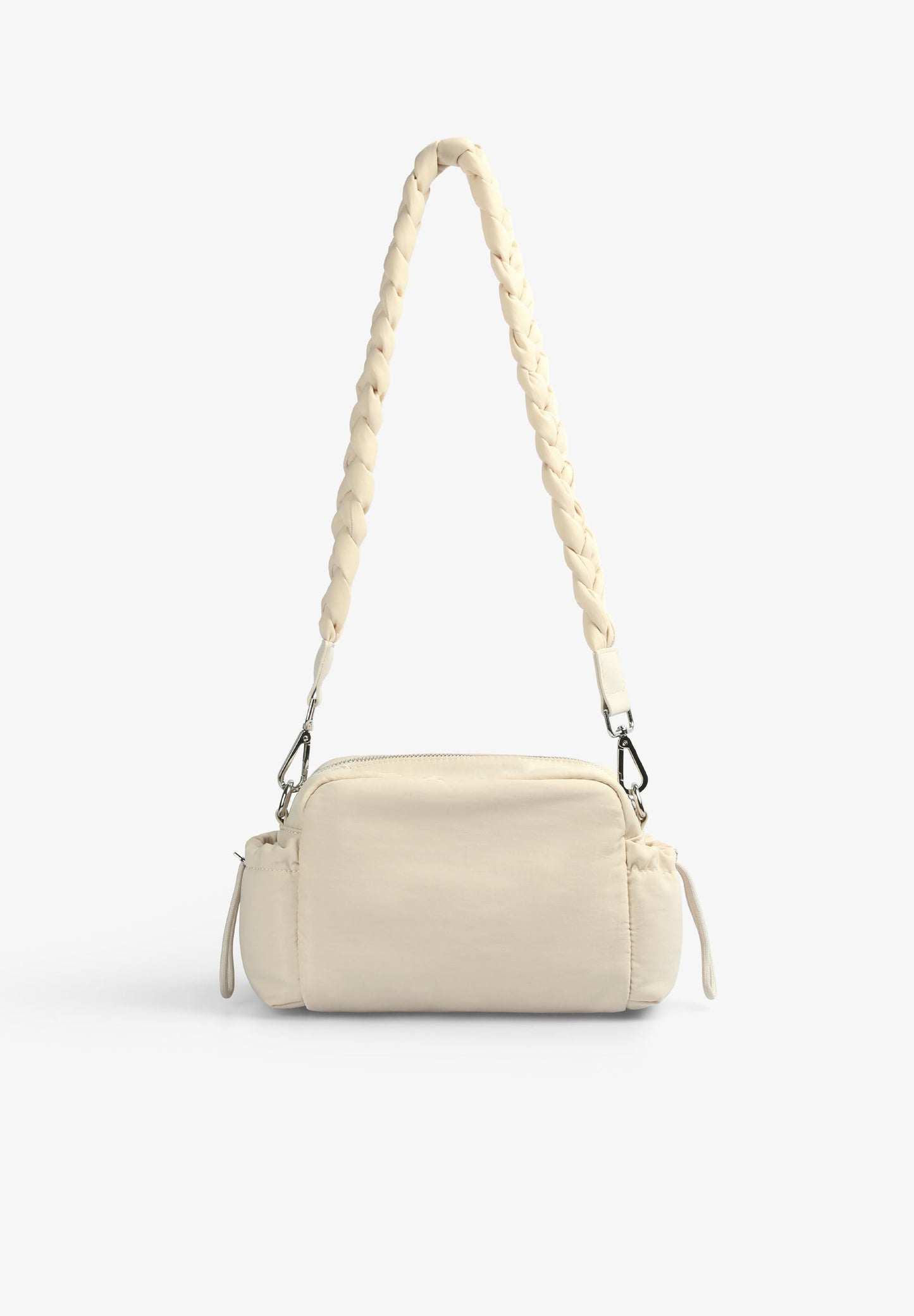 Bolso tipo bandolera con detalle de asa corta trenzada.