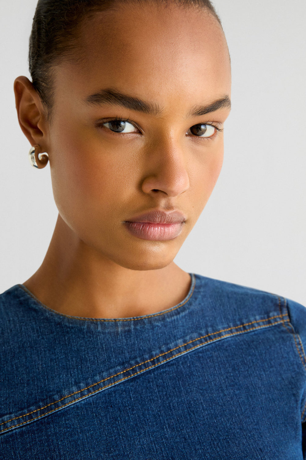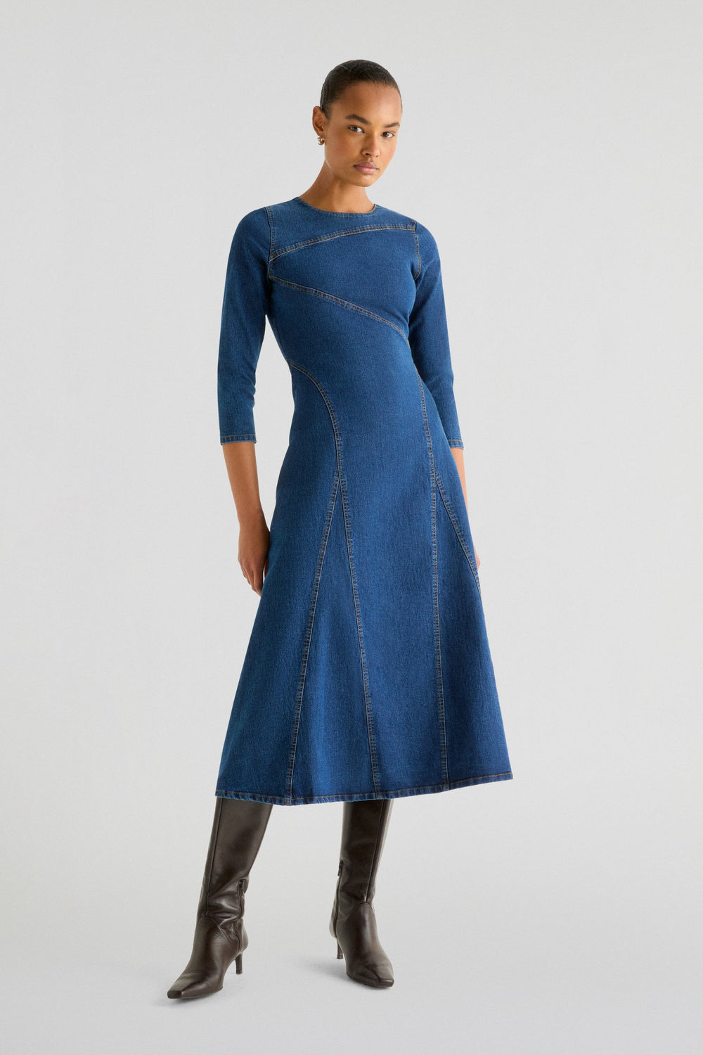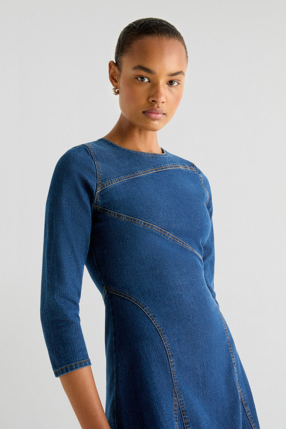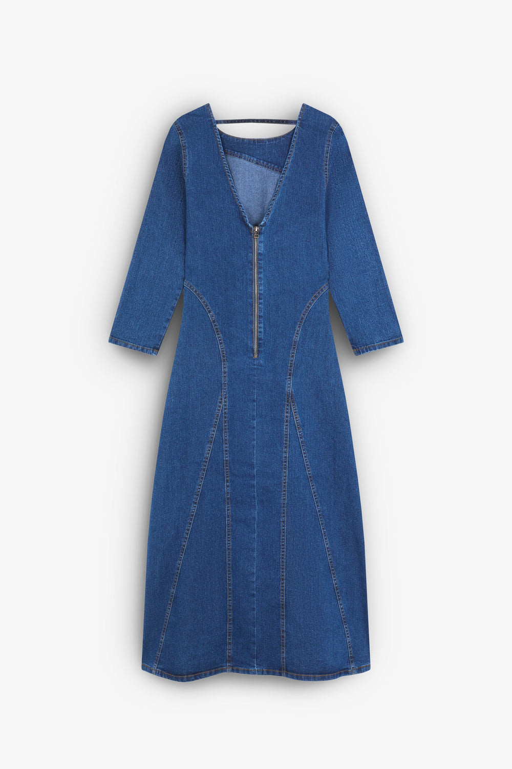 Vestido midi denim confeccionado en tejido de algodón. Regular fit, cuello redondo y cierre con cremallera trasera. Manga larga y escote bajo en espalda. Detalle de costuras.