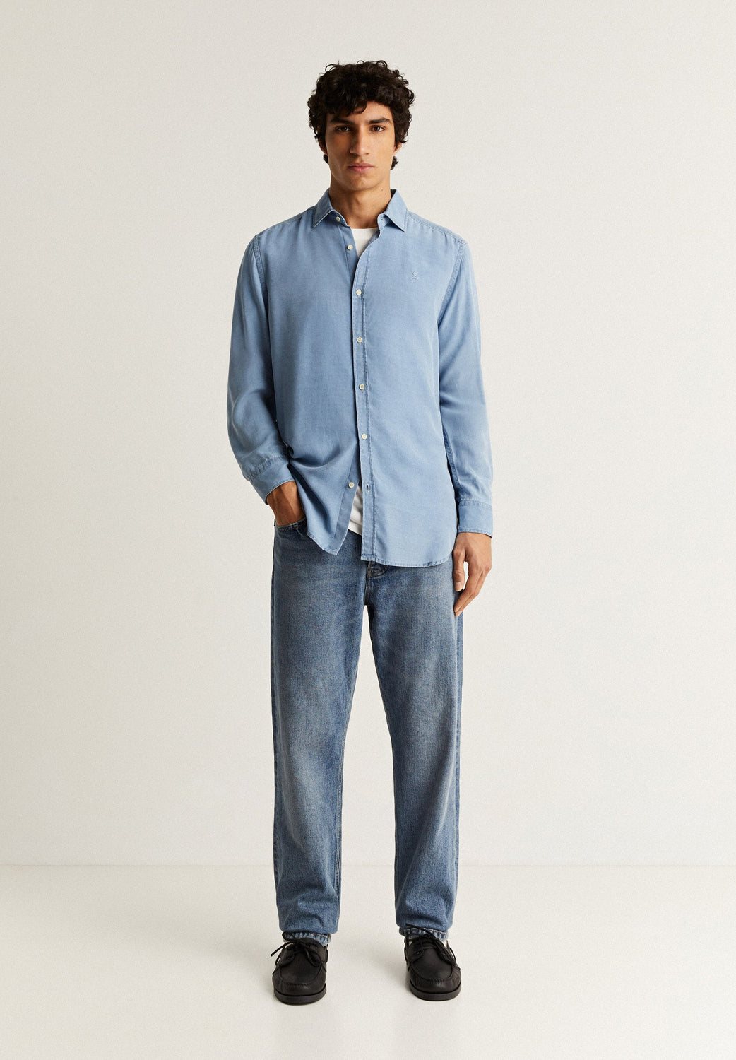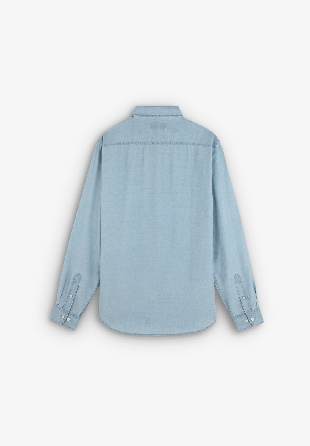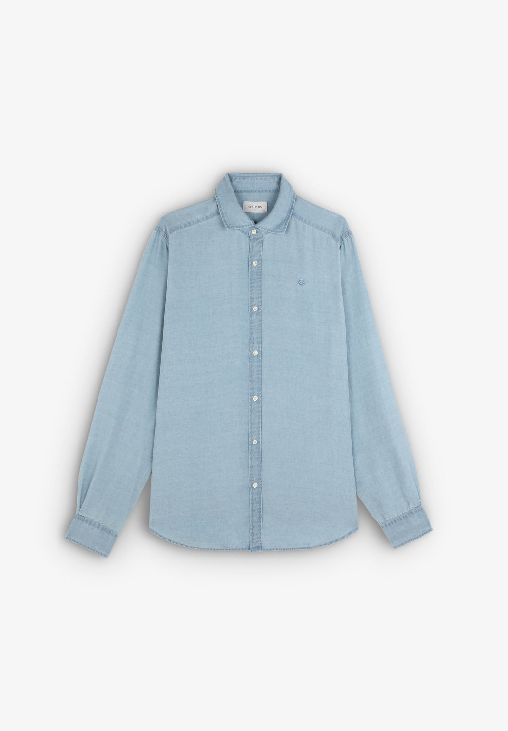 Camisa denim con detalle de calavera bordada a tono en pecho.