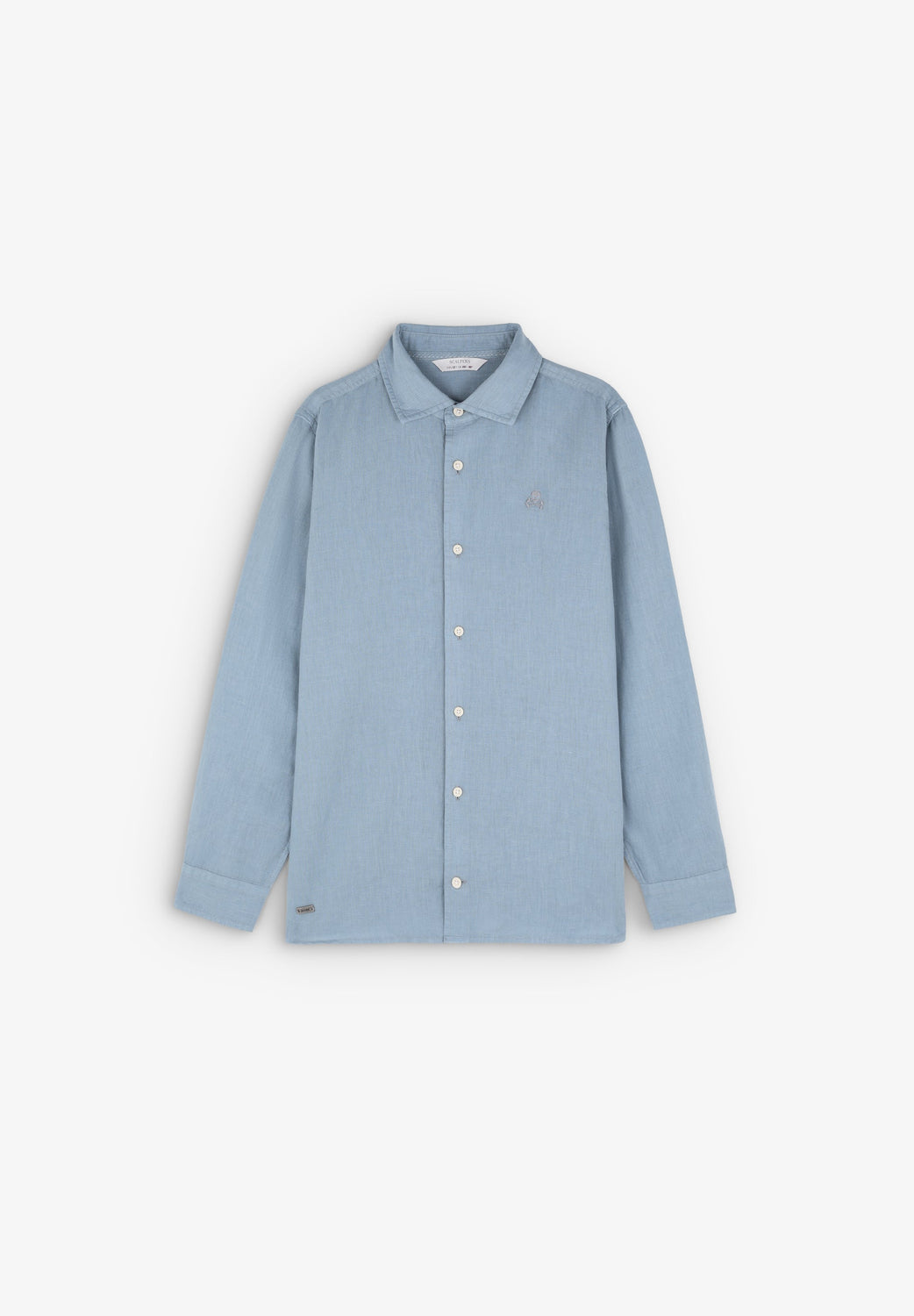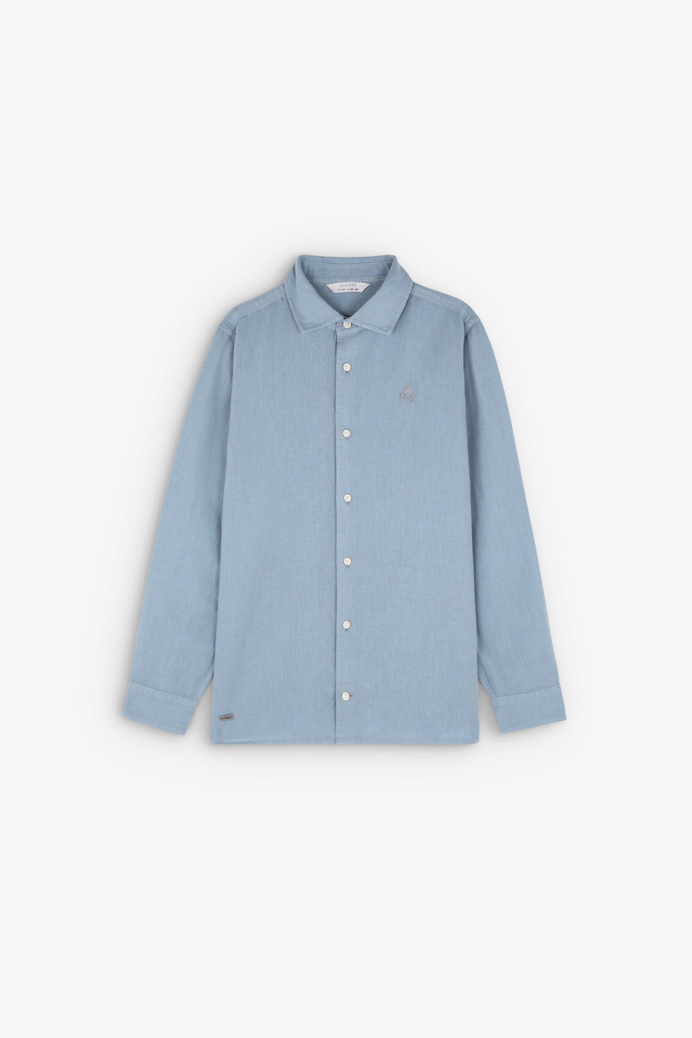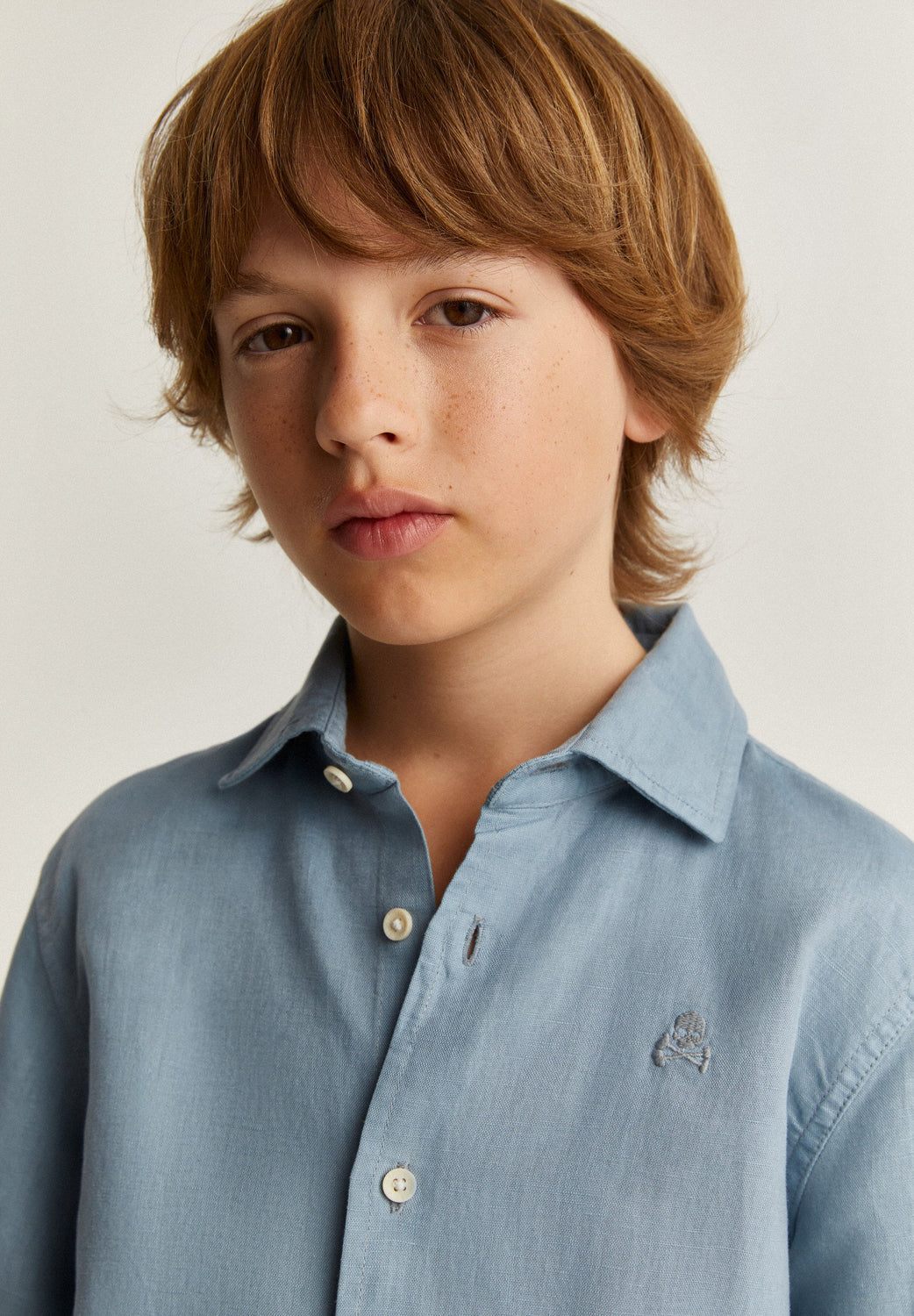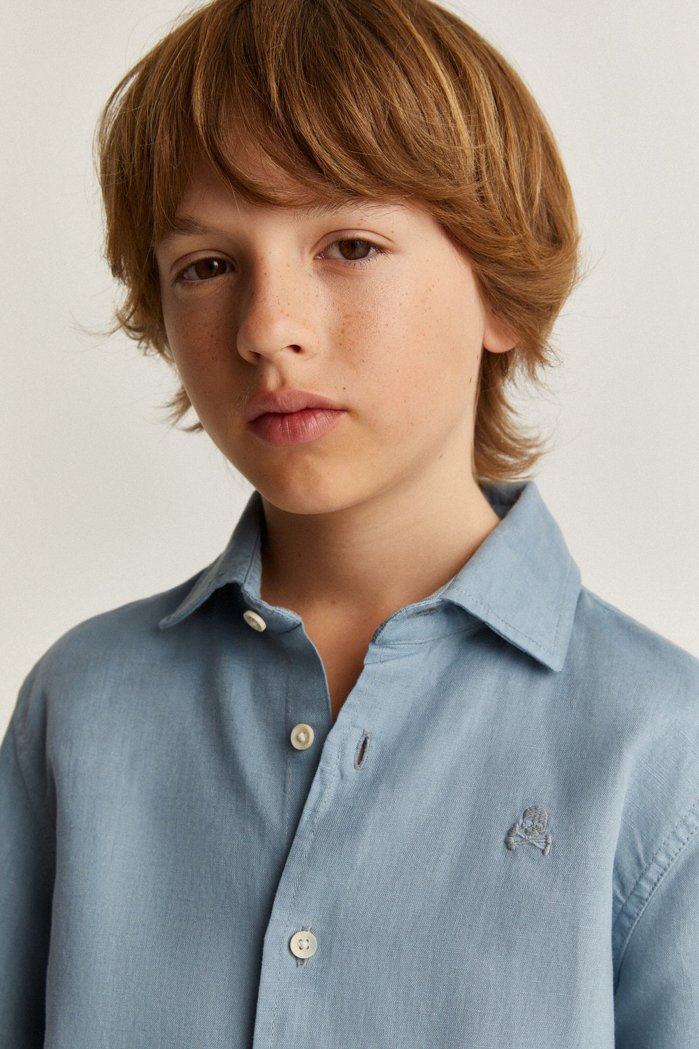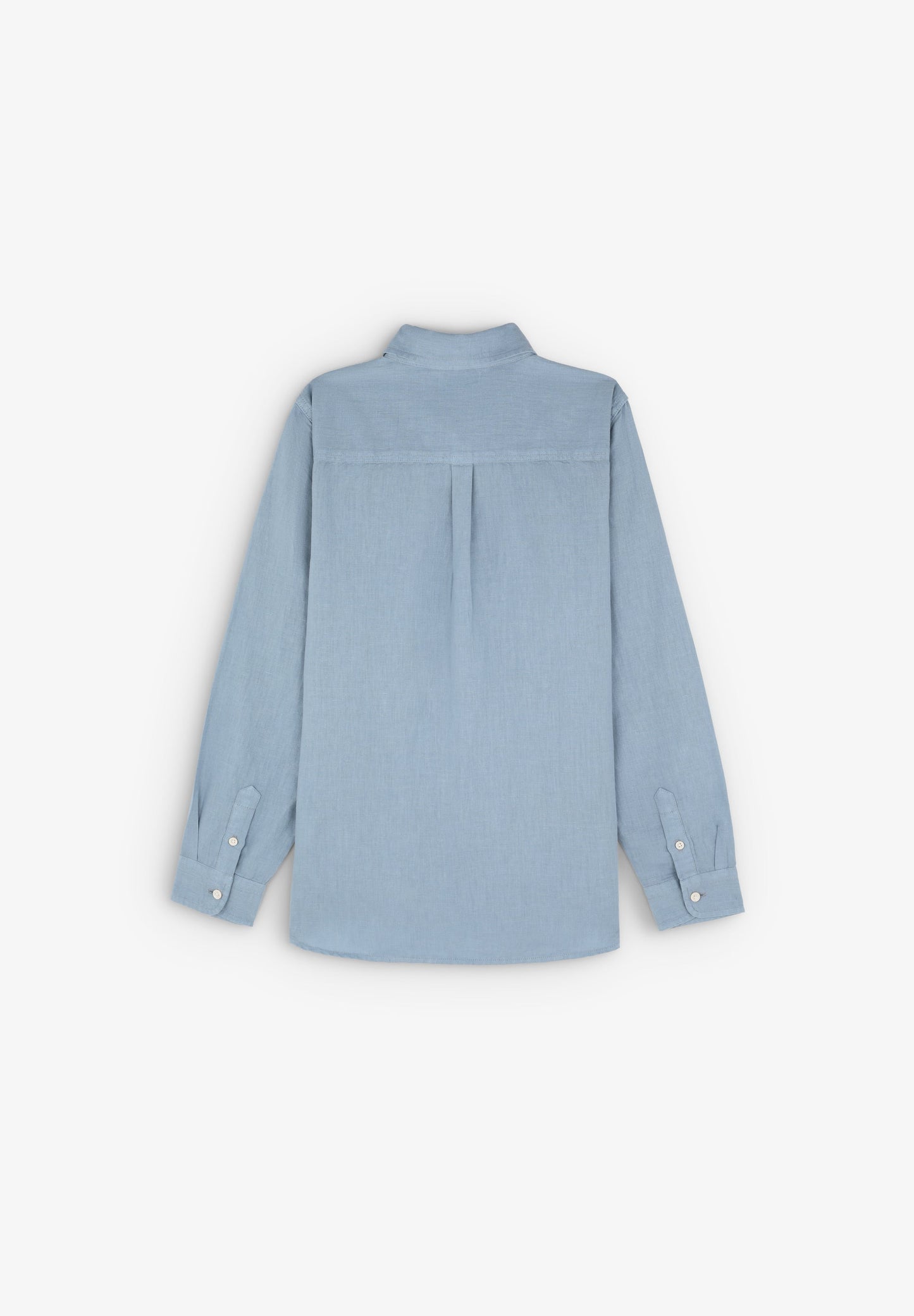 Camisa con detalle de calavera bordada a tono en pecho. Confeccionada en mezcla de algodón y lino. Corte Regular fit. Cuello clásico. Cierre frontal con botones. Manga larga terminada en puño con botones. Tablón trasero.