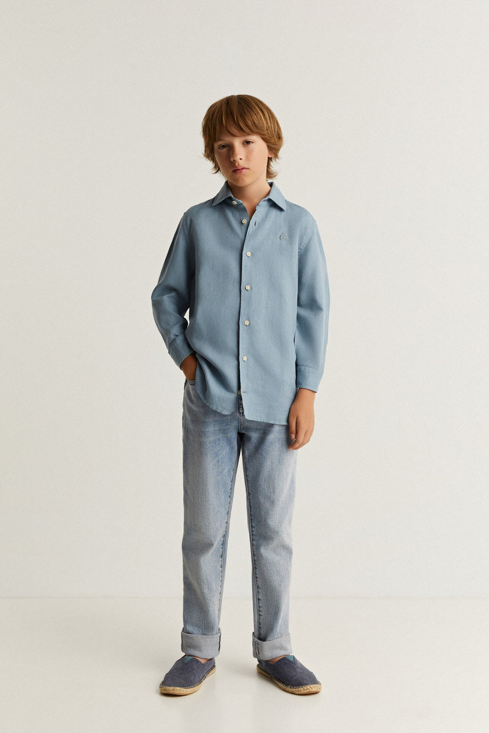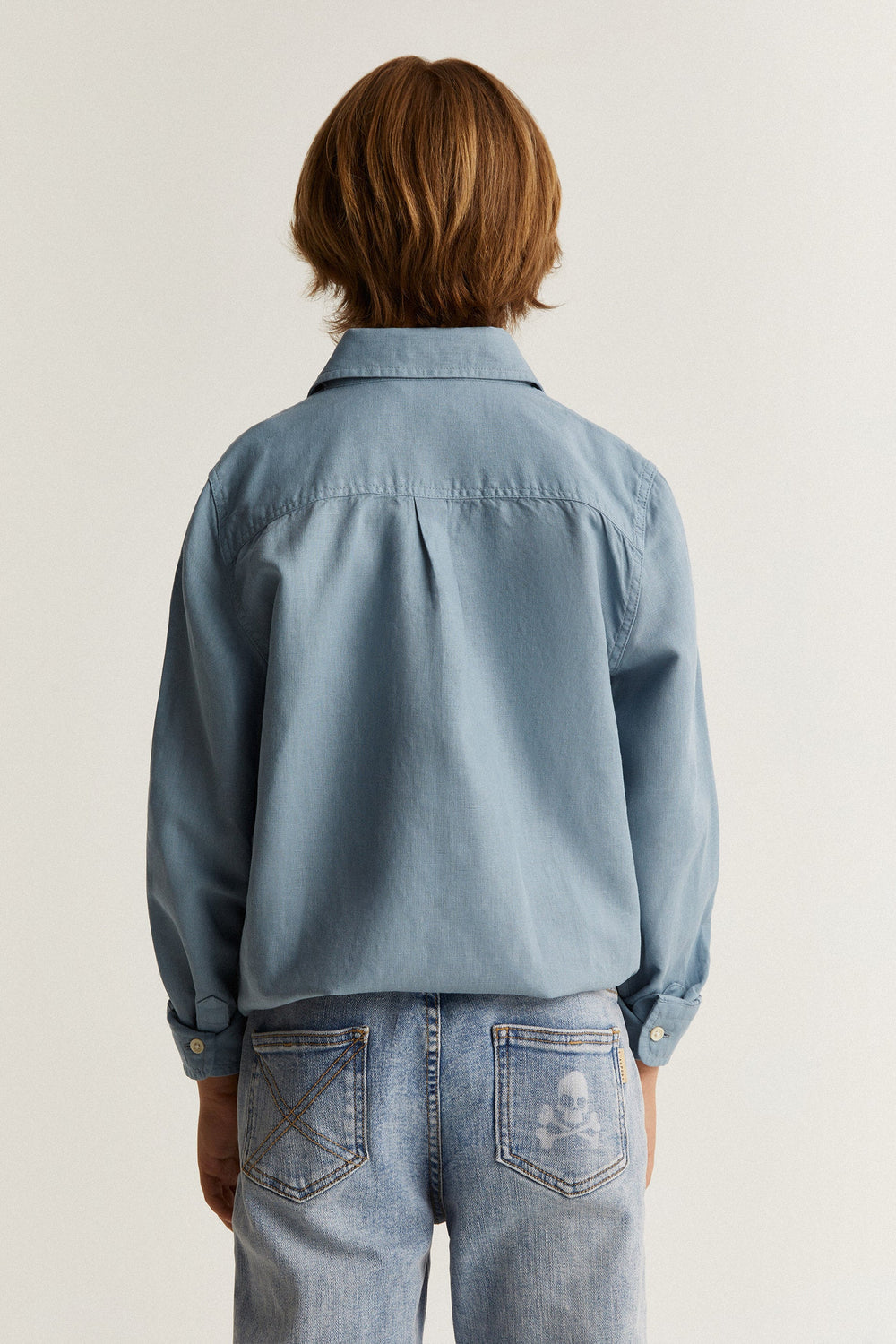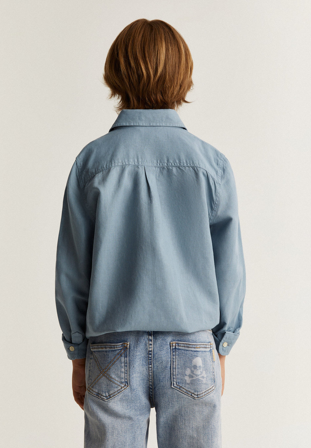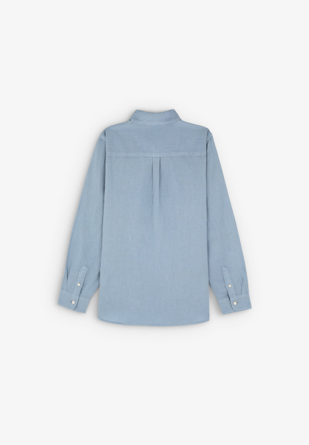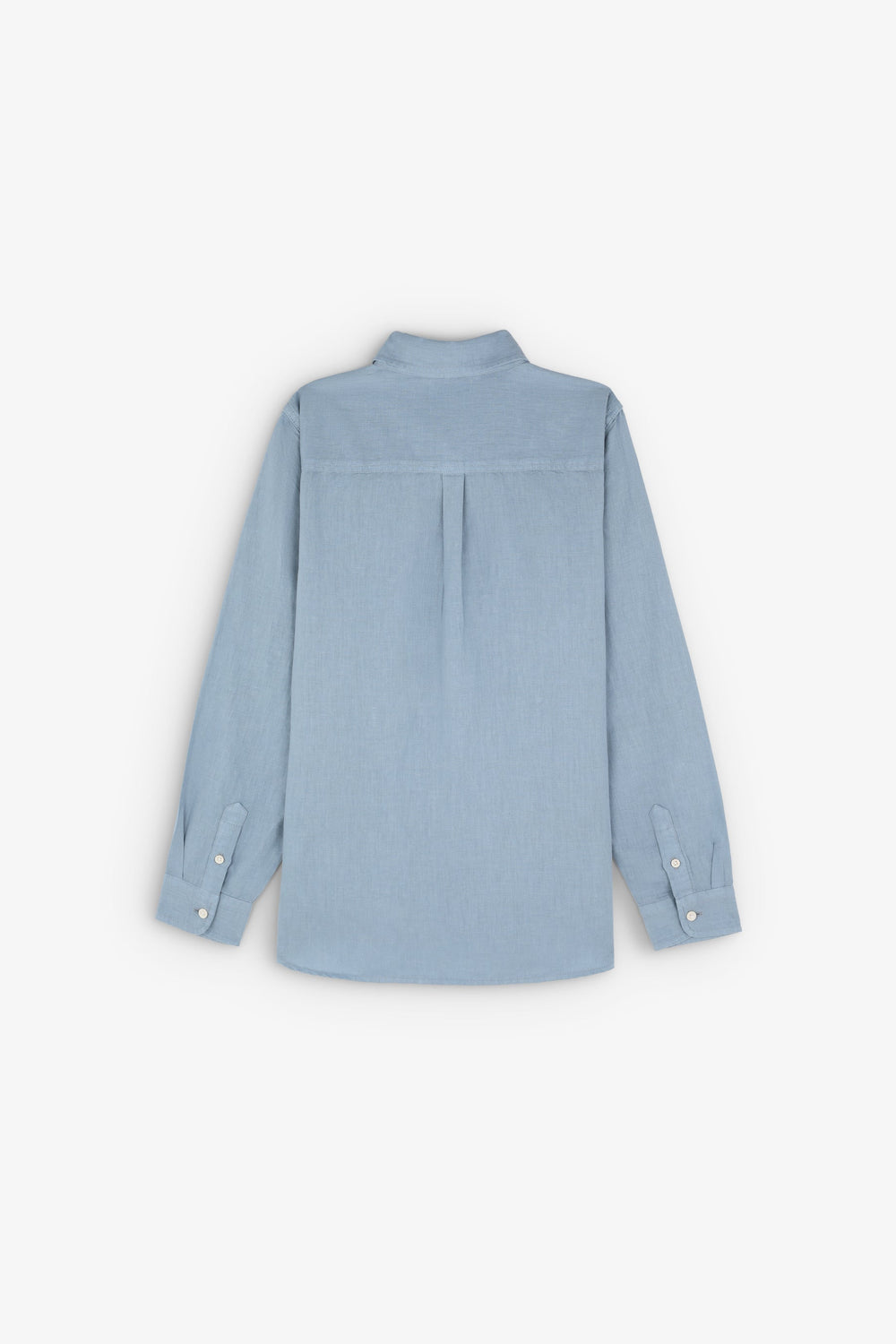 Camisa con detalle de calavera bordada a tono en pecho. Confeccionada en mezcla de algodón y lino. Corte Regular fit. Cuello clásico. Cierre frontal con botones. Manga larga terminada en puño con botones. Tablón trasero.