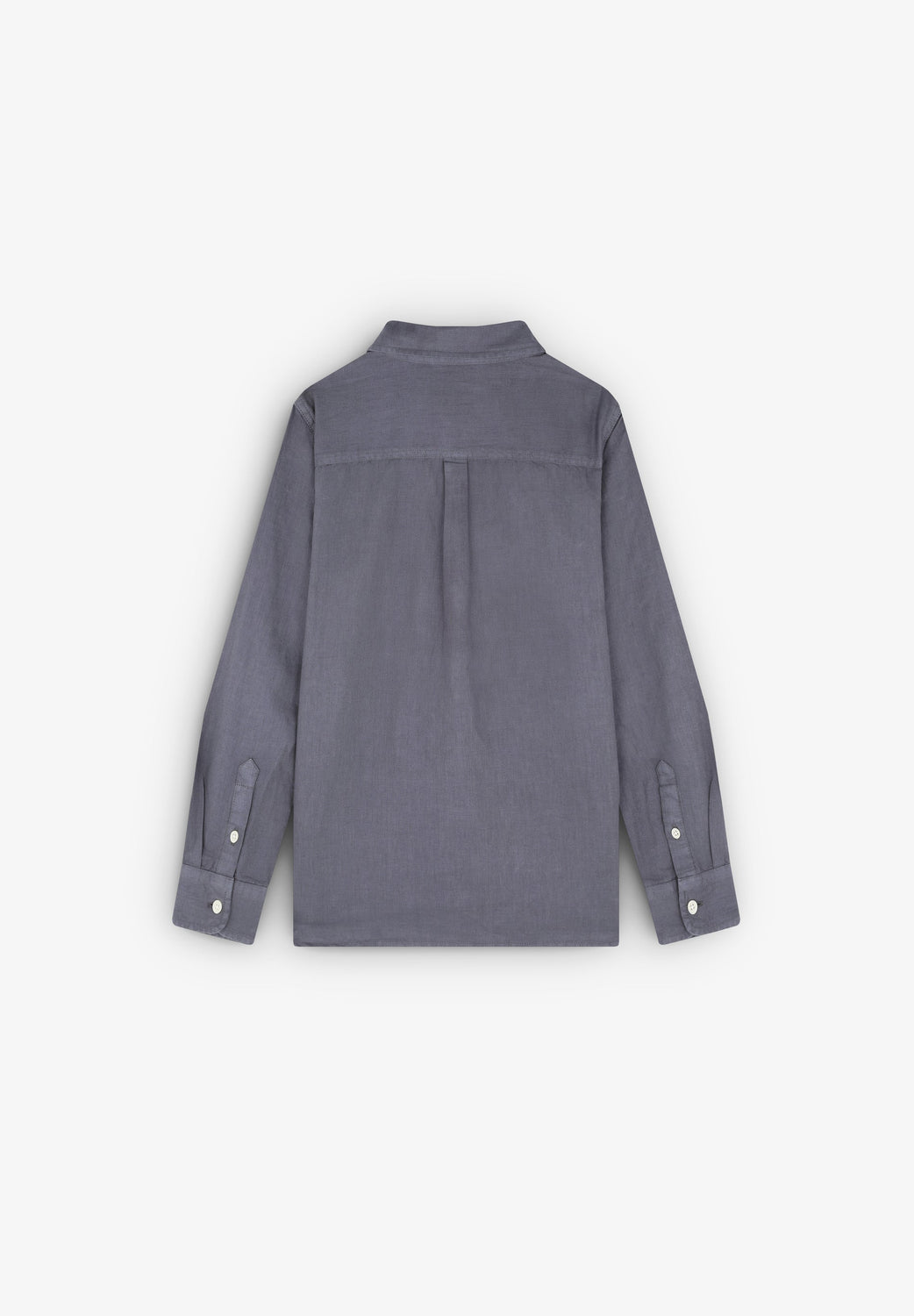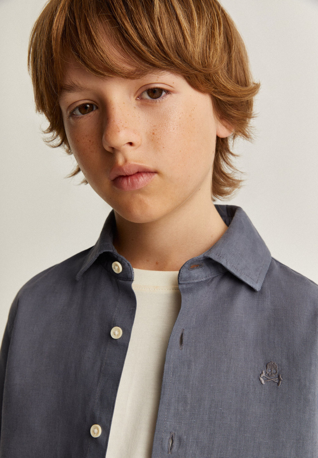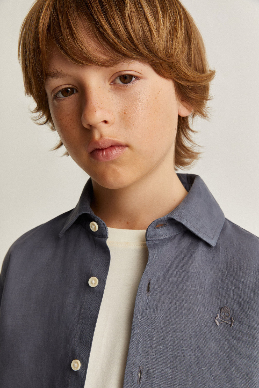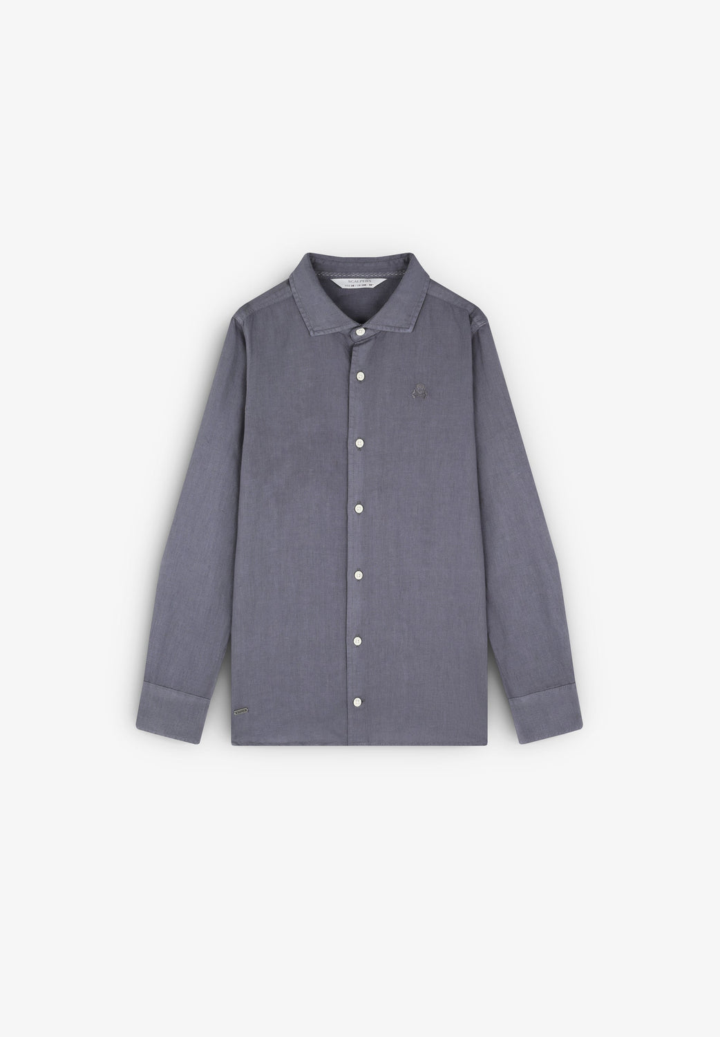 Camisa con detalle de calavera bordada a tono en pecho. Confeccionada en mezcla de algodón y lino. Corte Regular fit. Cuello clásico. Cierre frontal con botones. Manga larga terminada en puño con botones. Tablón trasero.