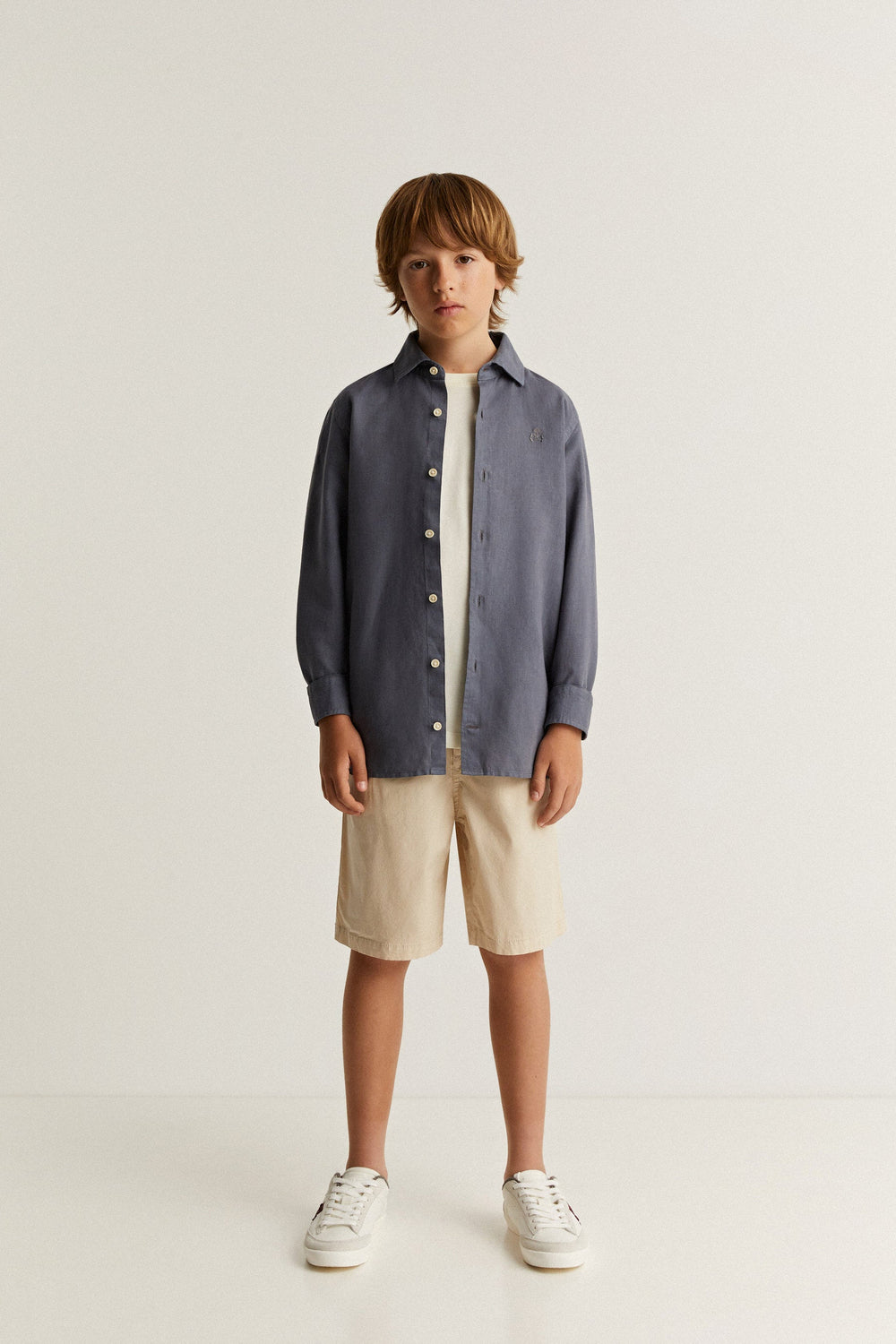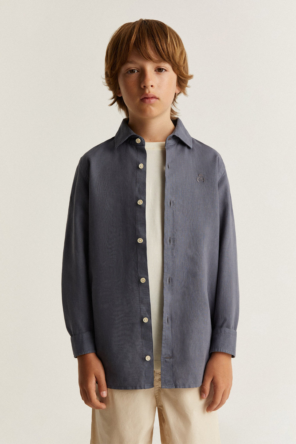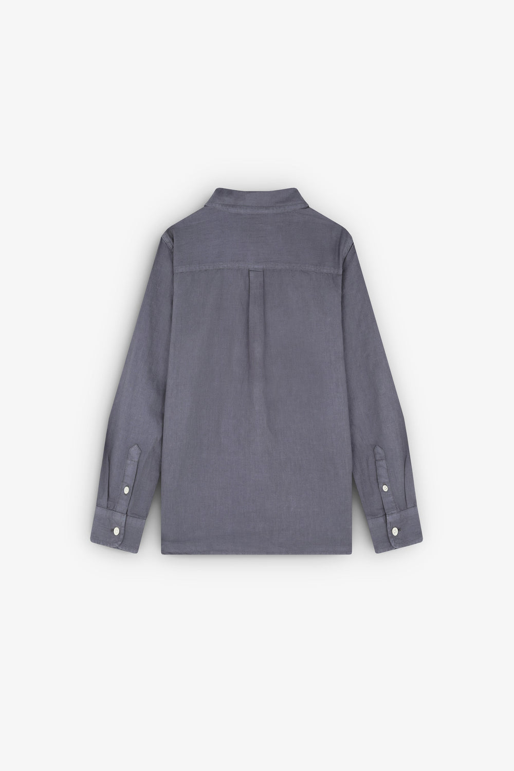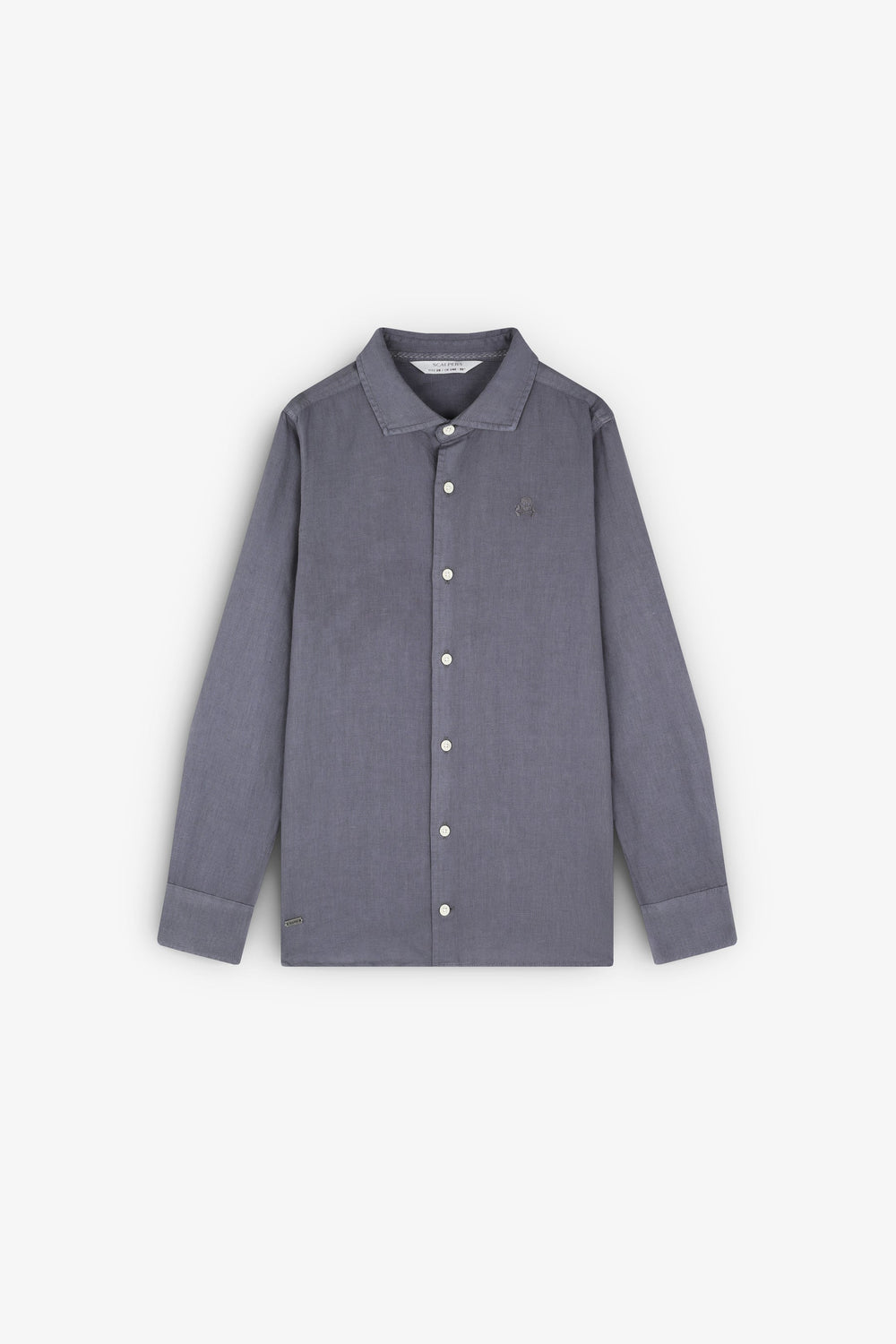Camisa con detalle de calavera bordada a tono en pecho. Confeccionada en mezcla de algodón y lino. Corte Regular fit. Cuello clásico. Cierre frontal con botones. Manga larga terminada en puño con botones. Tablón trasero.