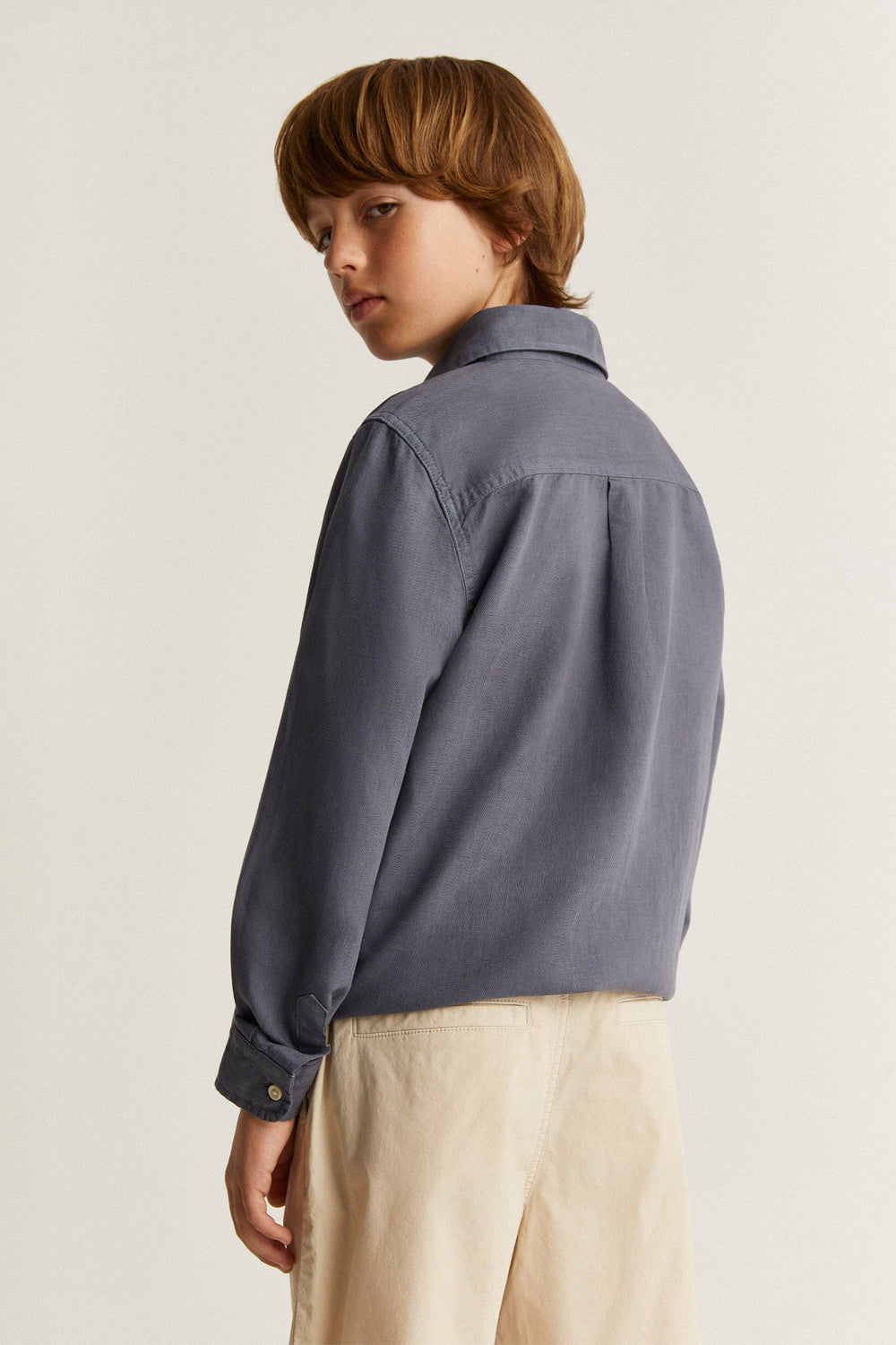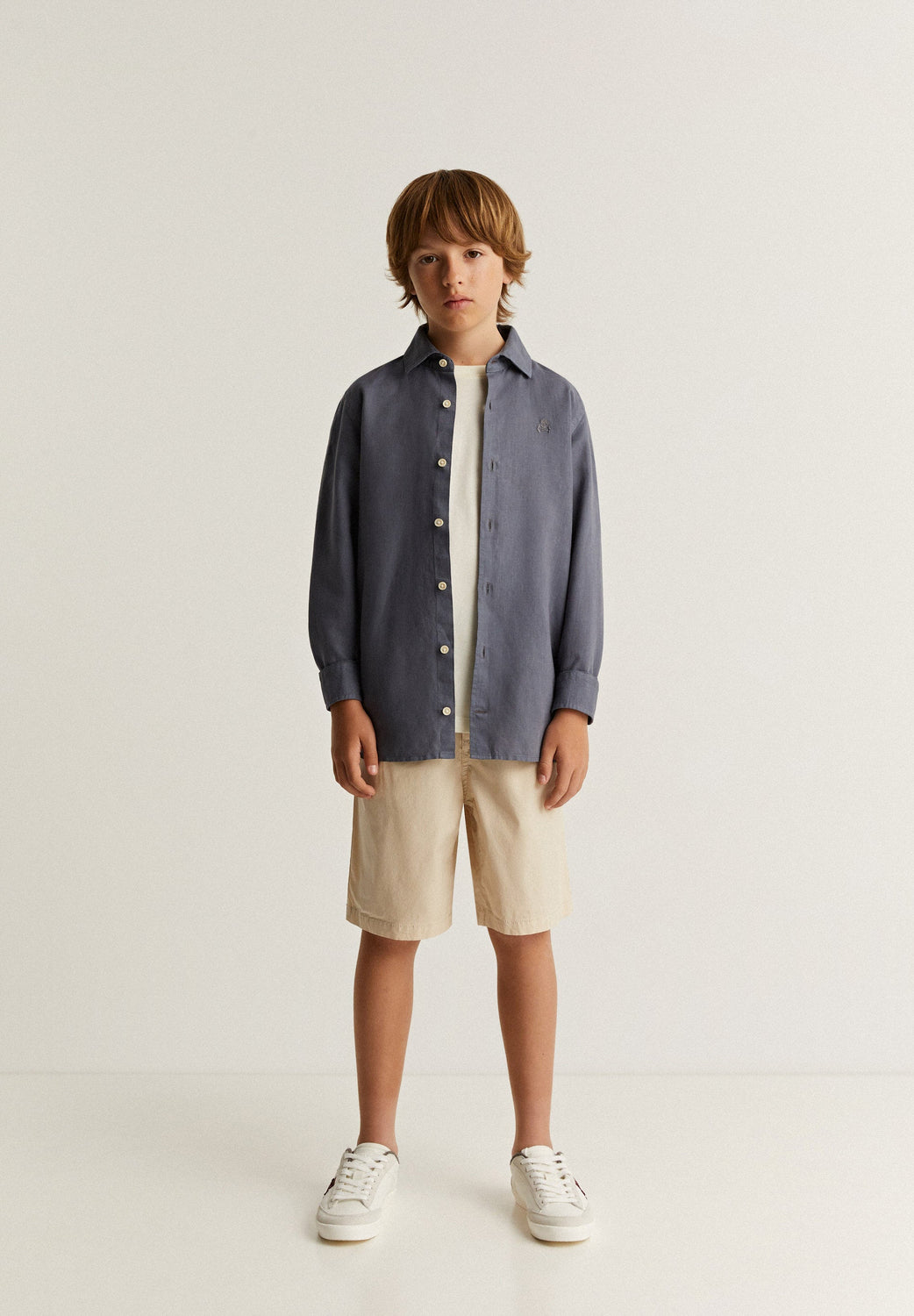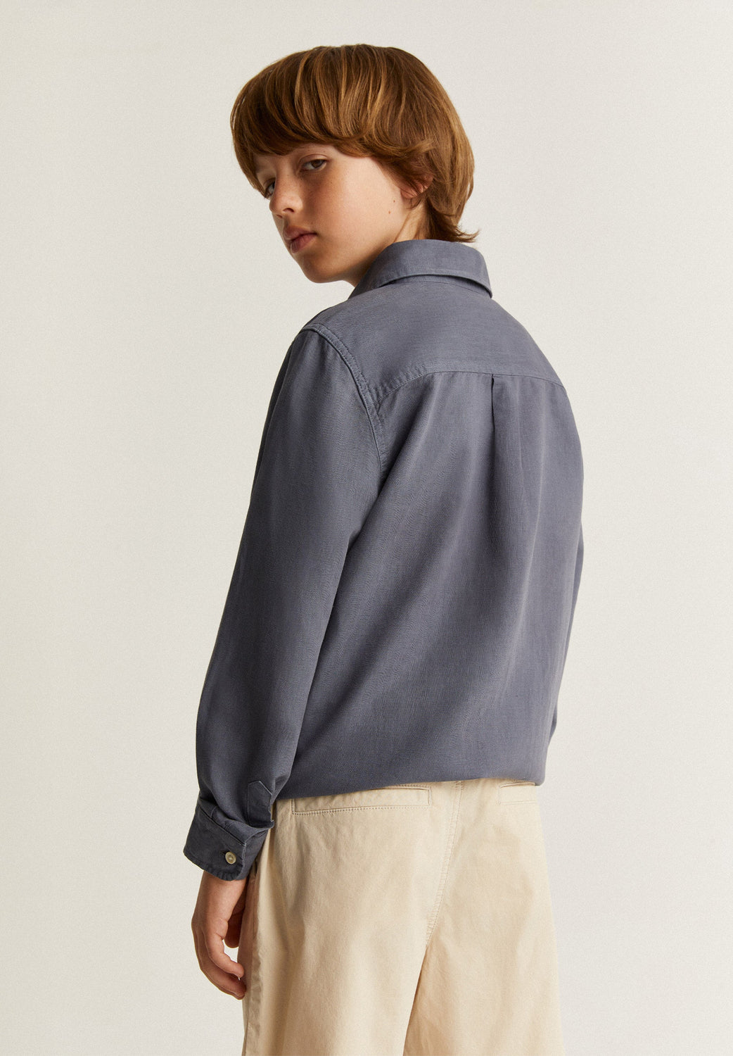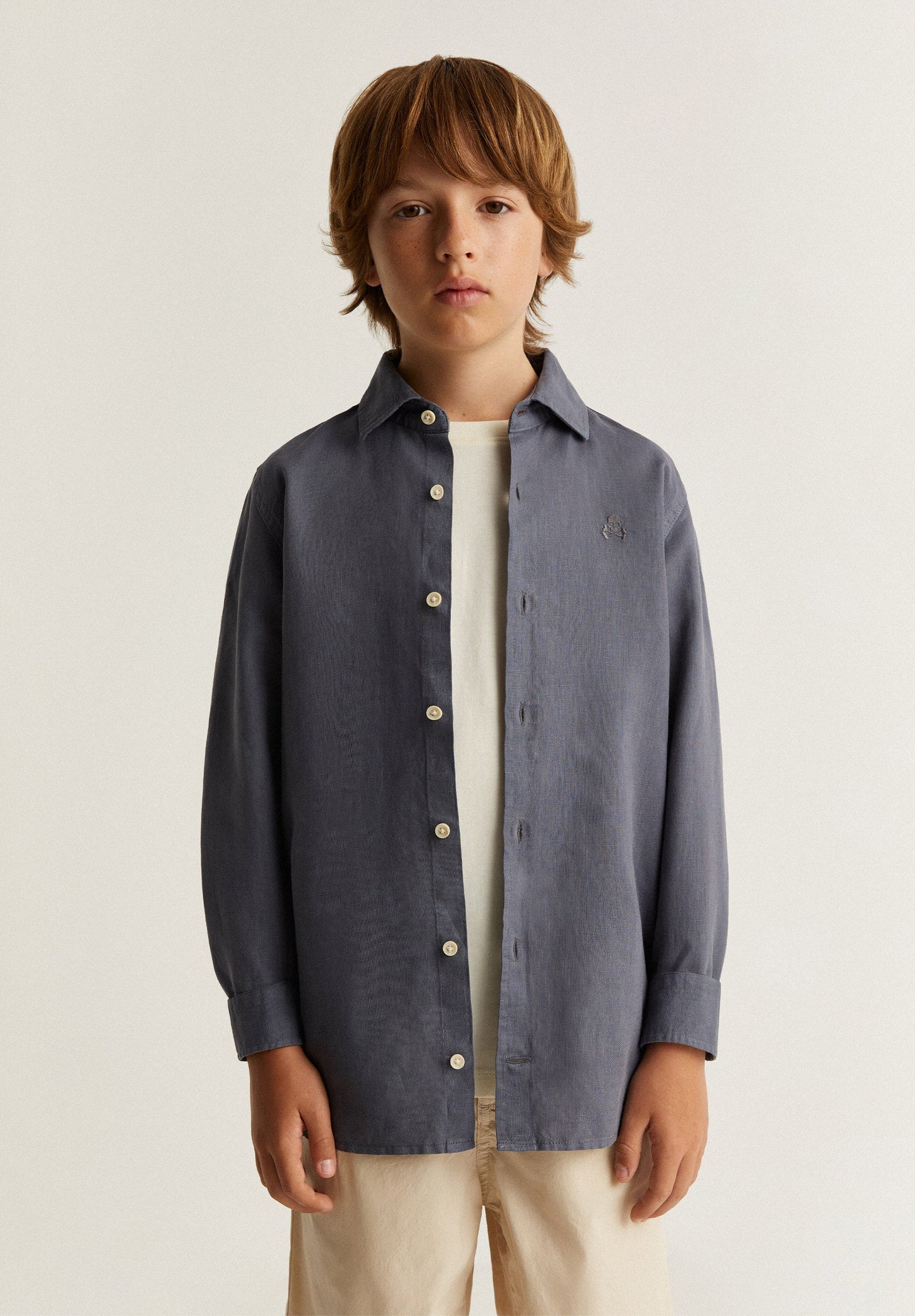 Camisa con detalle de calavera bordada a tono en pecho. Confeccionada en mezcla de algodón y lino. Corte Regular fit. Cuello clásico. Cierre frontal con botones. Manga larga terminada en puño con botones. Tablón trasero.