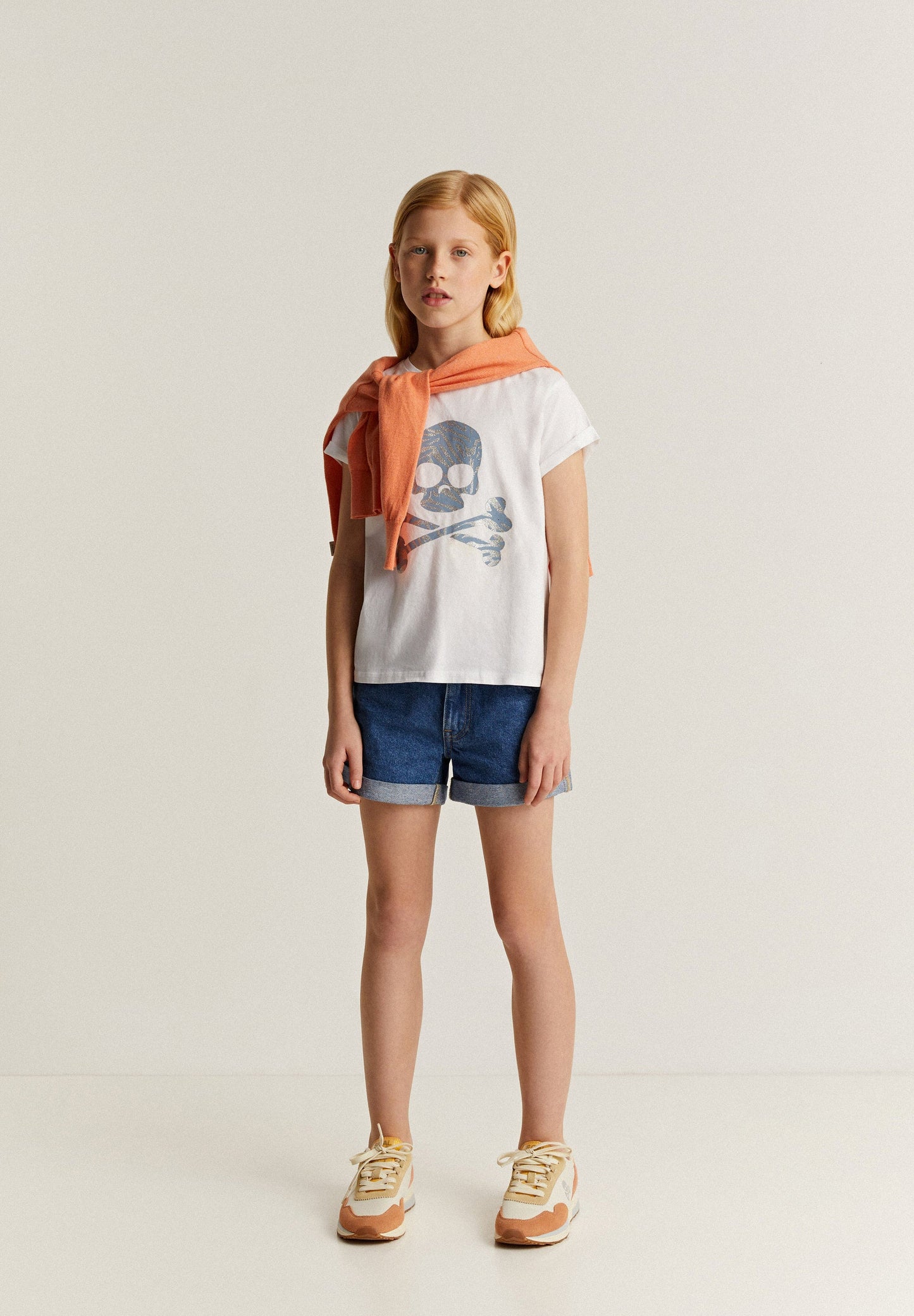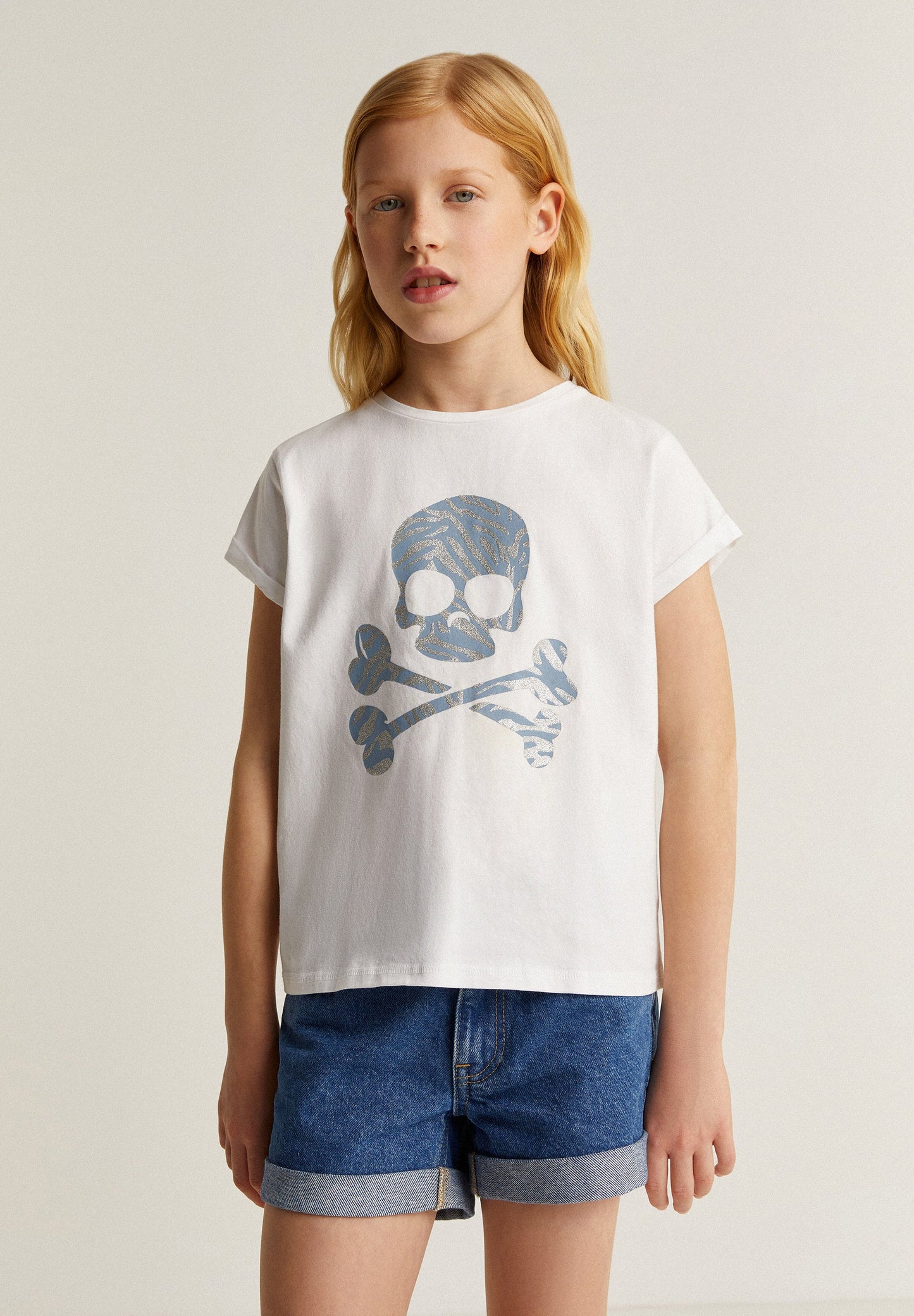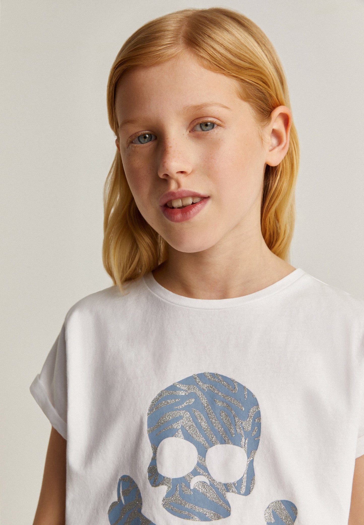Camiseta con calavera frontal en animal print con detalles en glitter.