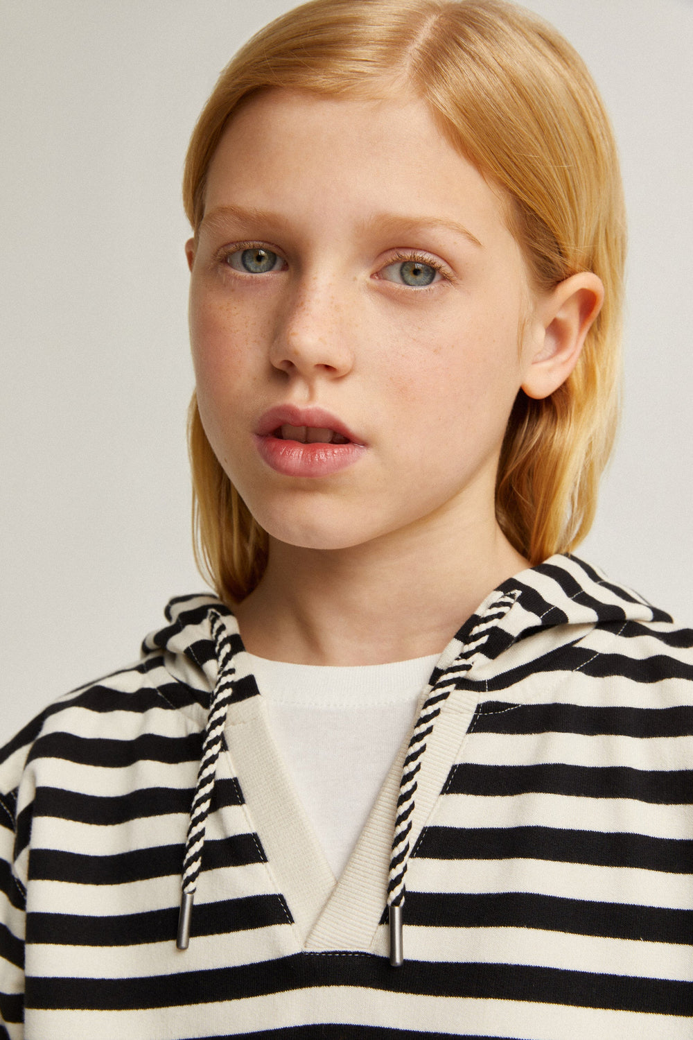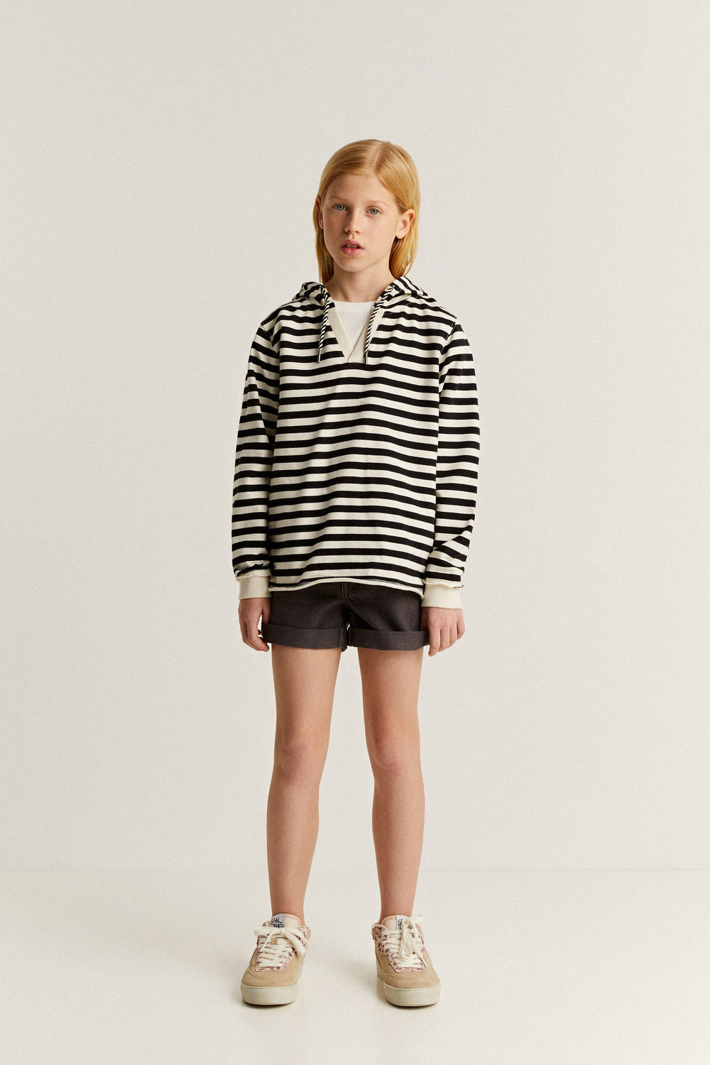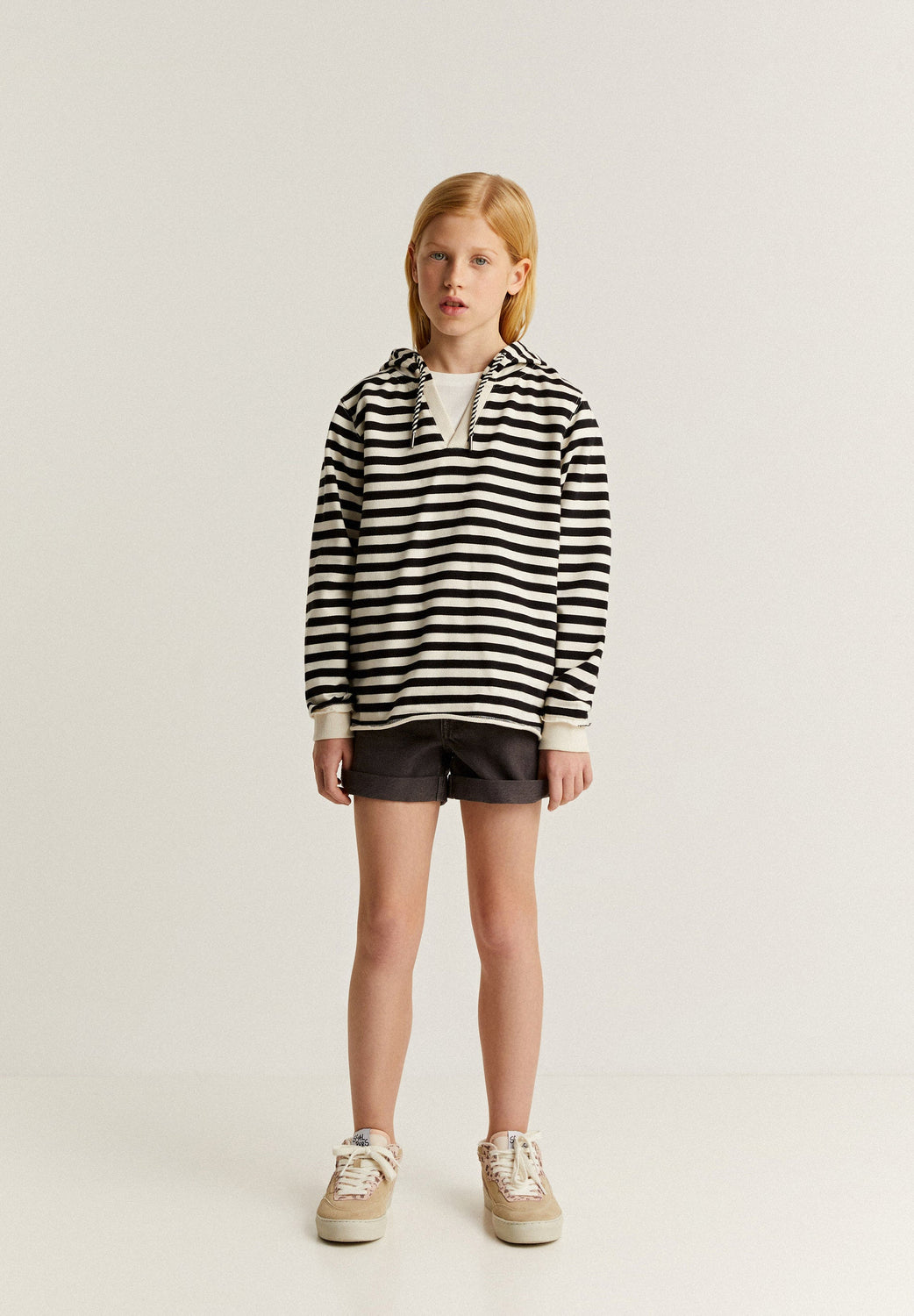 - Cuello de pico con capucha y cordón decorativo bicolor