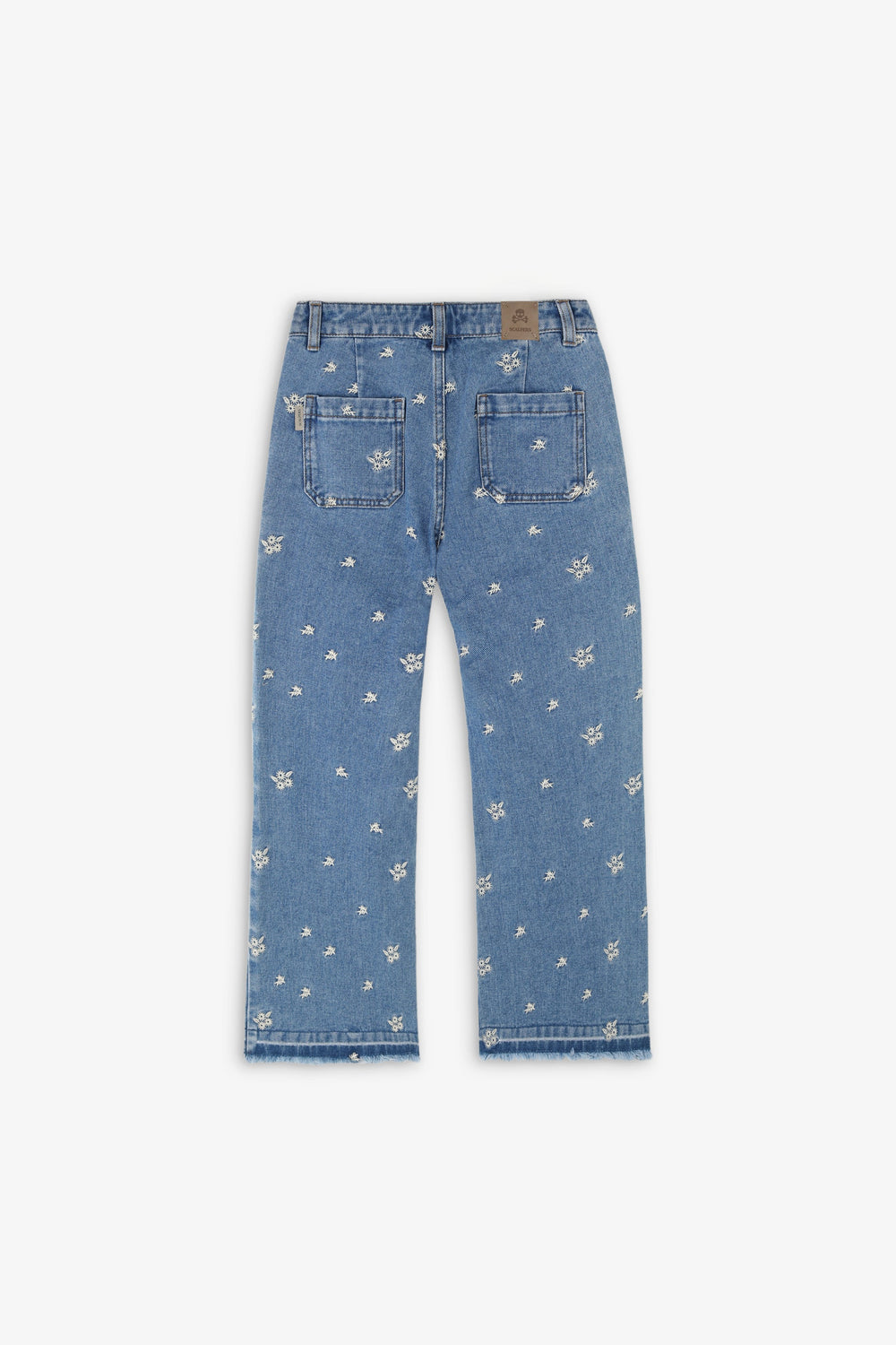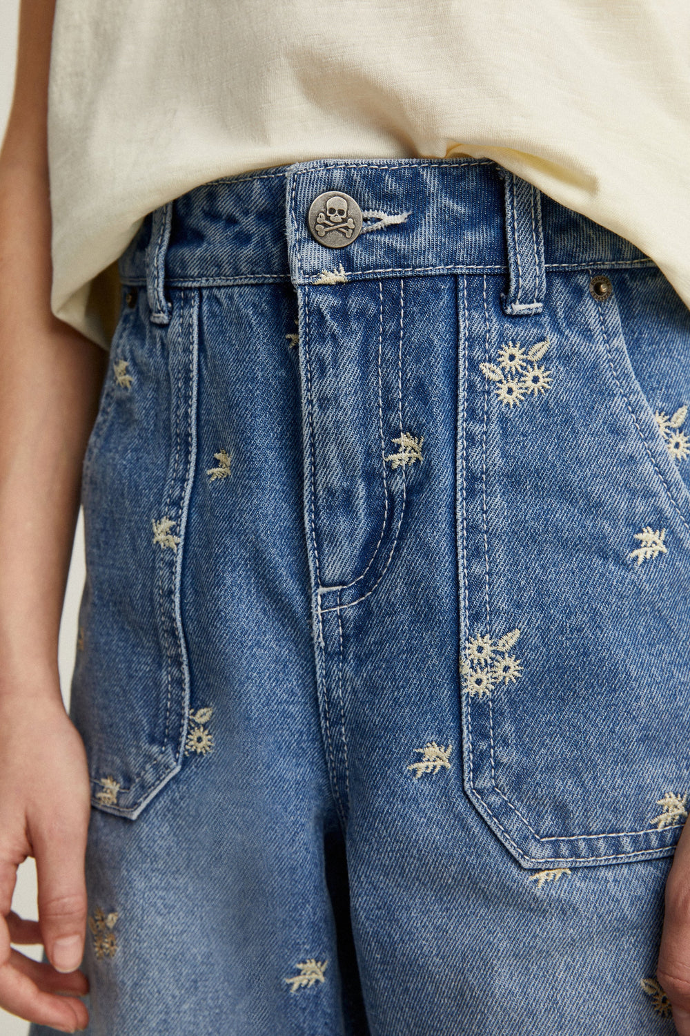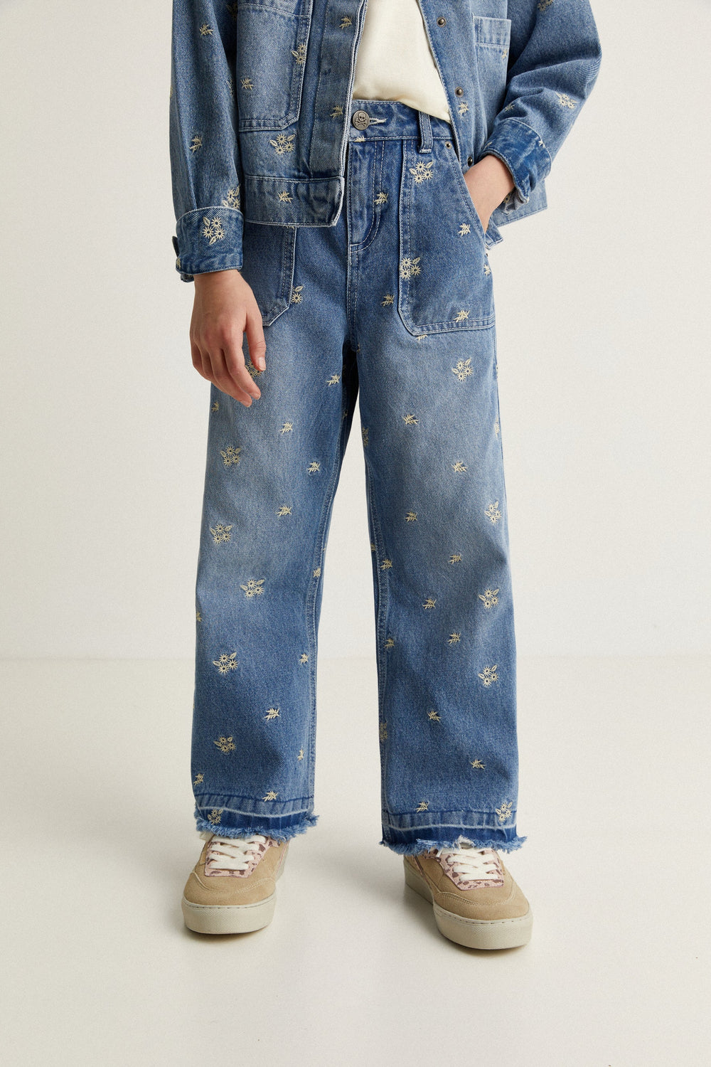 Pantalón vaquero wide leg con detalles bordados a contraste.