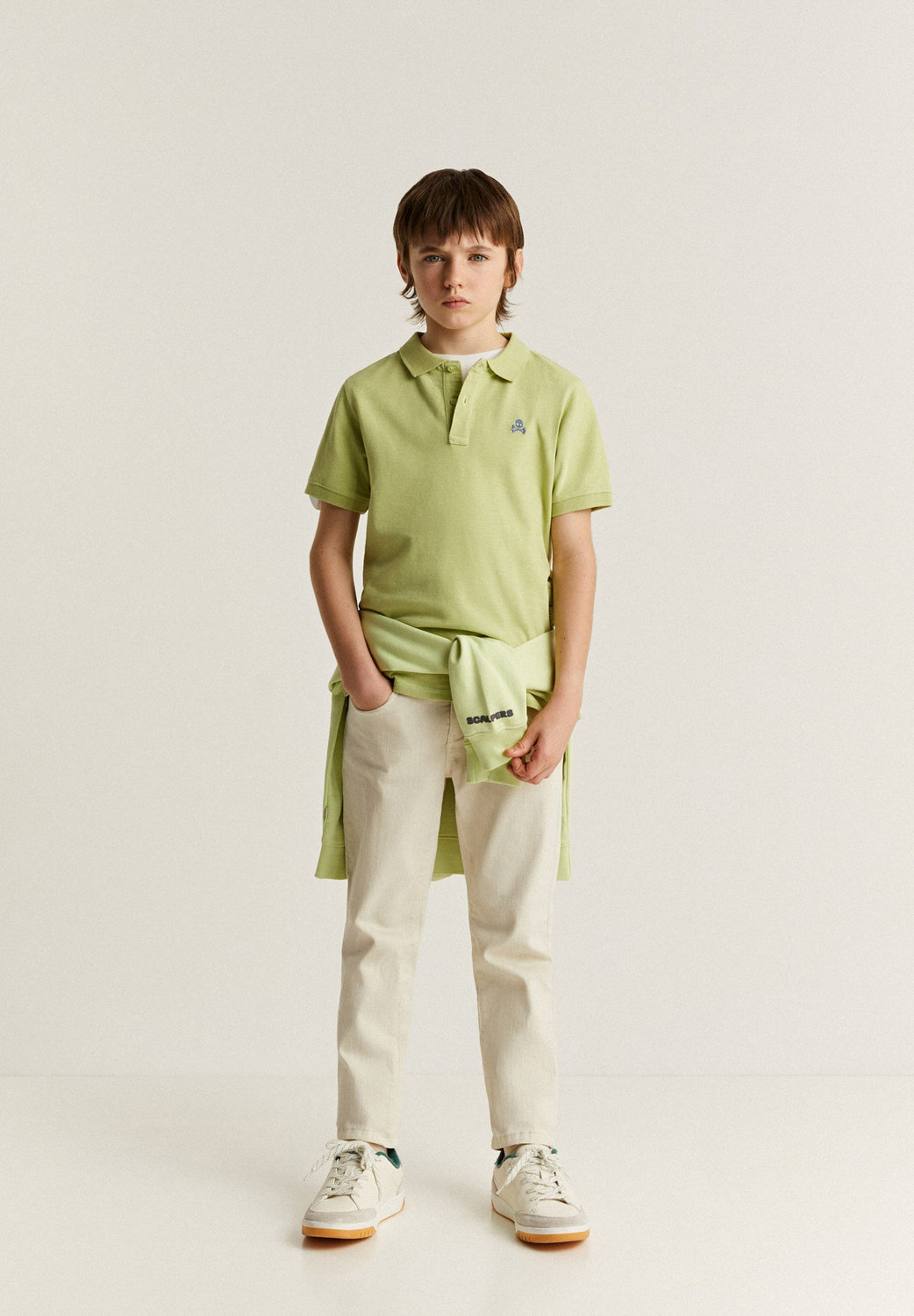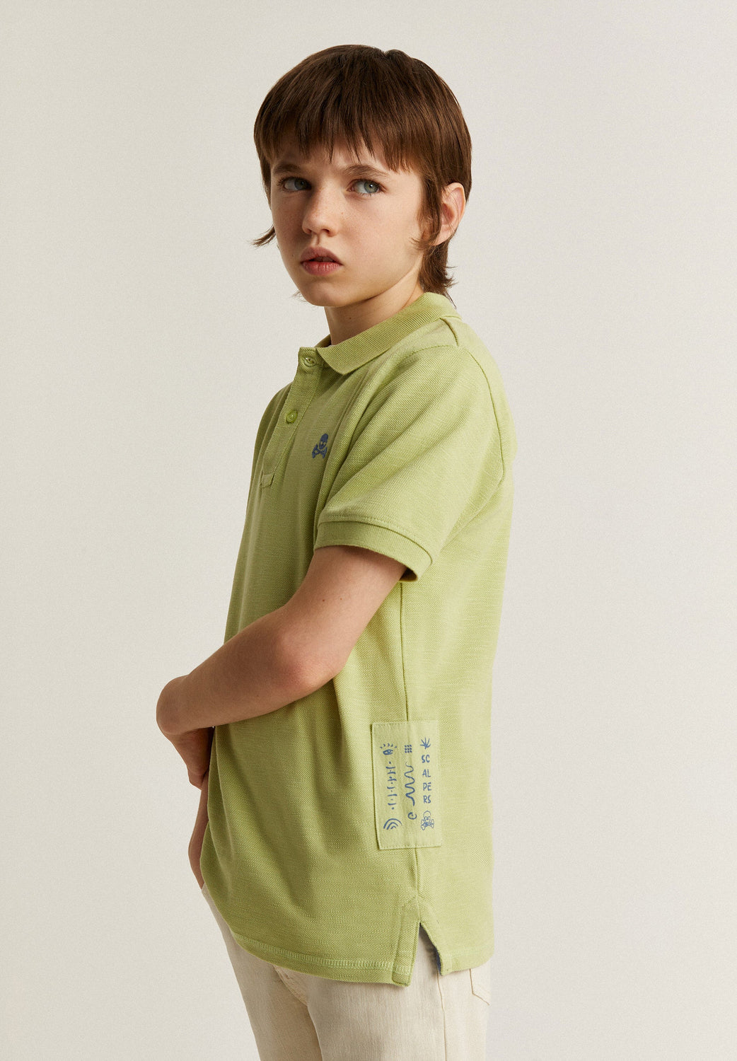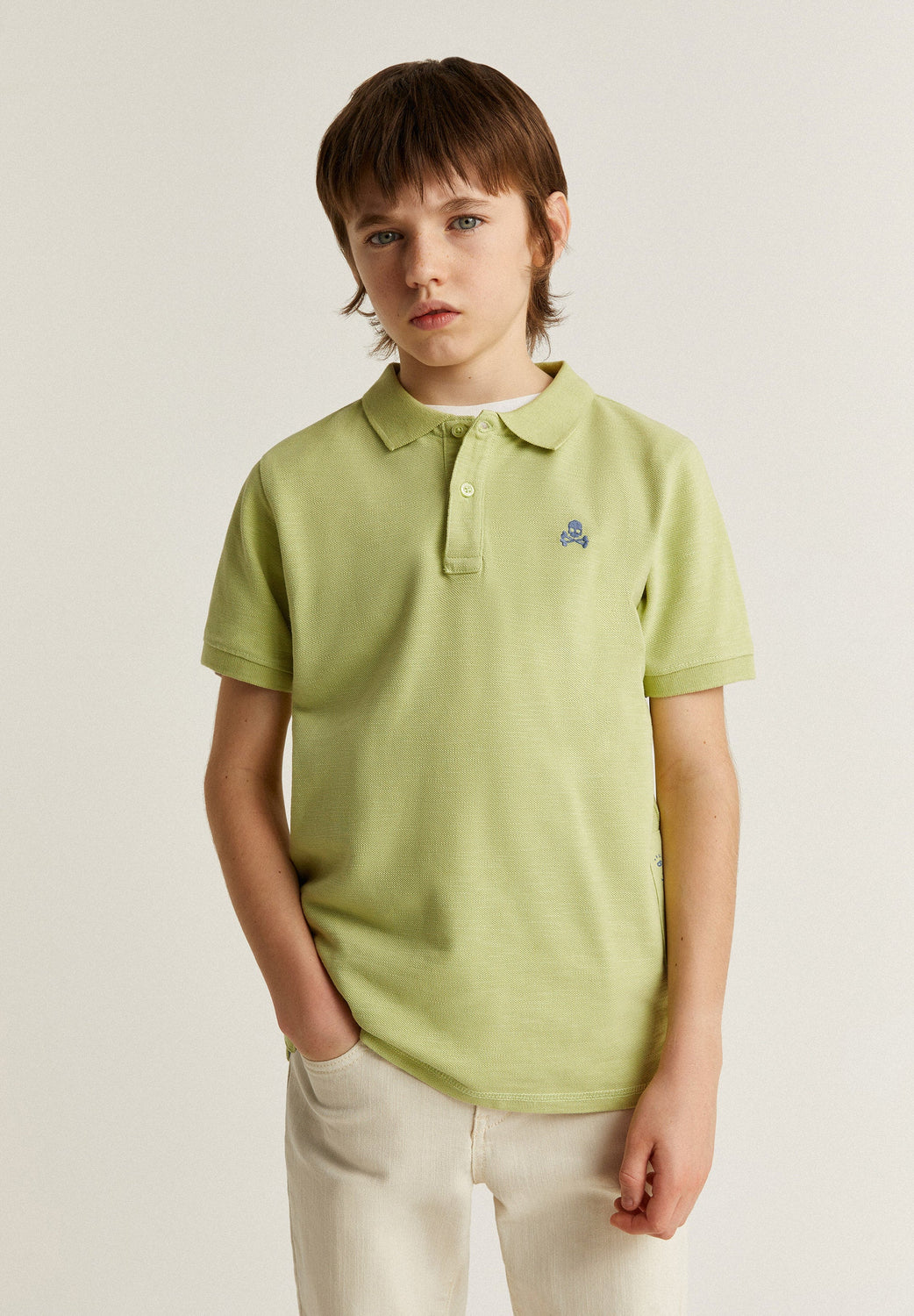 Polo en tejido rústico con detalle de calavera bordada a contraste en pecho.