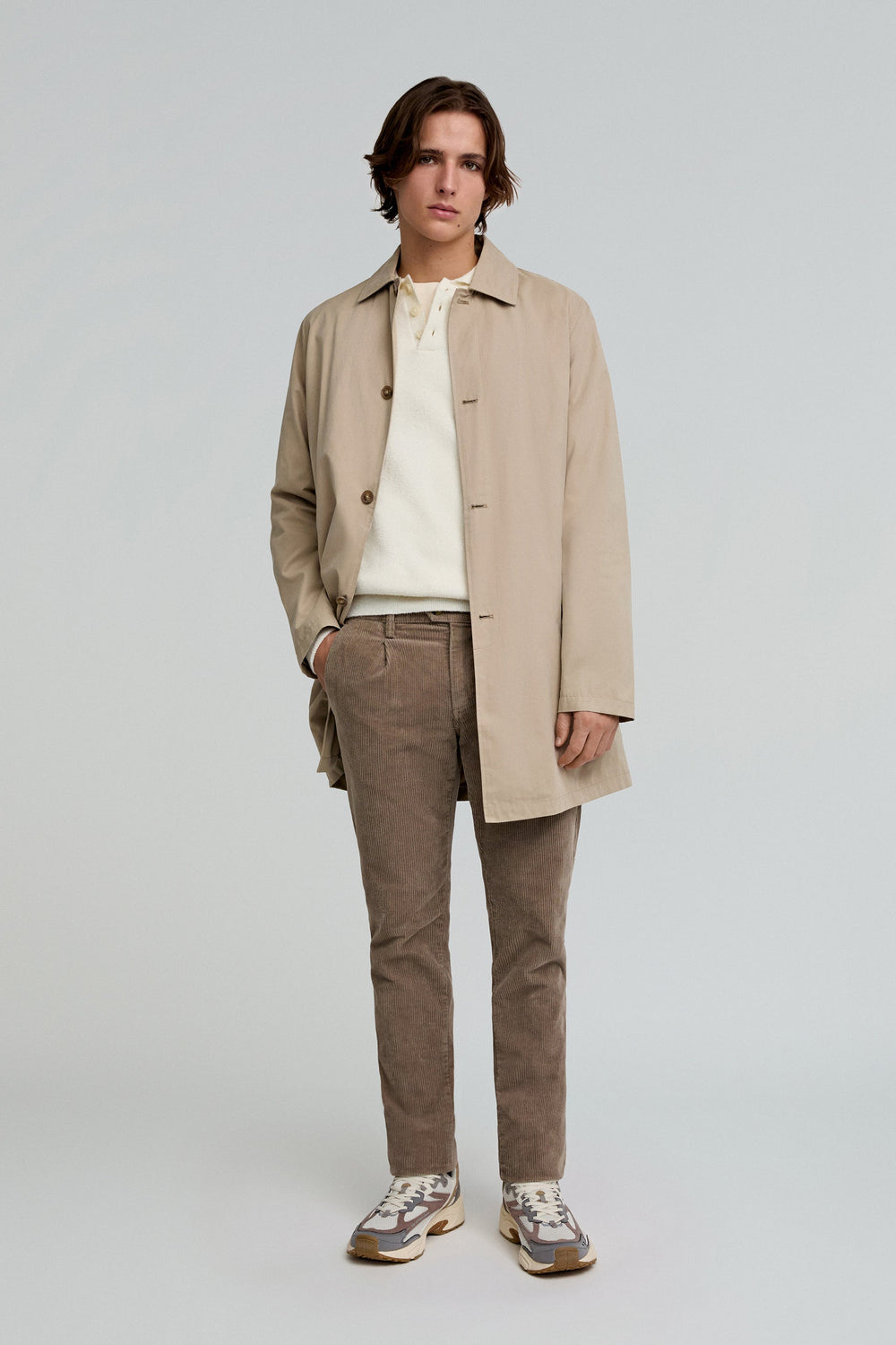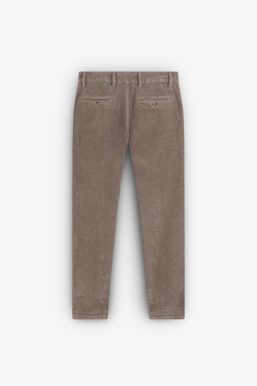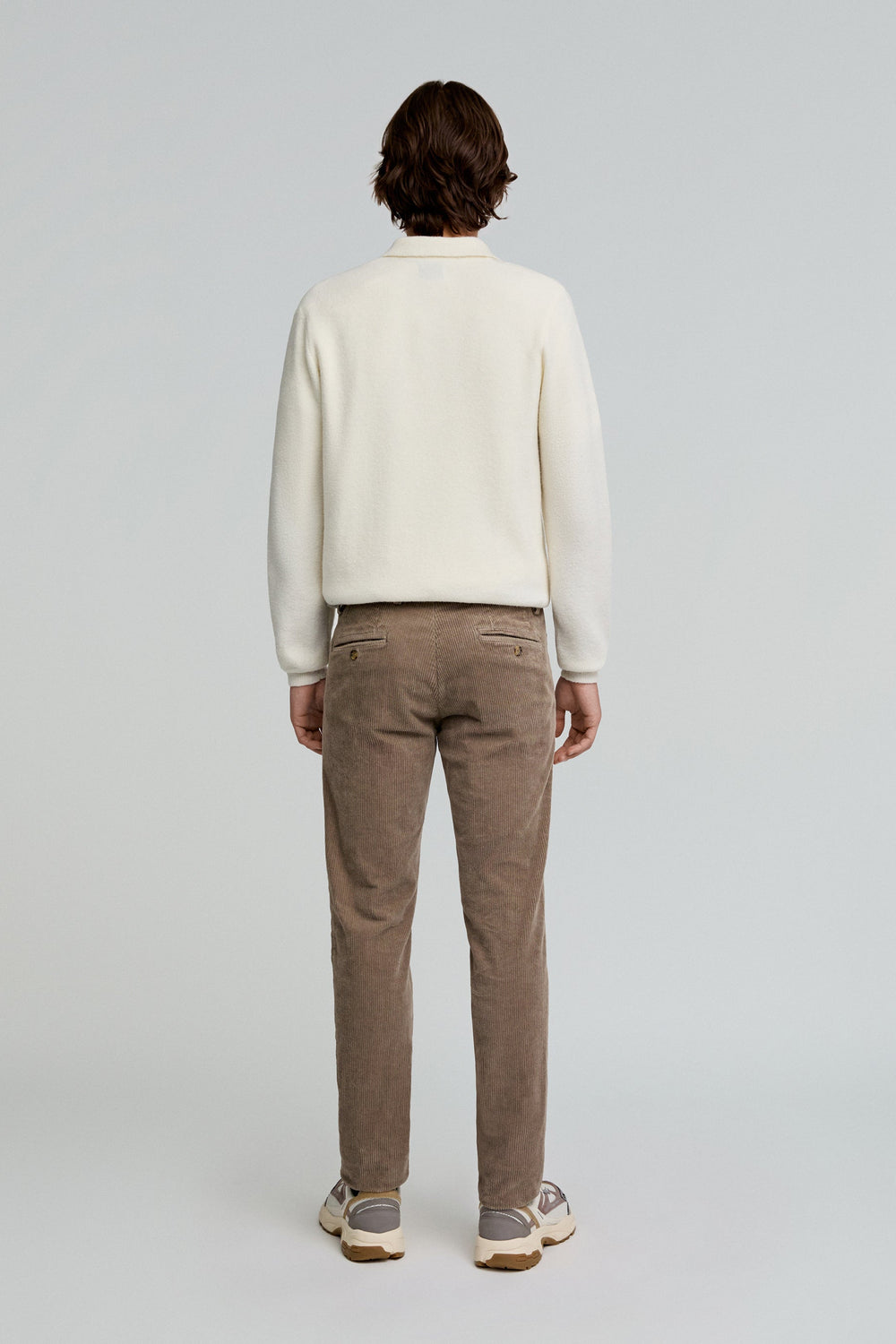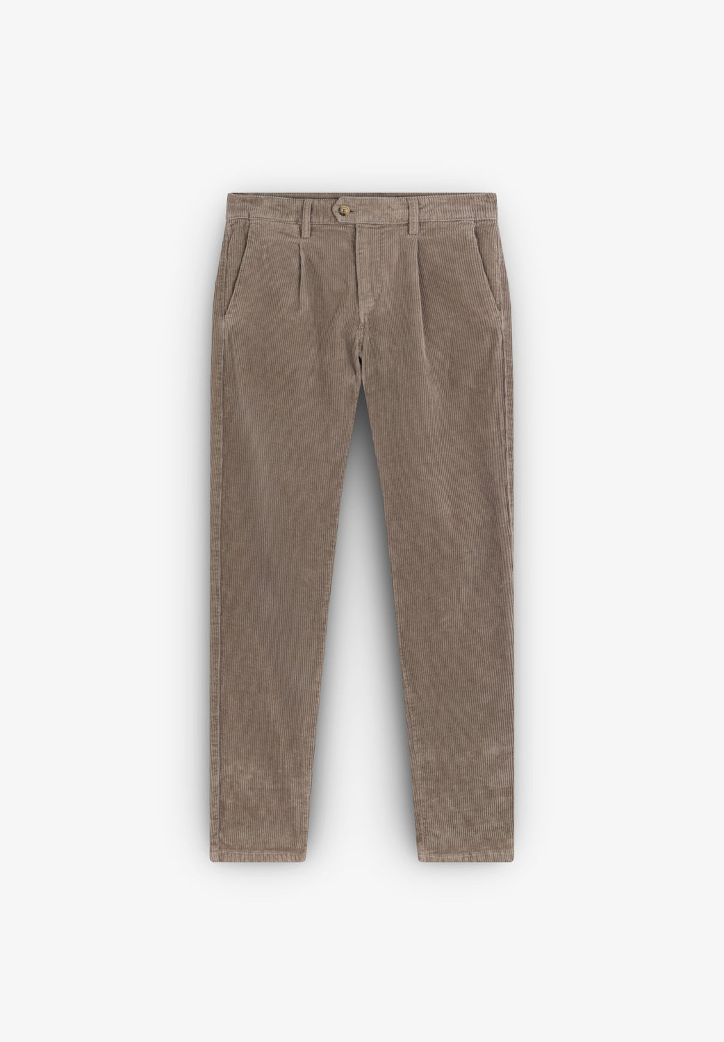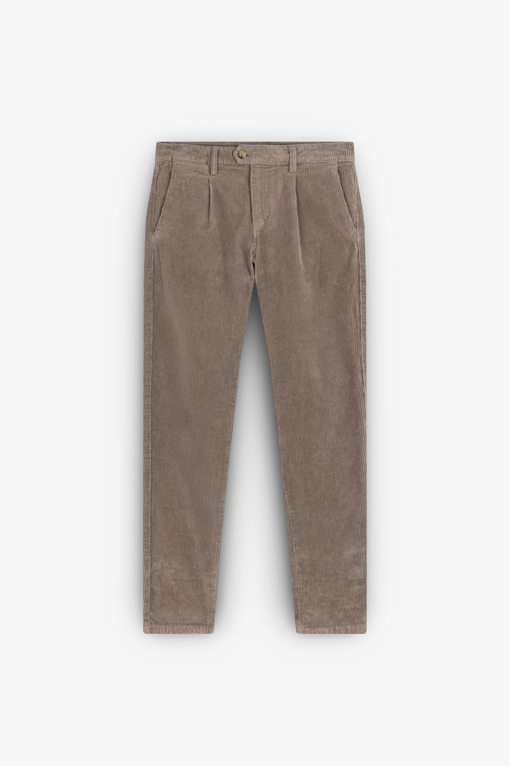 Pantalón chino de pana confeccionado en algodón ligeramente elástico. Regular fit con pinzas, cierre con botón prolongado en cintura y cremallera. Bolsillos laterales y trabillas en cintura.