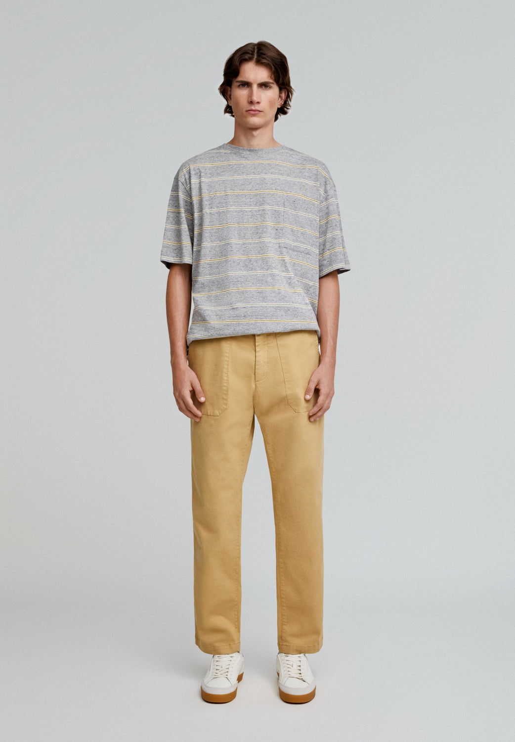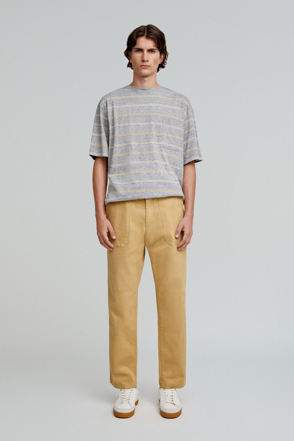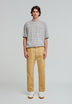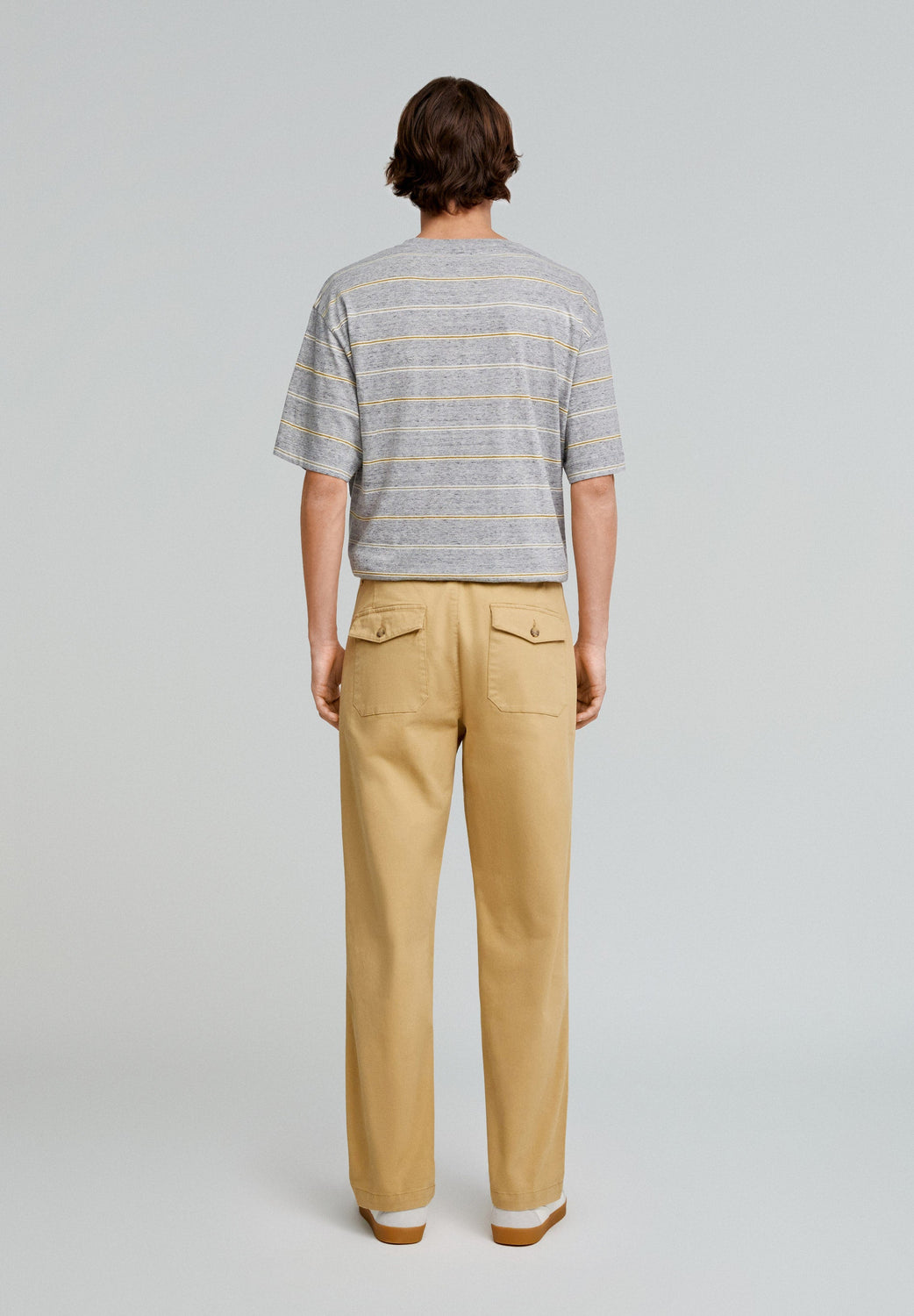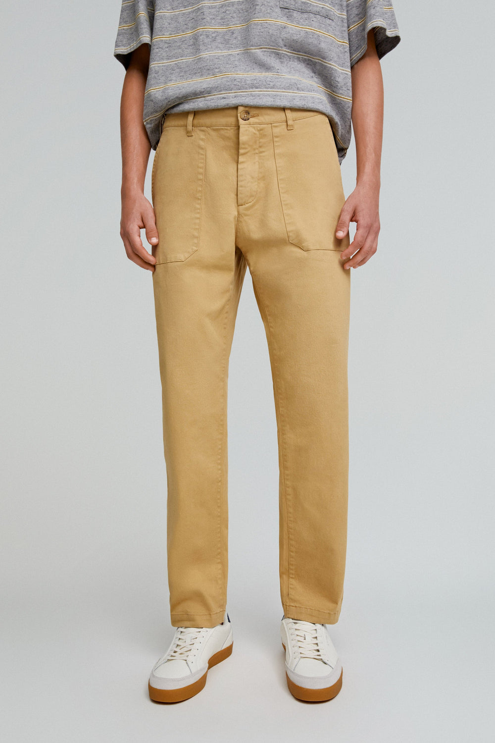 Pantalón confeccionado en tejido de algodón ligeramente elástico. Corte recto, regular fit, cierre con botones y bolsillos frontales grandes. Bolsillos traseros y trabillas en cintura.
