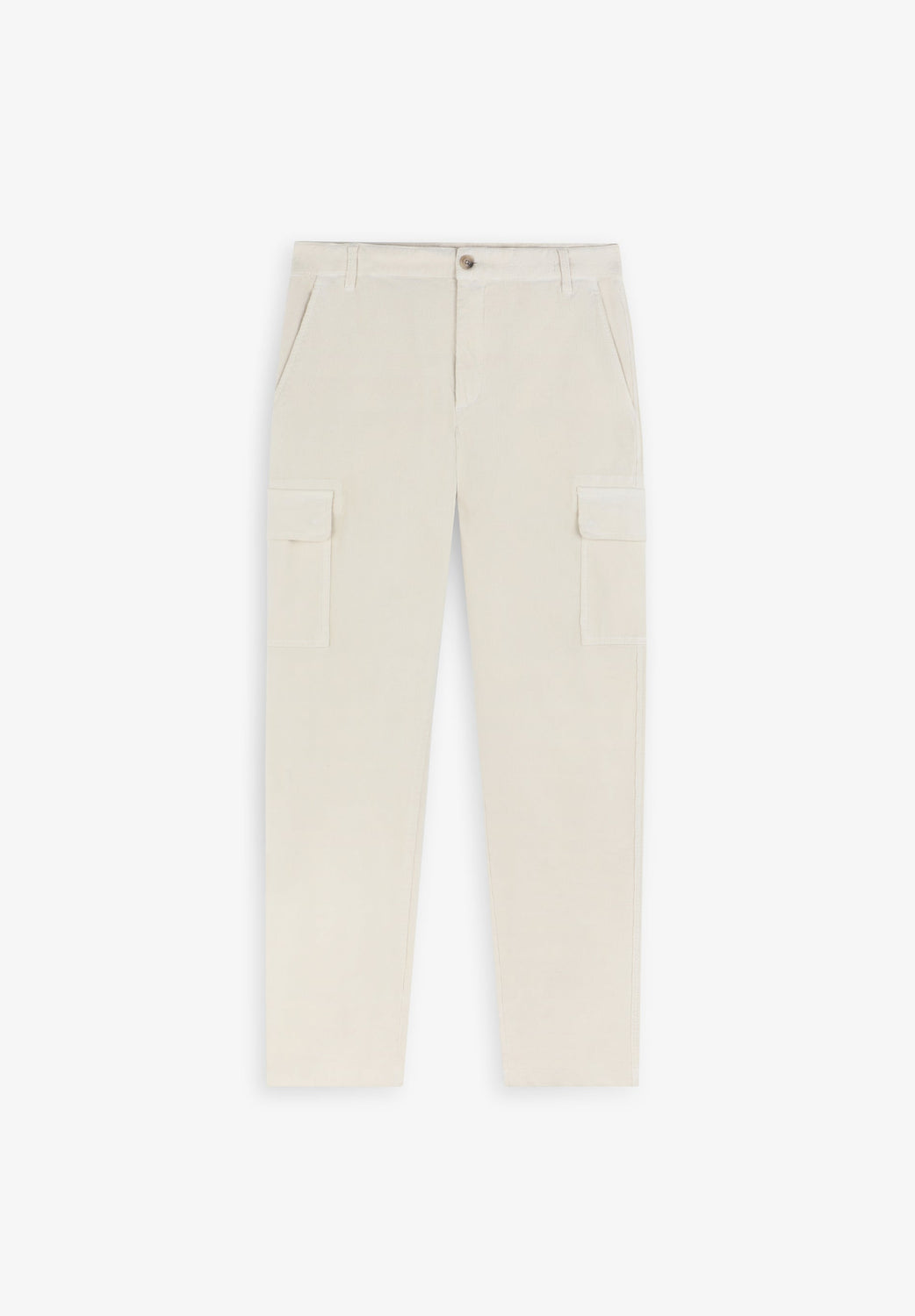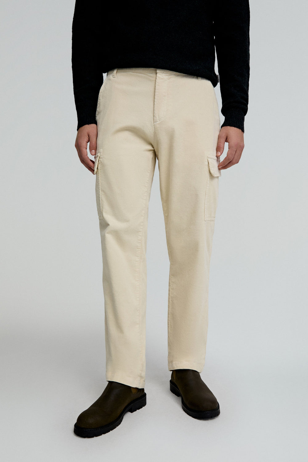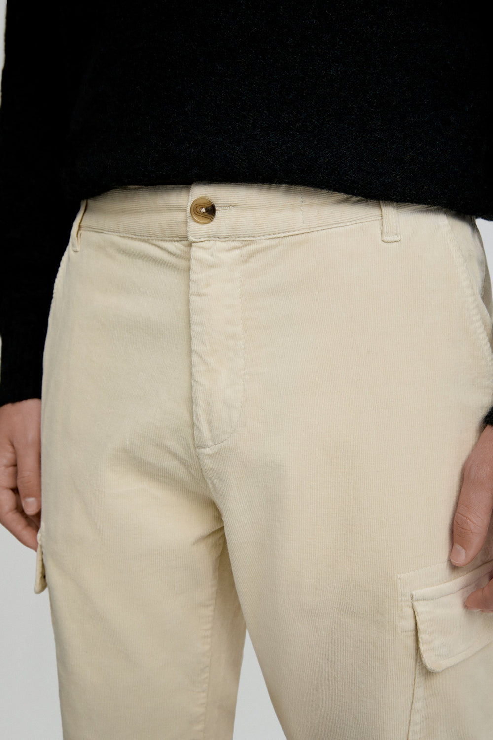 Pantalón cargo de pana confeccionado en algodón ligeramente elástico. Regular fit, cierre con botón y cremallera y bolsillos. Trabillas en cintura y bolsillos con tapeta en pernera.