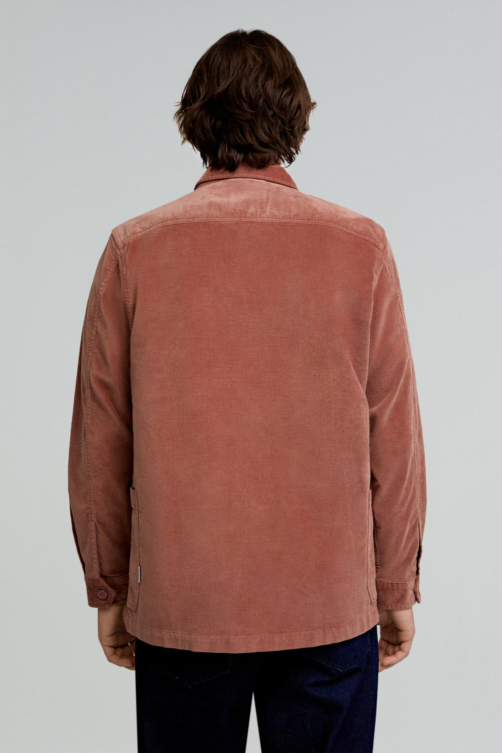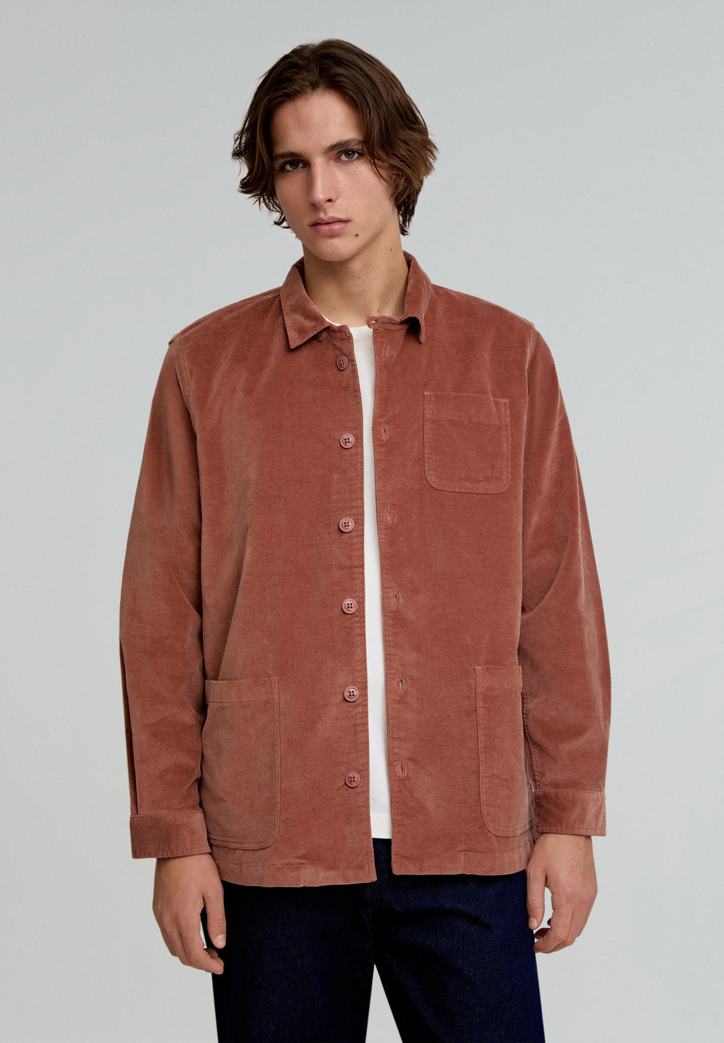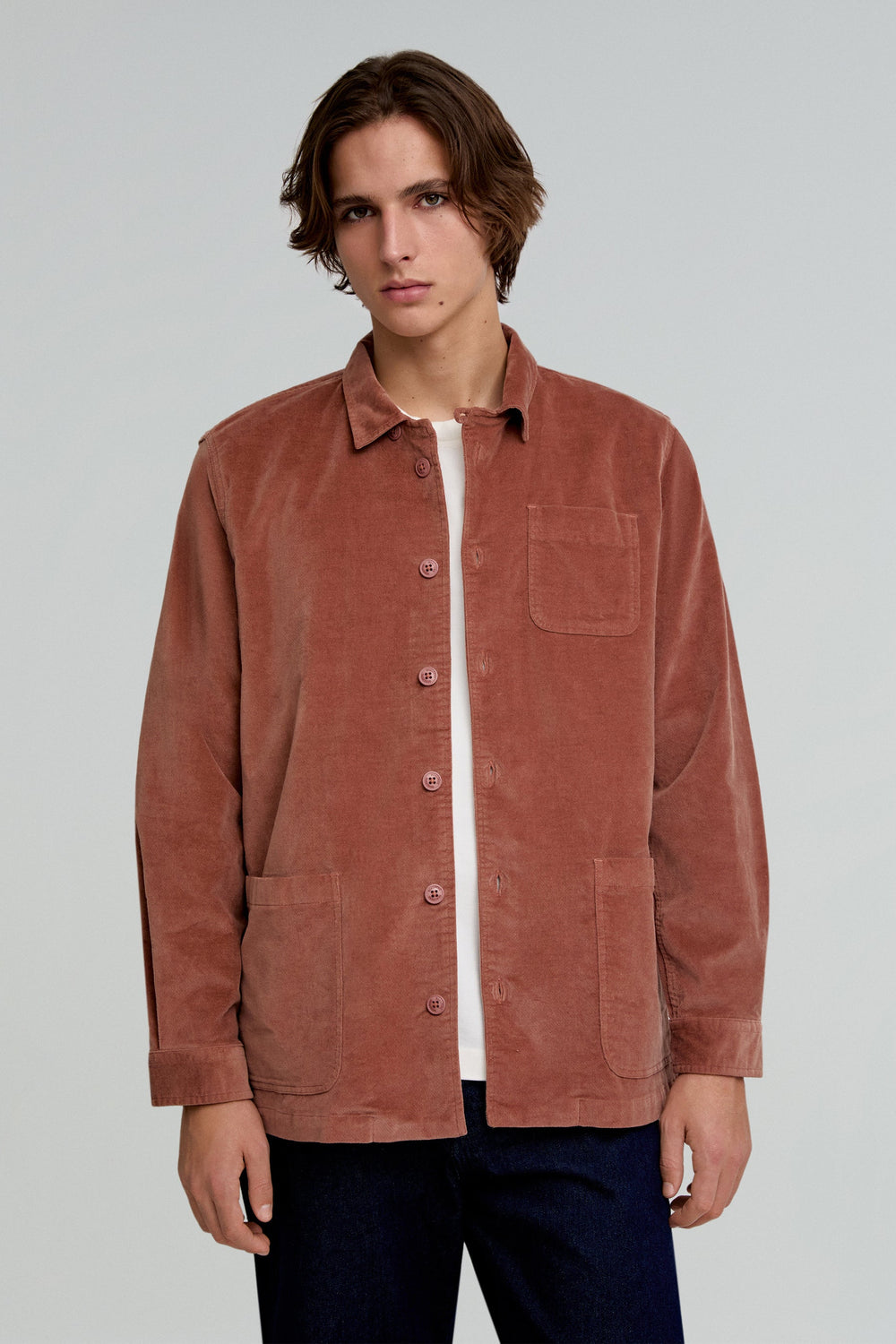 Sobrecamisa con tacto aterciopelado confeccionada en algodón orgánico ligeramente elástico. Regular fit, cuello clásico y cierre con botones. Manga larga terminada en puño con botón y bolsillos.