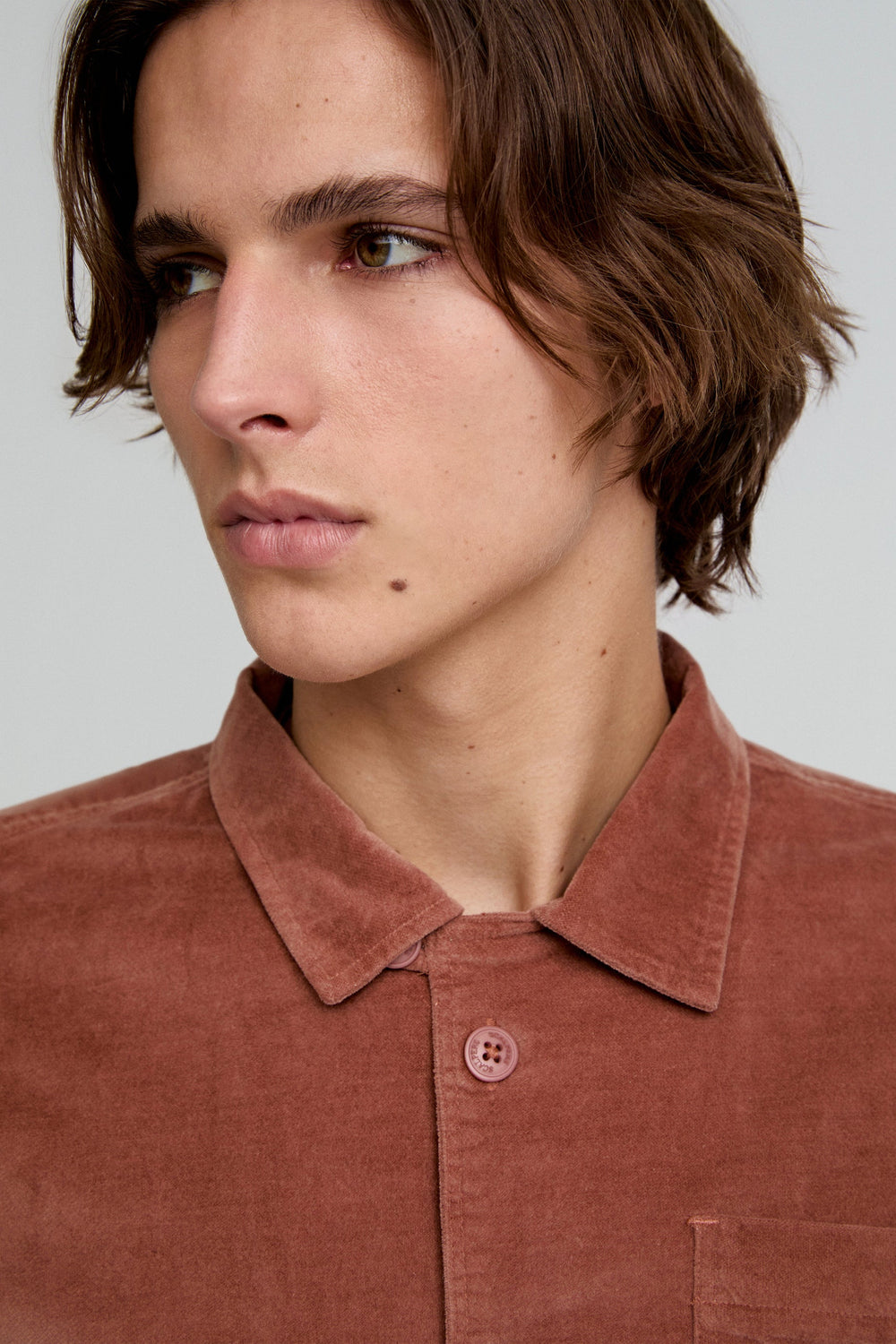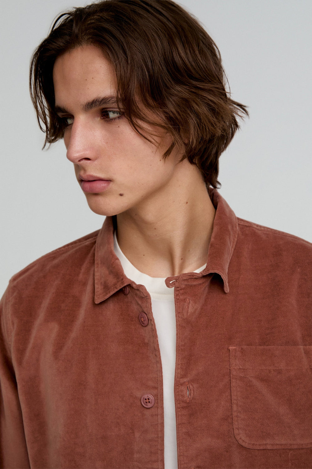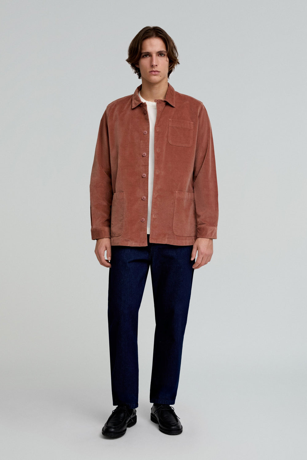 Sobrecamisa con tacto aterciopelado confeccionada en algodón orgánico ligeramente elástico. Regular fit, cuello clásico y cierre con botones. Manga larga terminada en puño con botón y bolsillos.