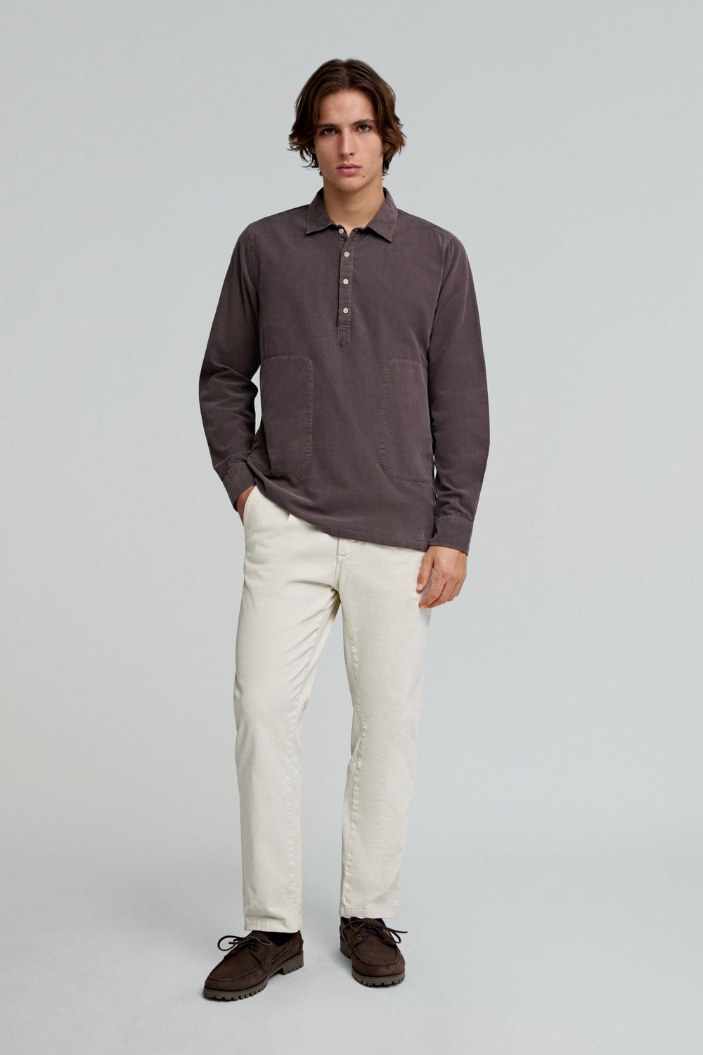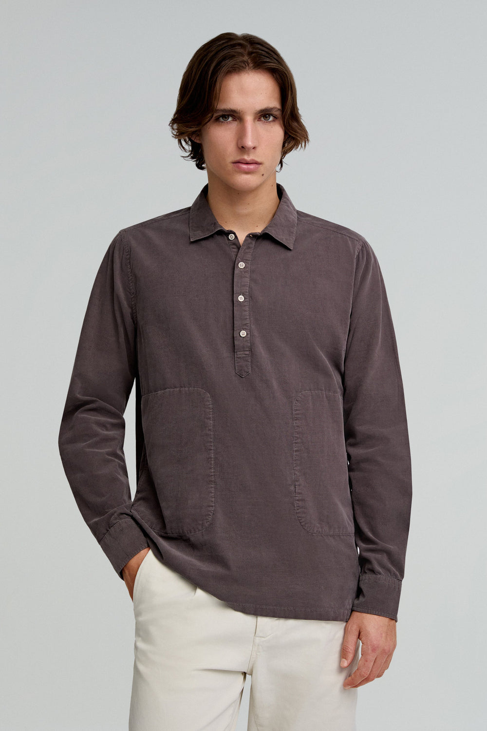 Camisa tipo polera confeccionada en 100% algodón. Regular fit, cuello clásico y cierre con botones. Manga larga y bolsillos laterales.