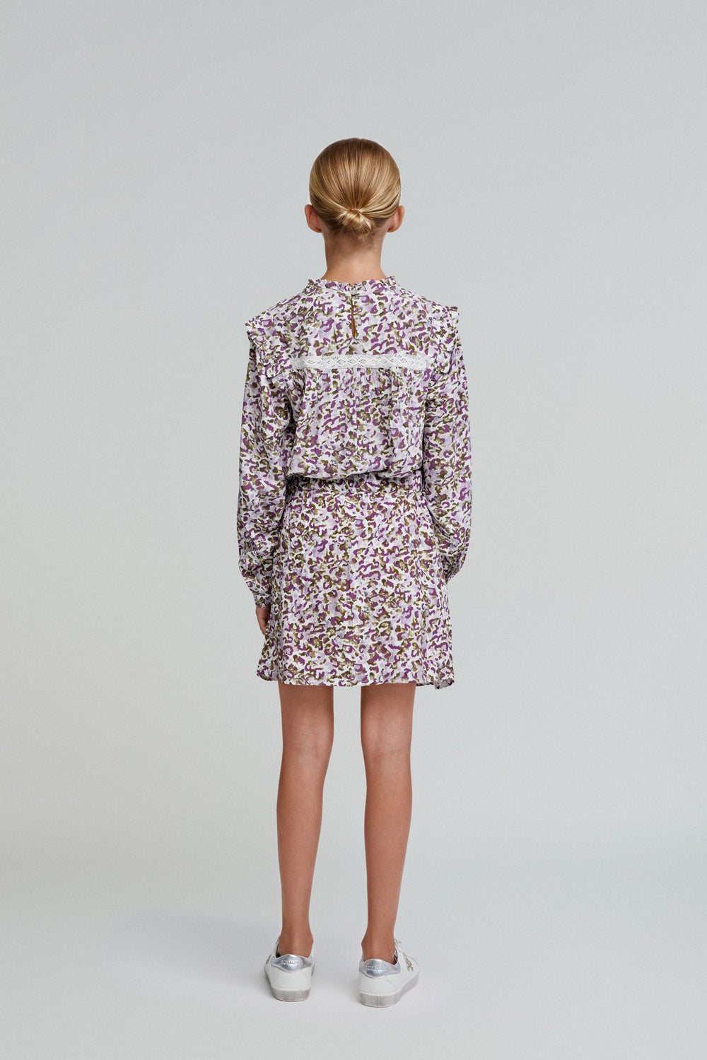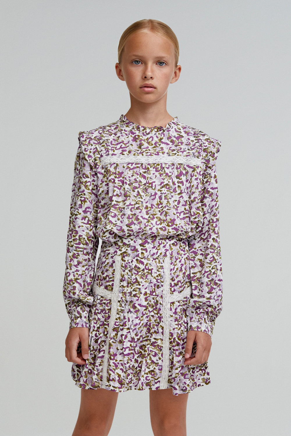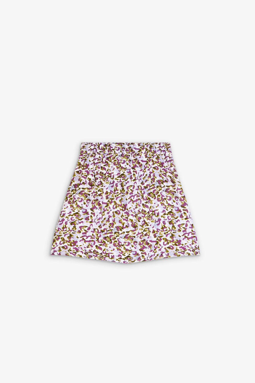 Falda mini con print confeccionada en tejido fluido. Regular fit, cierre con cremallera. Detalle de jaretas y encaje.