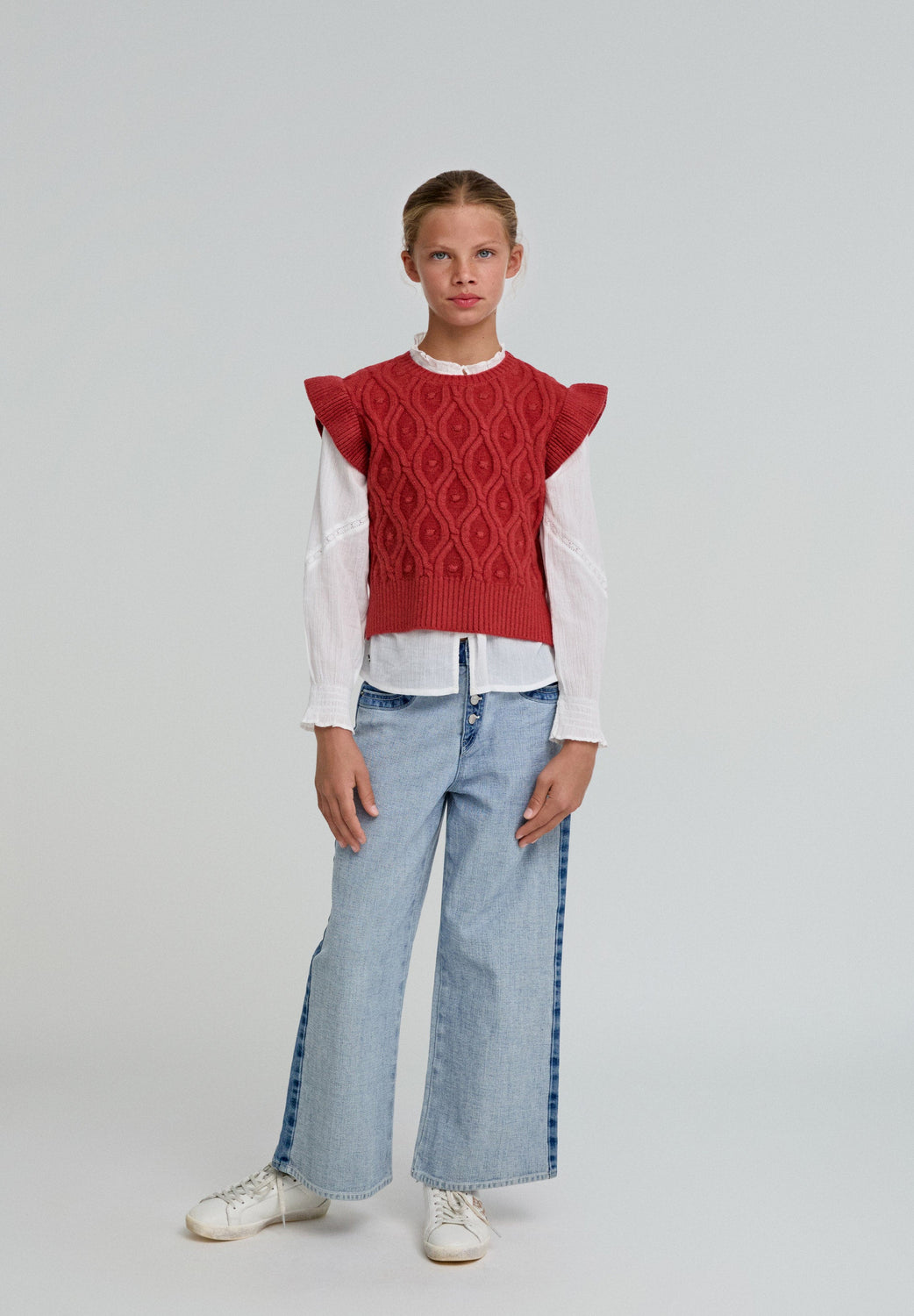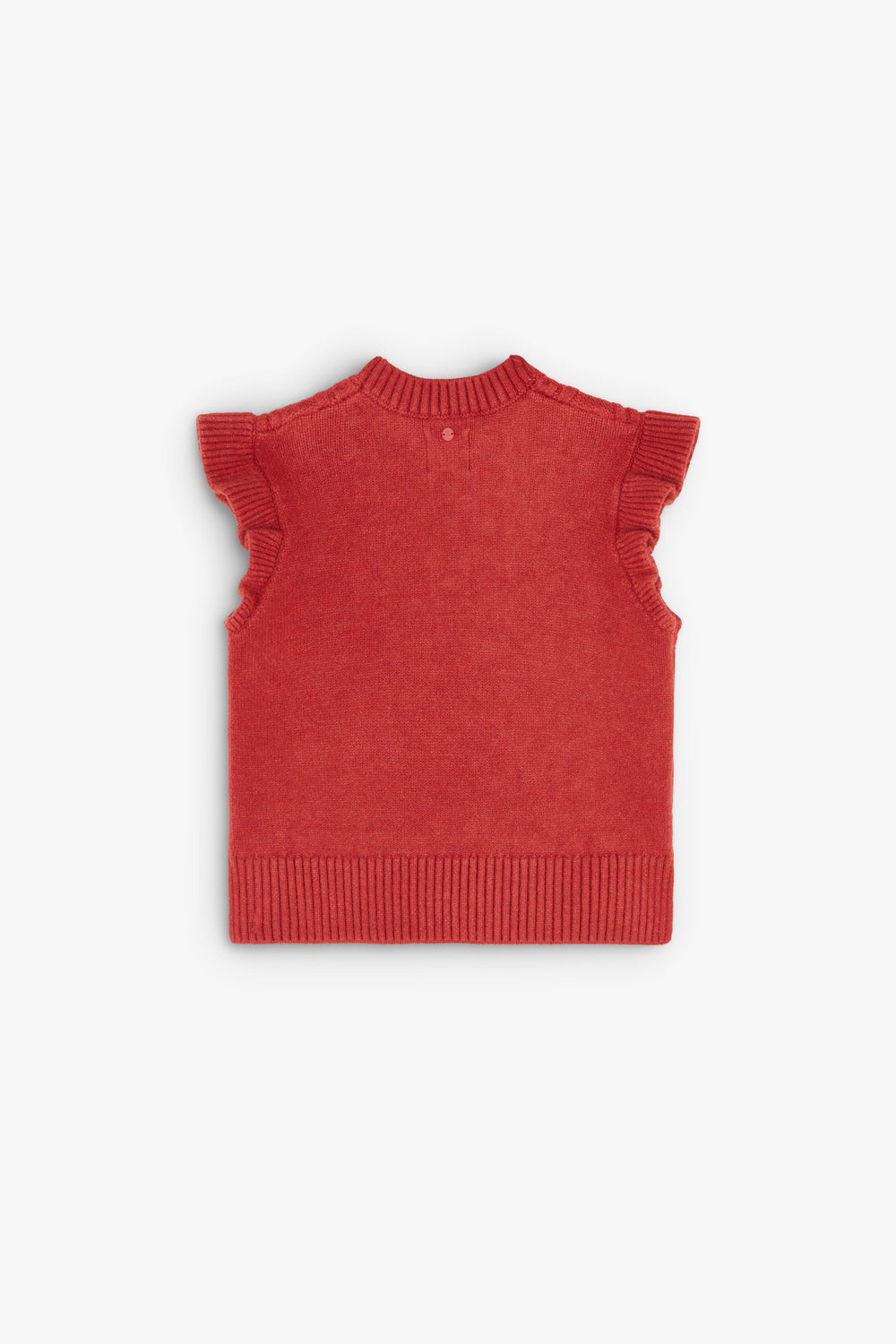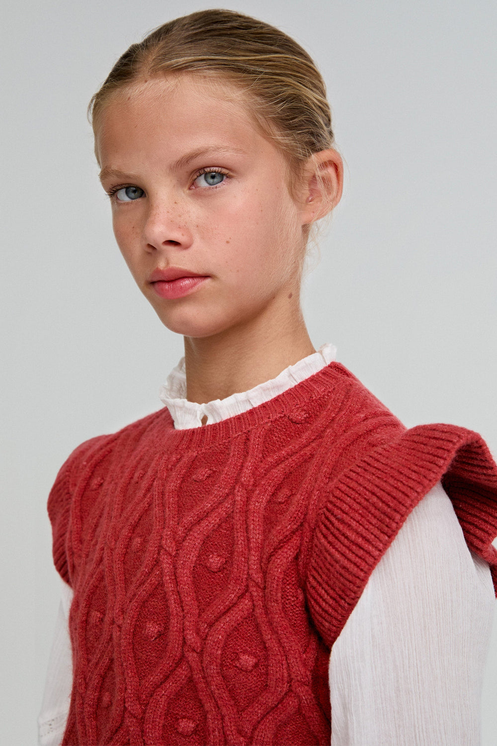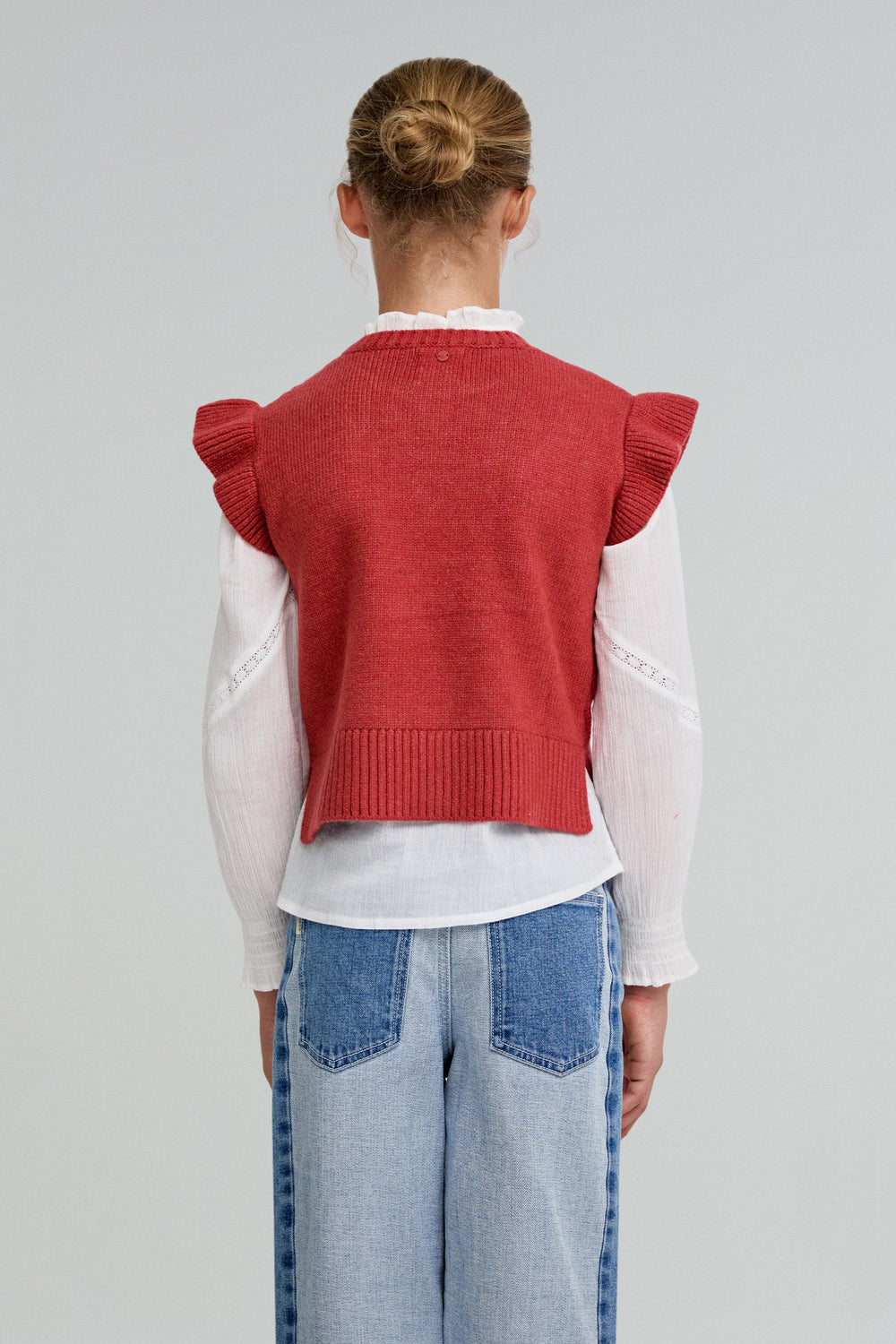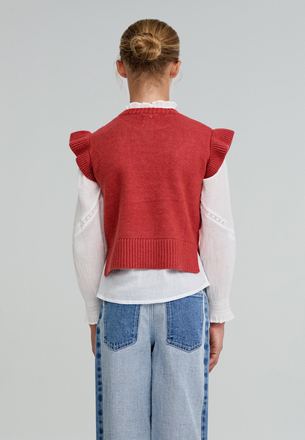Chaleco de punto con mangas acabadas en volante. Corte Regular Fit. Cuello Redondo. Acabados en rib.