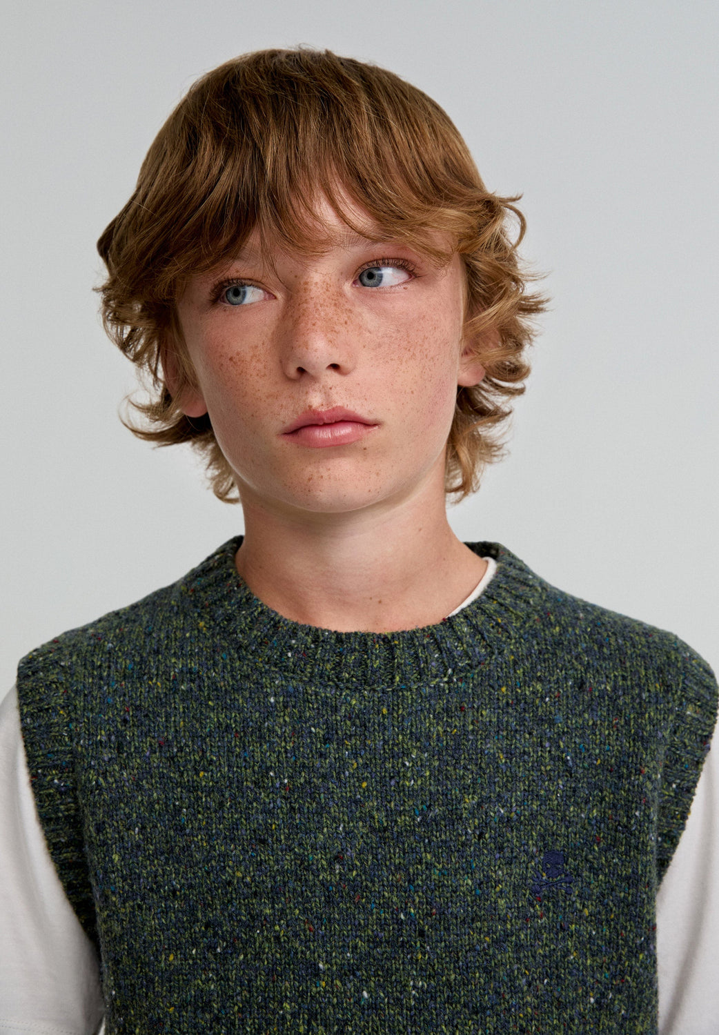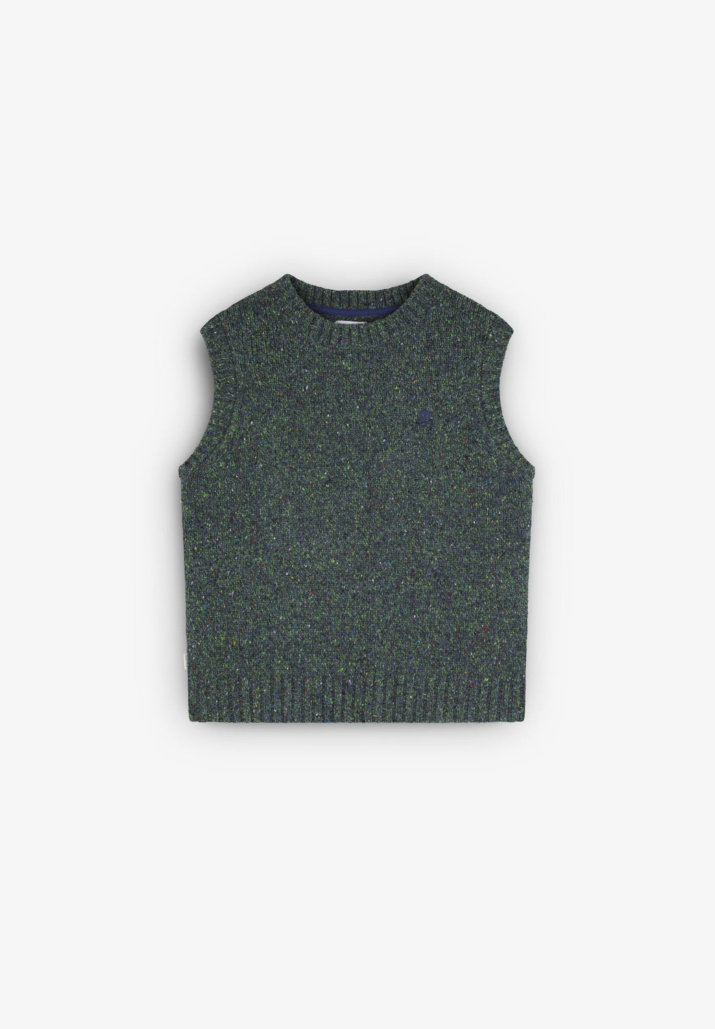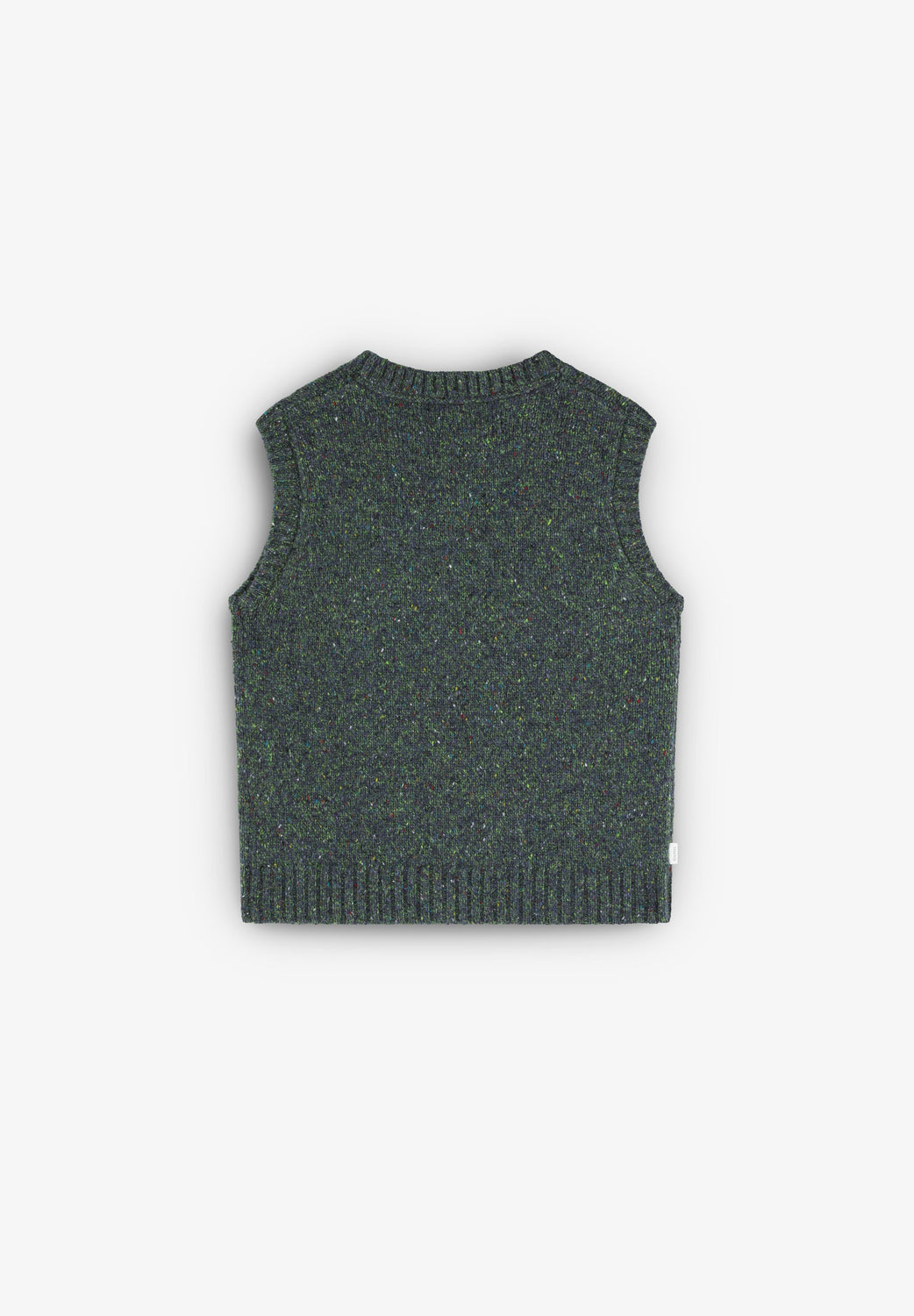 Chaleco de punto confeccionado en tejido reciclados. Regular fit, cuello redondo y manga en sisa.