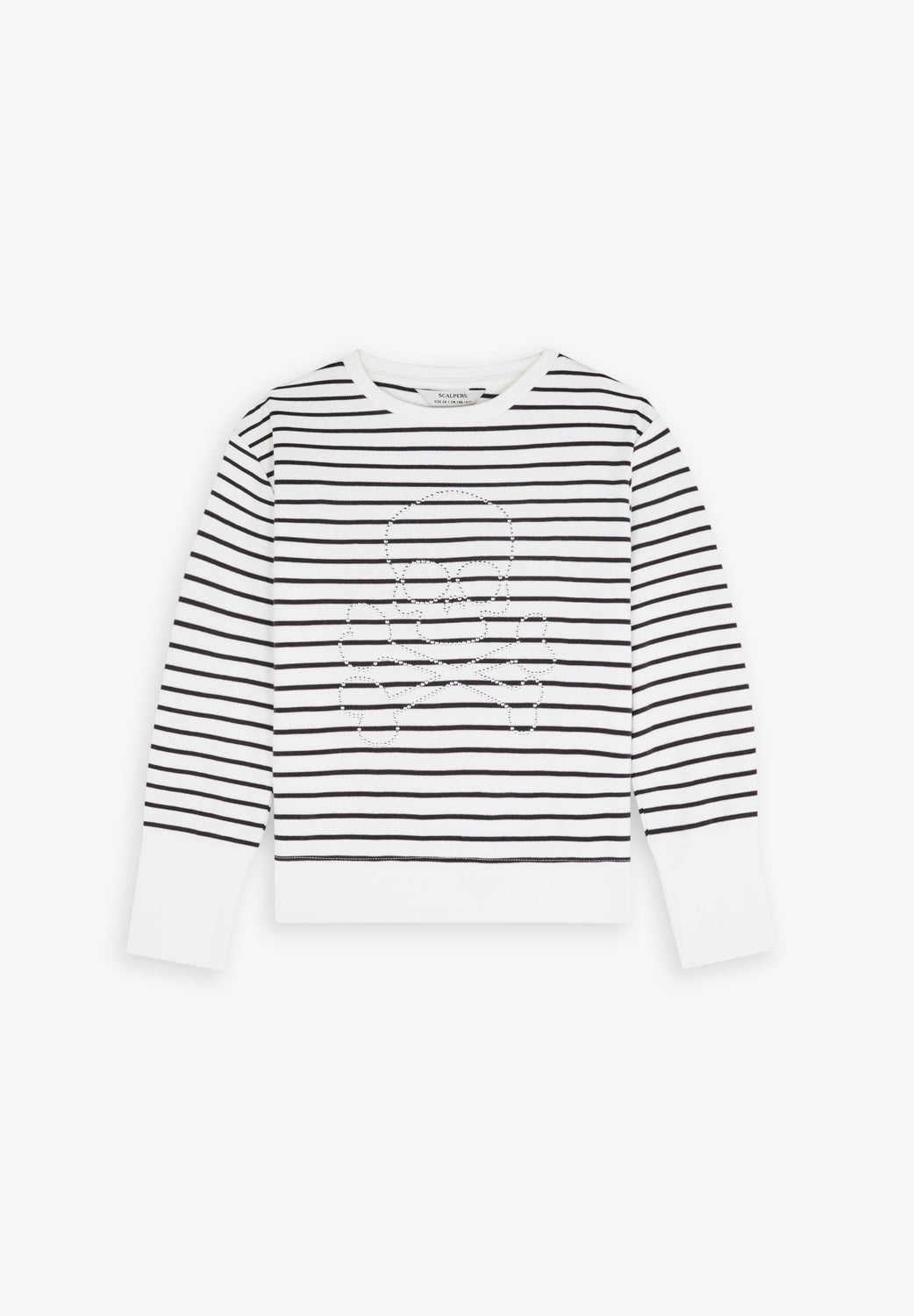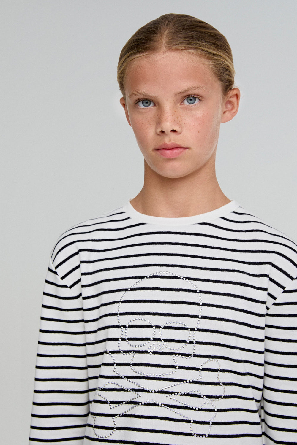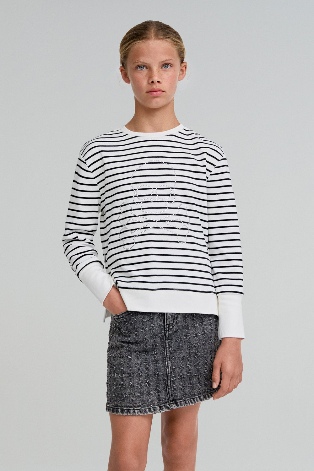 Sudadera de rayas con calavera frontal brillos. Confeccionada en 100% Algodón BCI. Corte Regular fit. Cuello redondo. Manga larga.