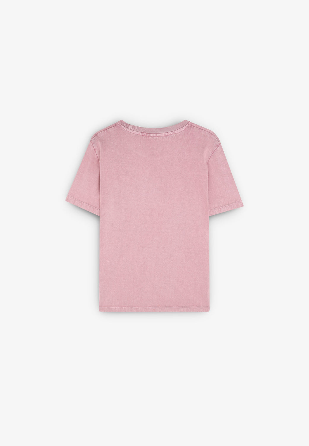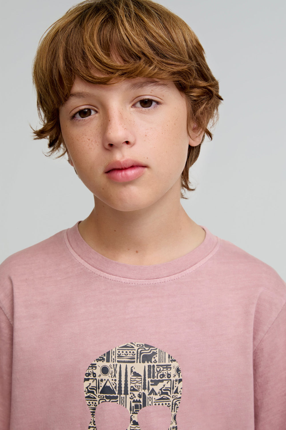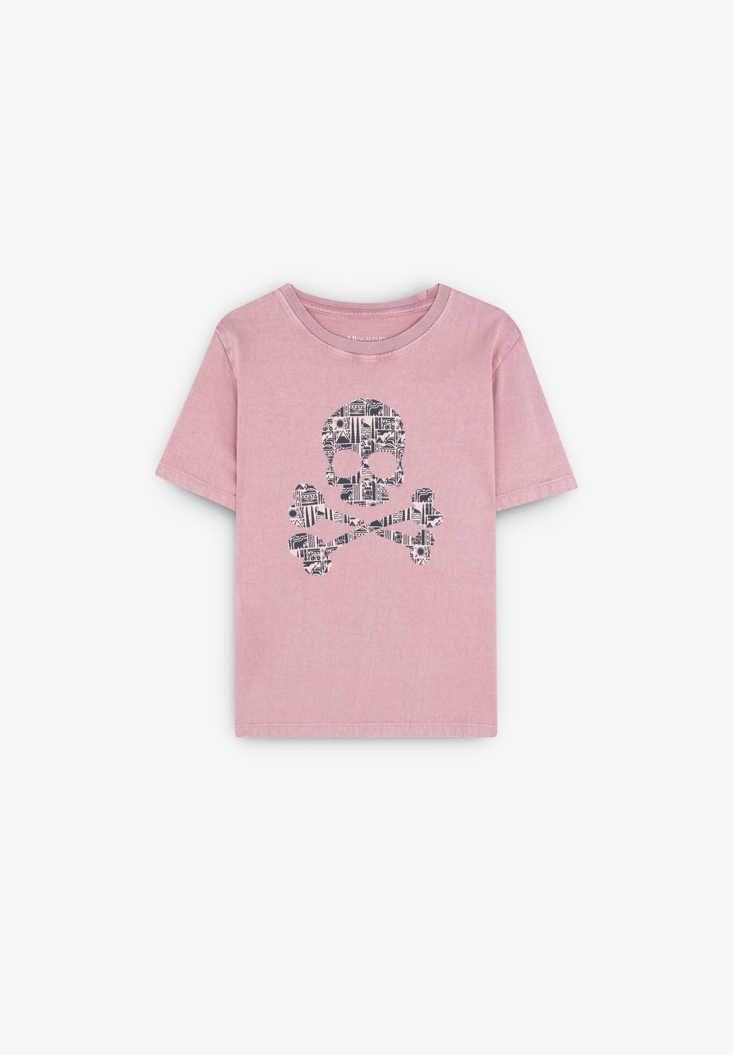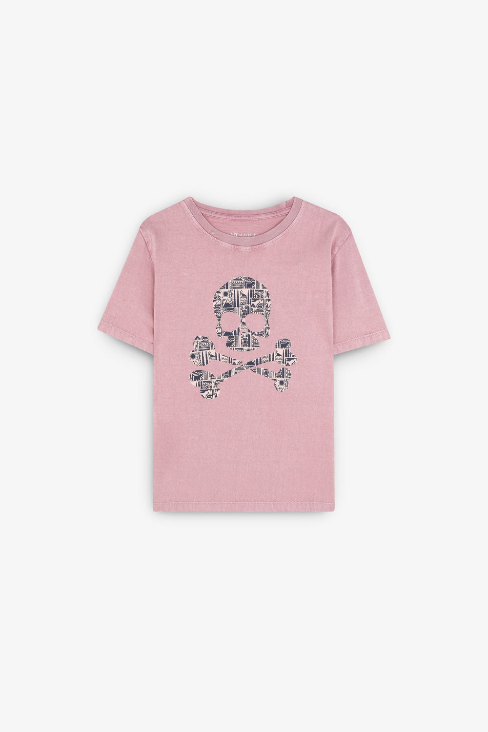 Camiseta lavada confeccionada en 100% algodón BCI. Regular fit, cuello redondo y manga corta. Print de calavera delantero.