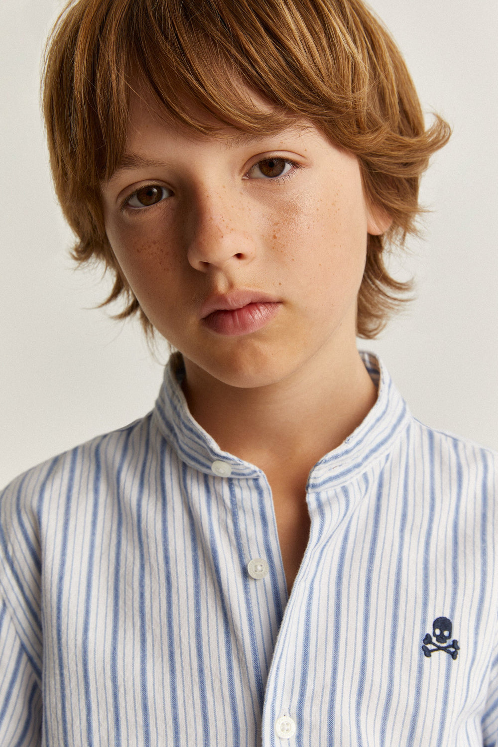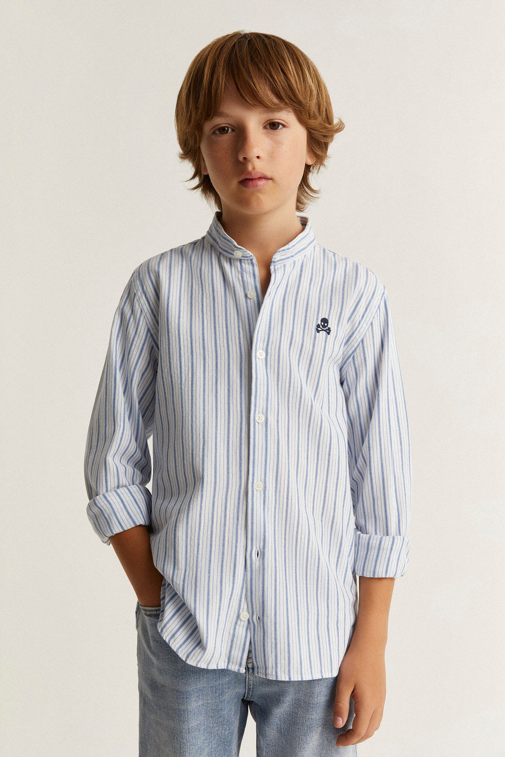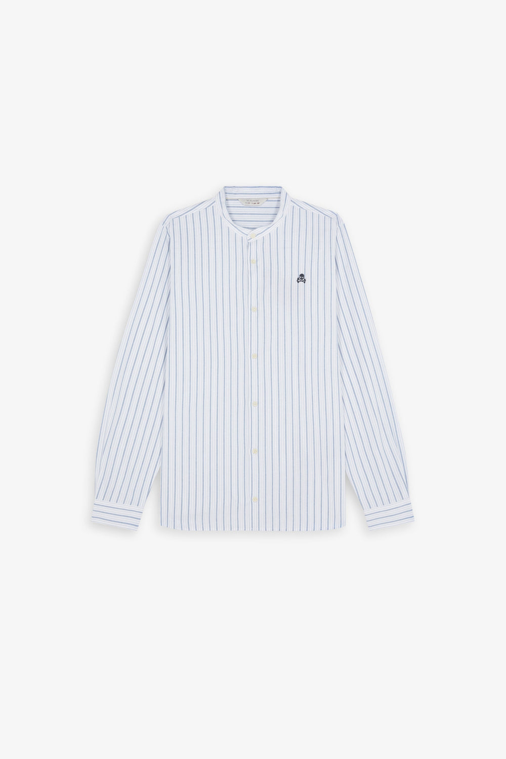 Camisa de rayas. Confeccionada en 100% Algodón BCI. Corte Regular fit. Cuello mao. Cierre frontal con botones. Manga larga terminada en puño con botones. Detalle de calavera bordada a tono.