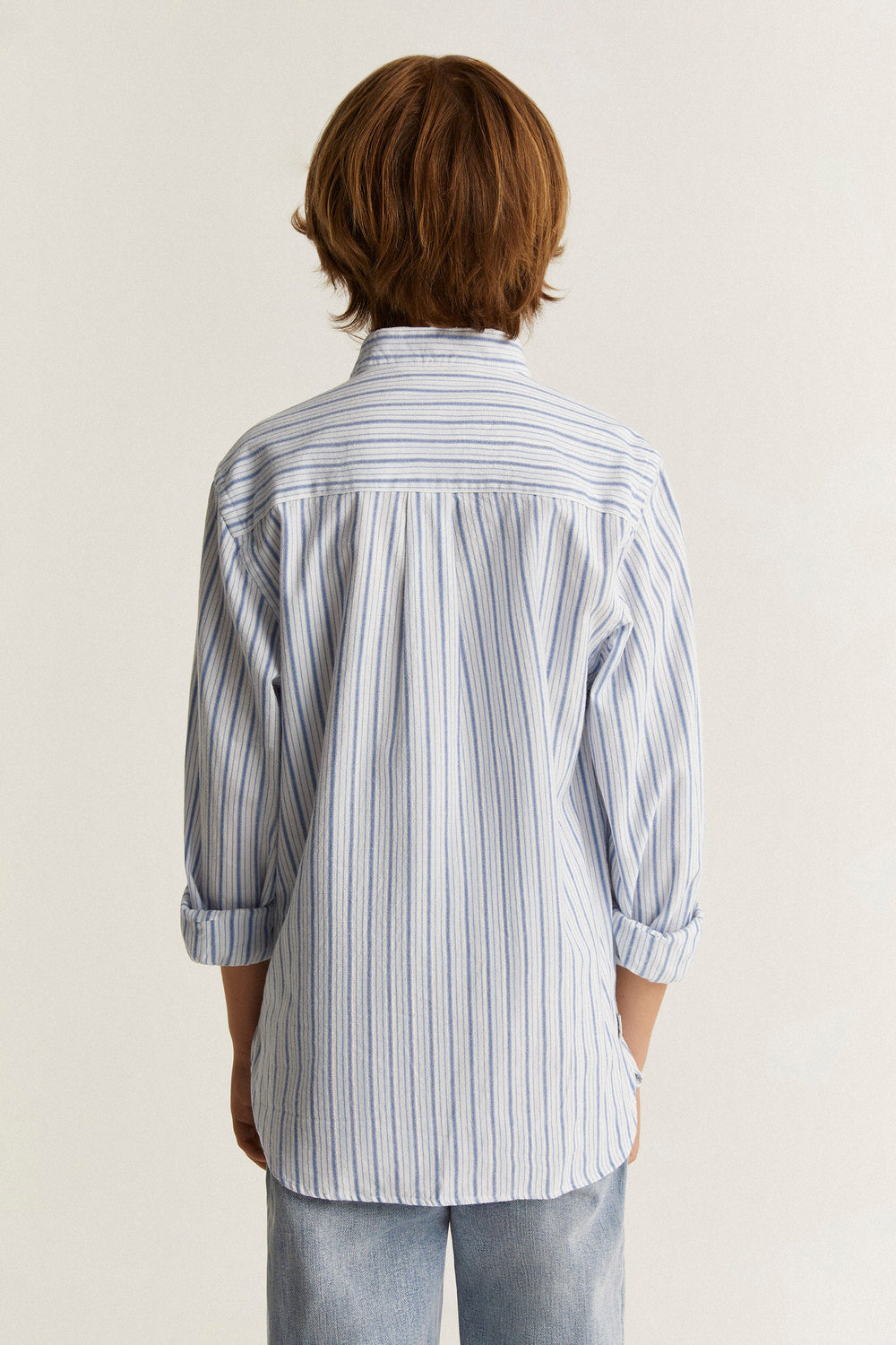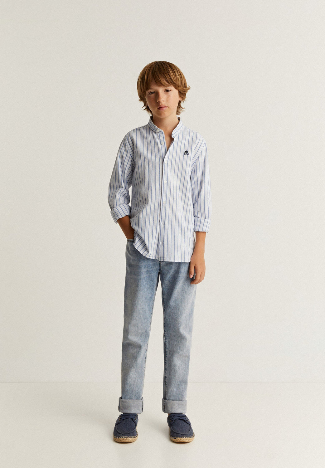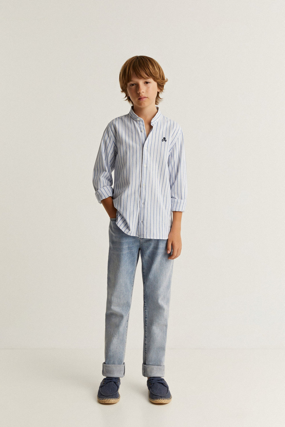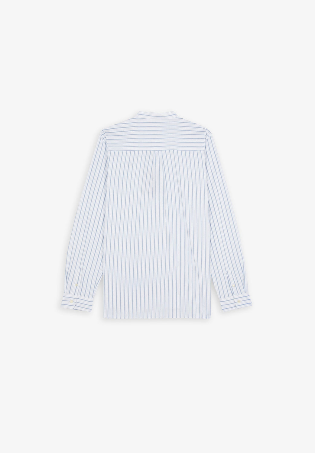 Camisa de rayas. Confeccionada en 100% Algodón BCI. Corte Regular fit. Cuello mao. Cierre frontal con botones. Manga larga terminada en puño con botones. Detalle de calavera bordada a tono.