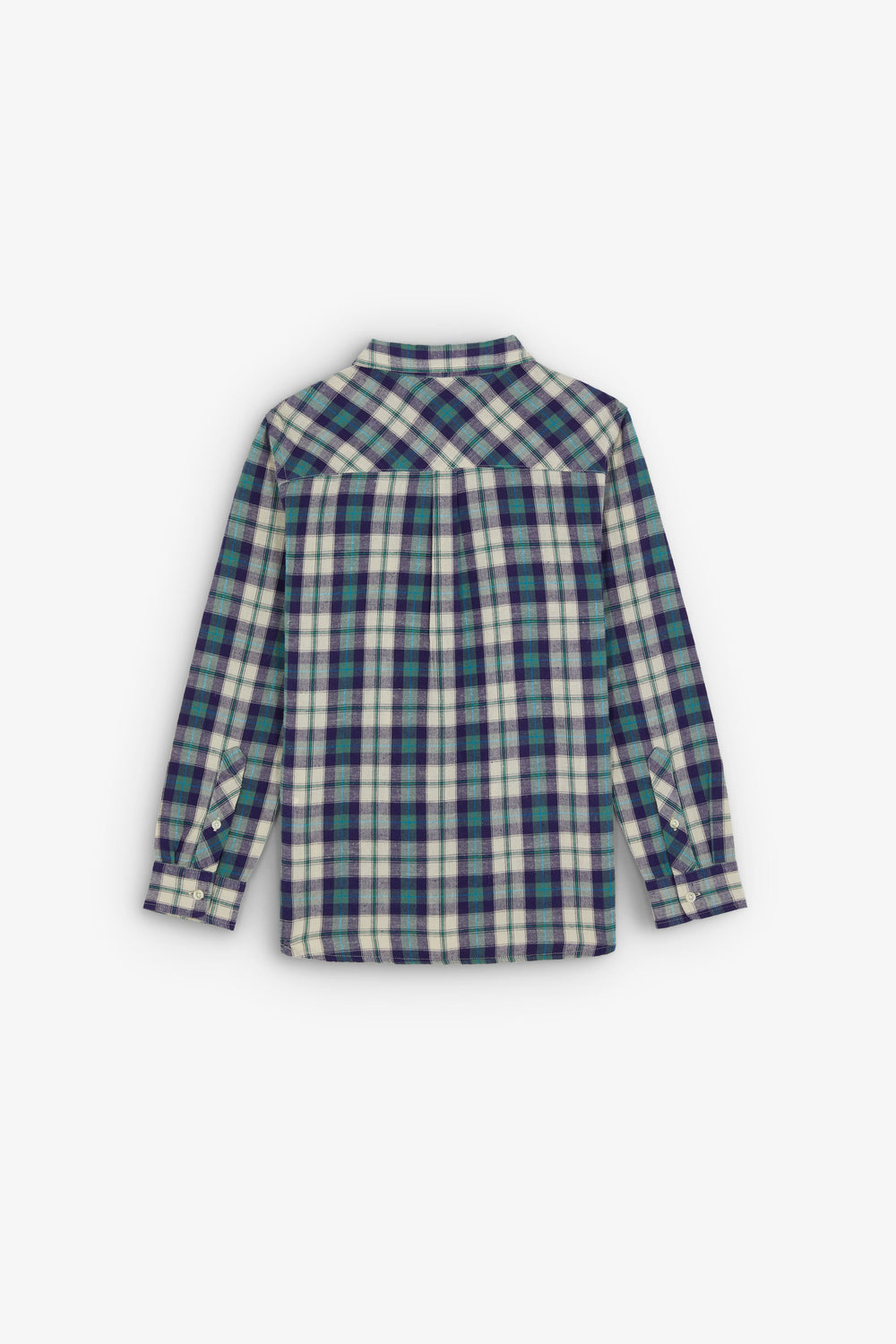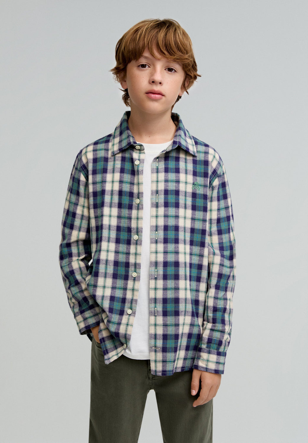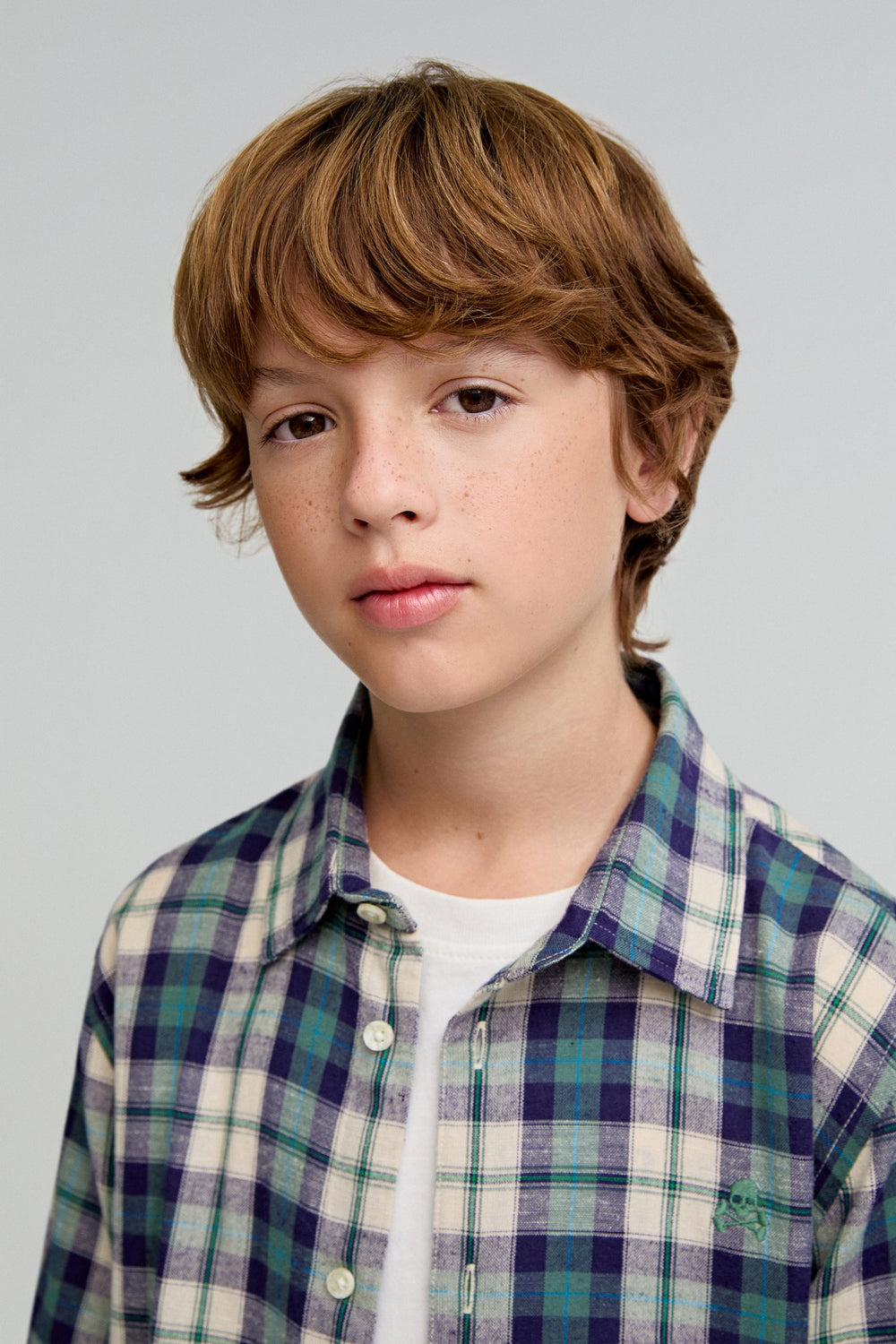 Camisa de cuadros confeccionada en mezcla de algodón BCI y lino. Regular fit, cuello clásico y cierre con botones. Manga larga terminada en puño y calavera bordada con botones.