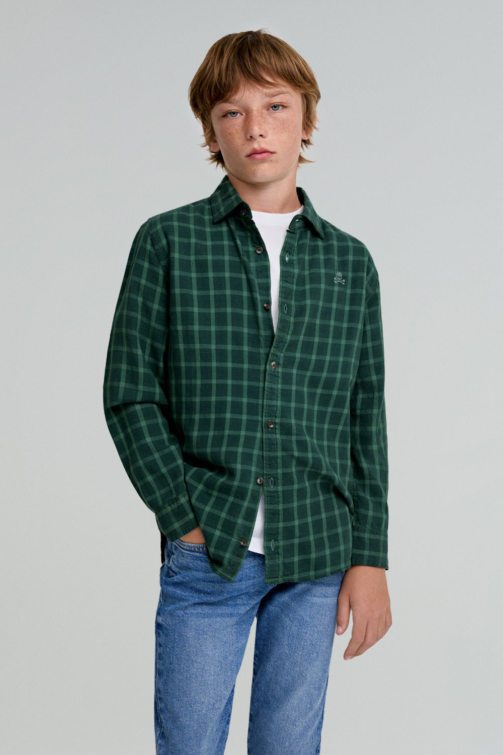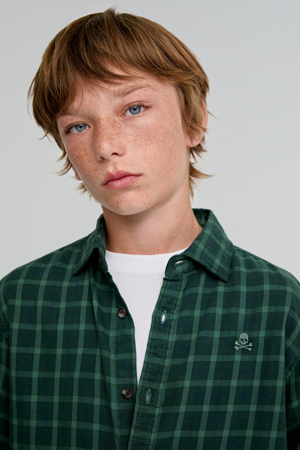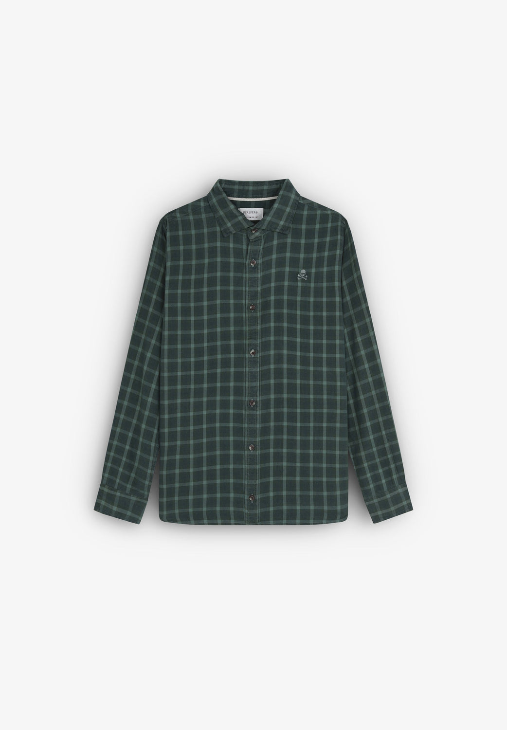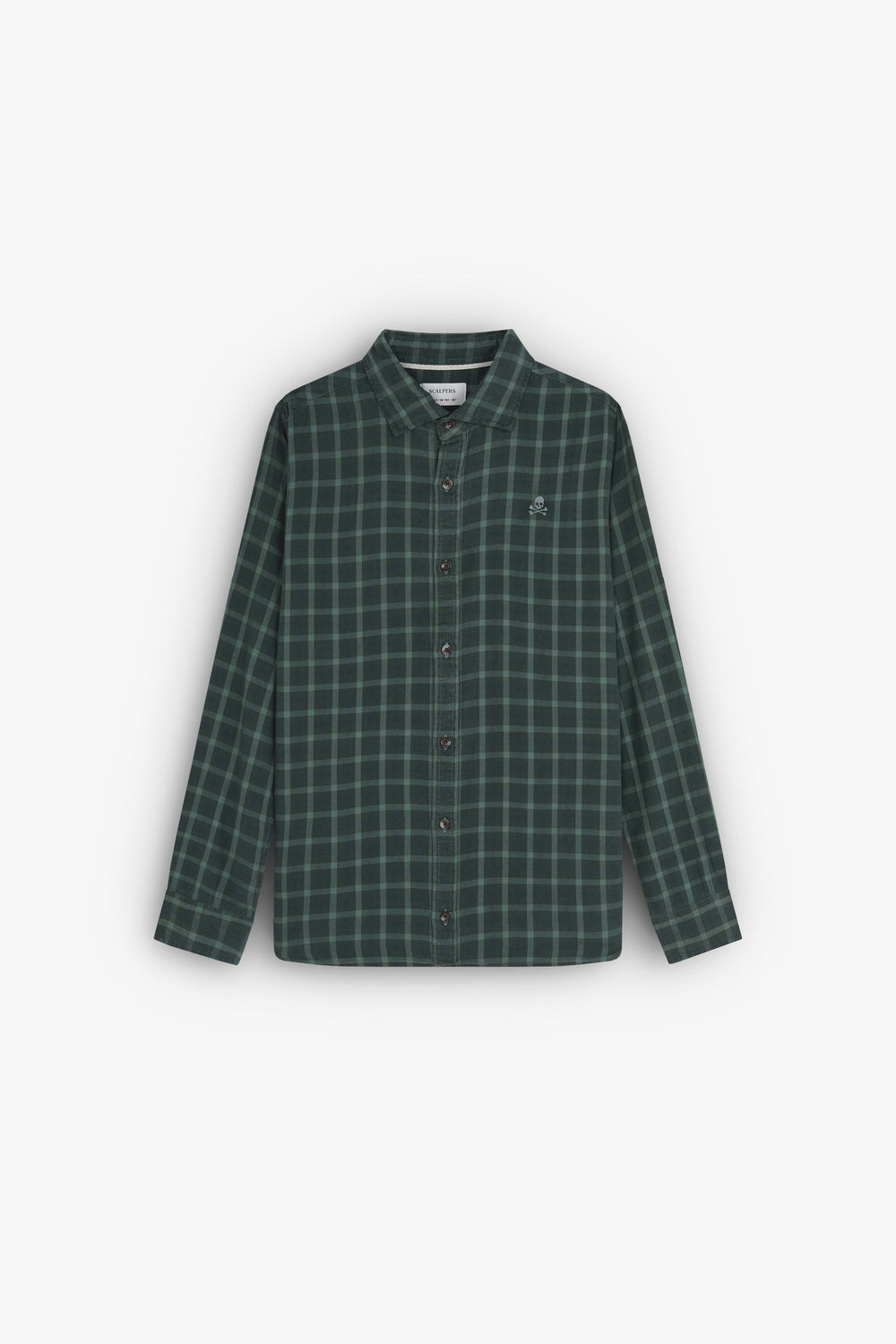 Camisa de cuadros confeccionada en 100% algodón BCI. Regular fit, cuello clásico y cierre con botones. Manga larga terminada en puño con botón. Calavera bordada.