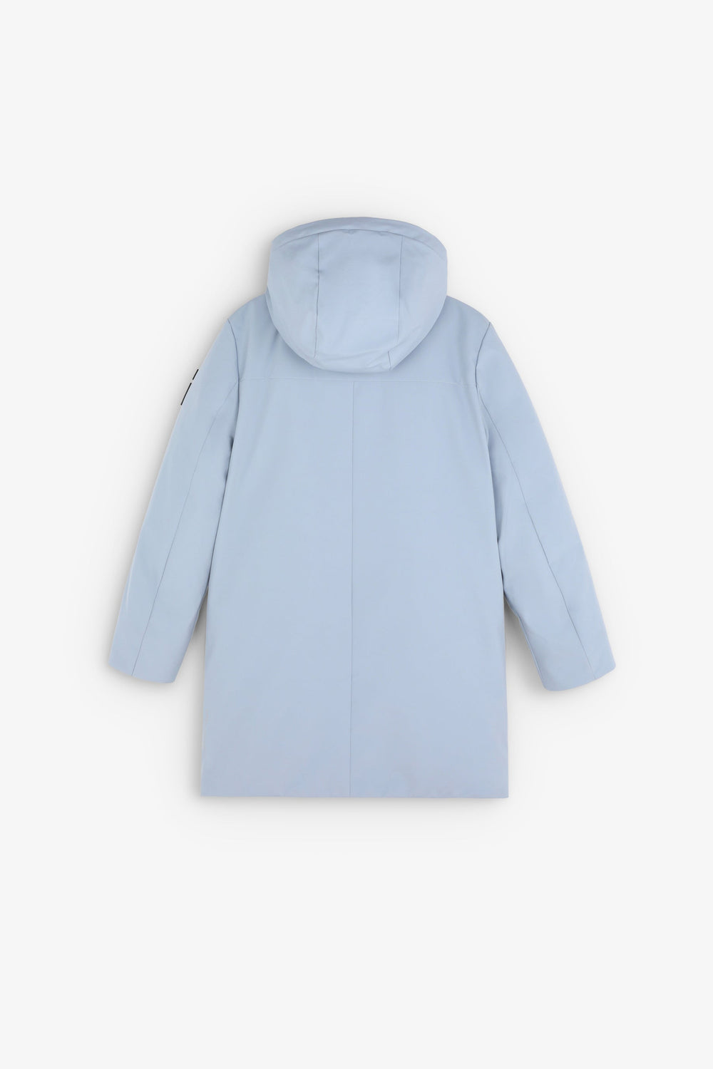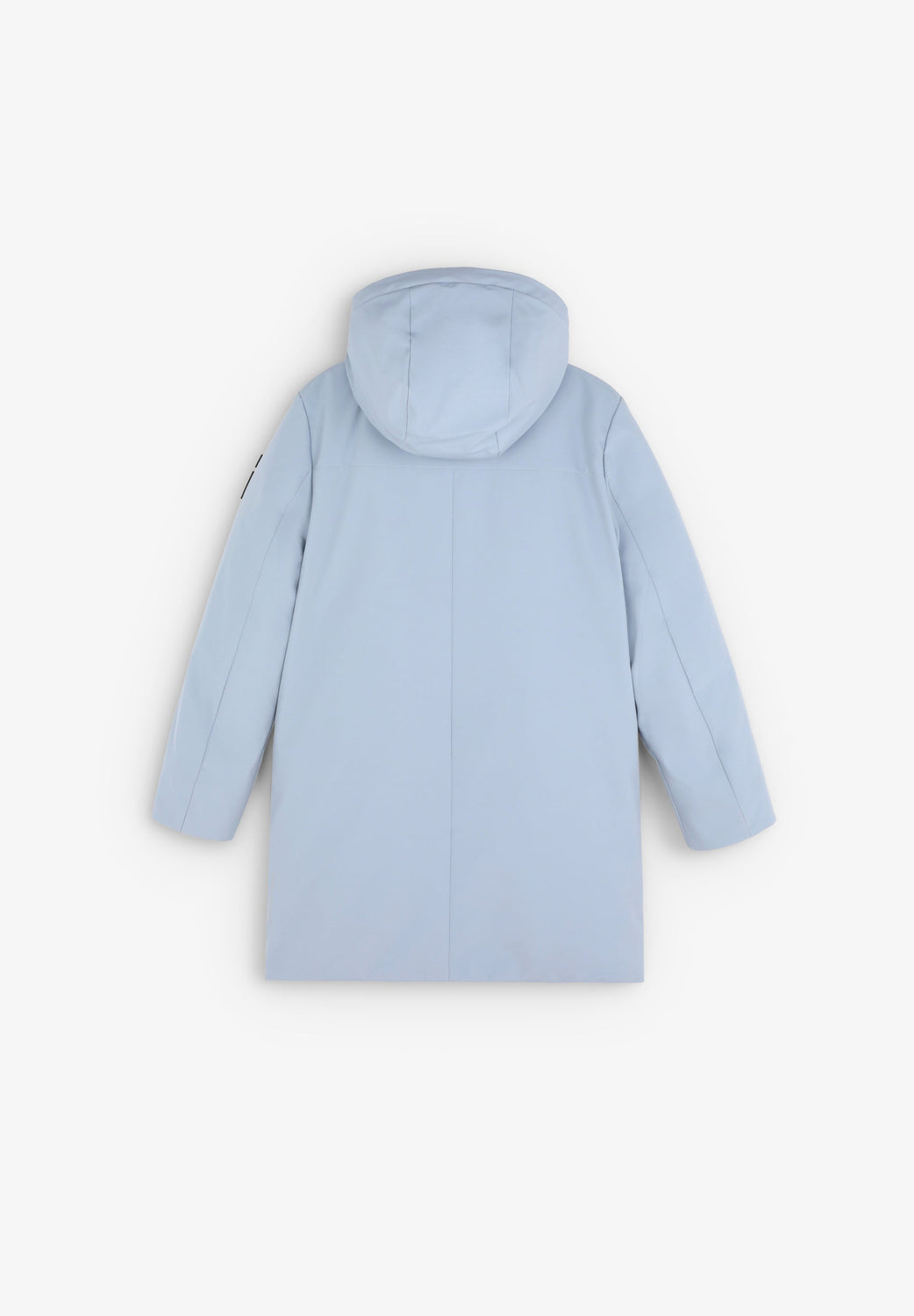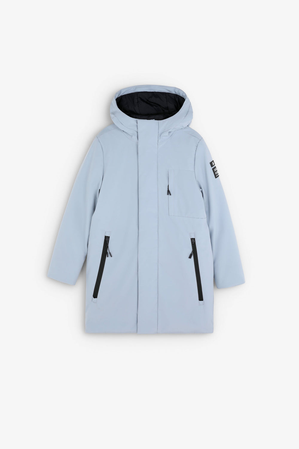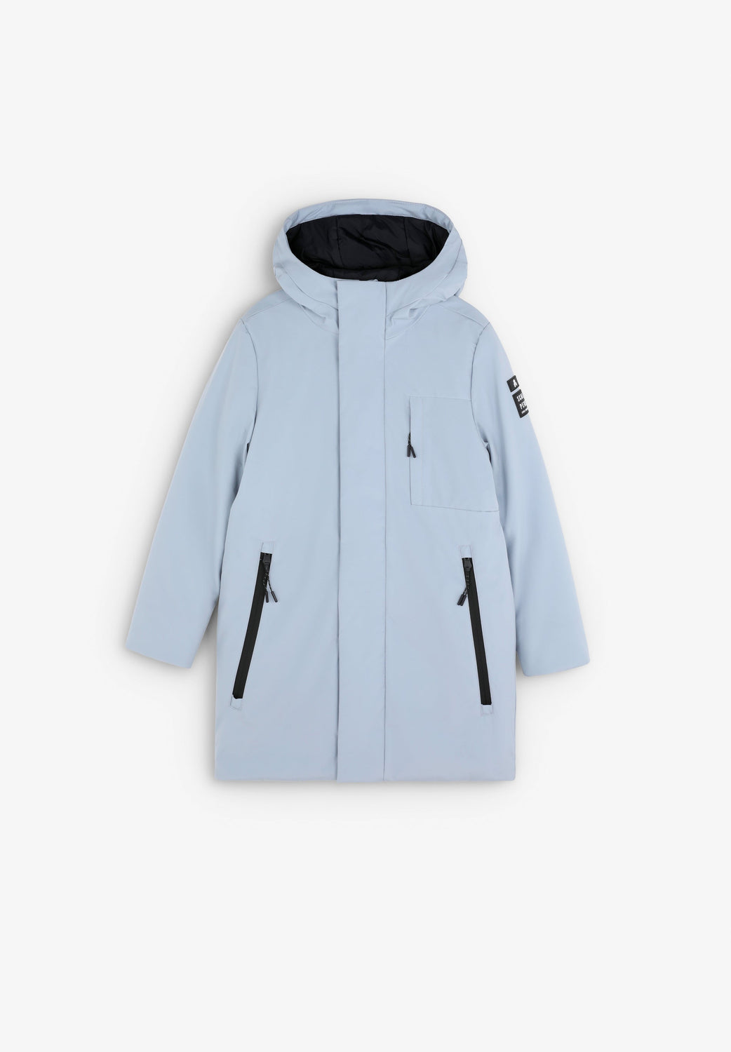 Parka larga confeccionada en tejido técnico reciclado. Regular fit, cierre con cremallera termosellada y tapeta y cuello con capucha. Manga larga y bolsillos con cremallera termosellada. Parche engomado lateral.