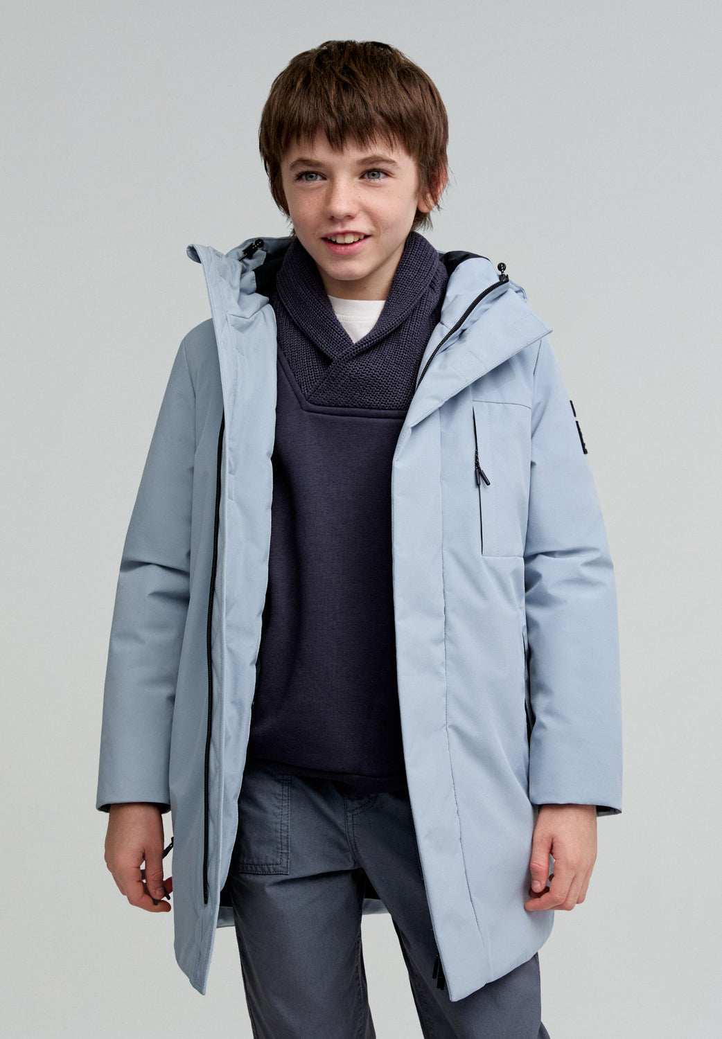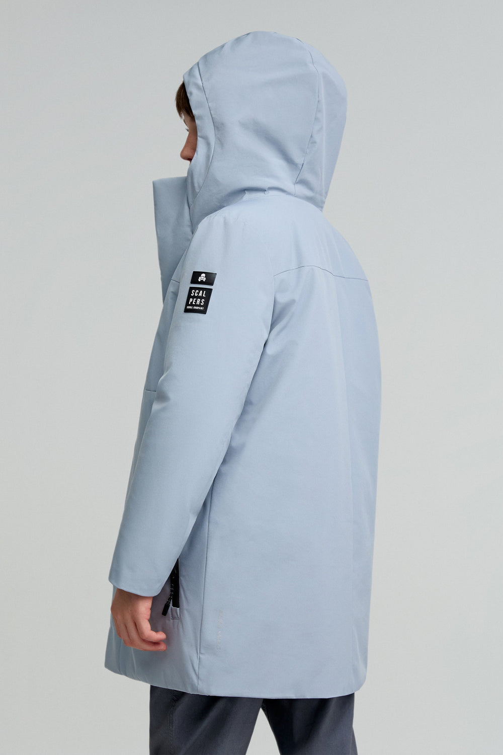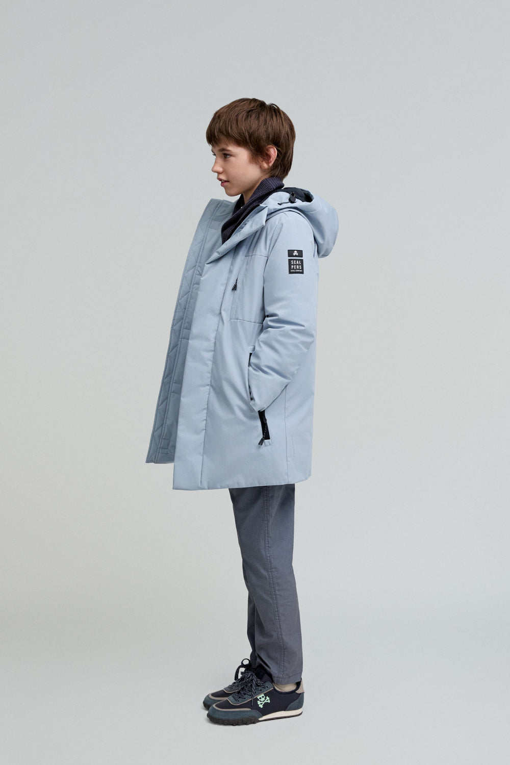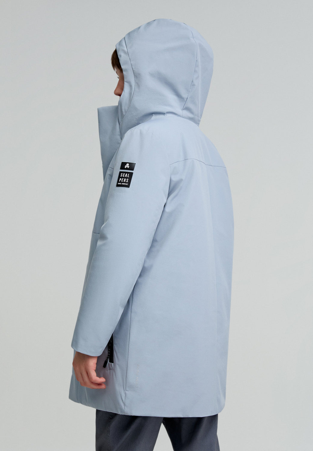 Parka larga confeccionada en tejido técnico reciclado. Regular fit, cierre con cremallera termosellada y tapeta y cuello con capucha. Manga larga y bolsillos con cremallera termosellada. Parche engomado lateral.
