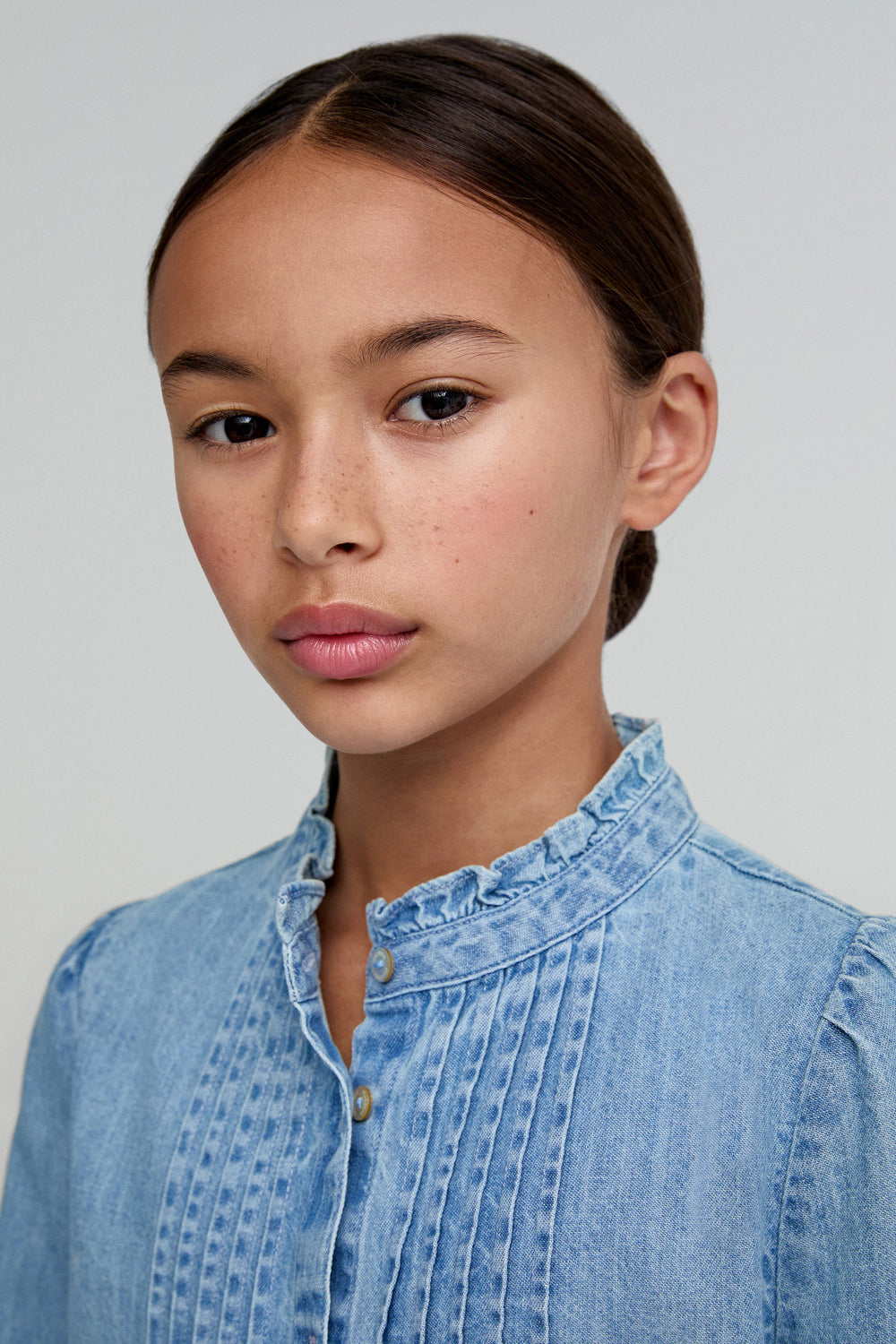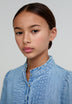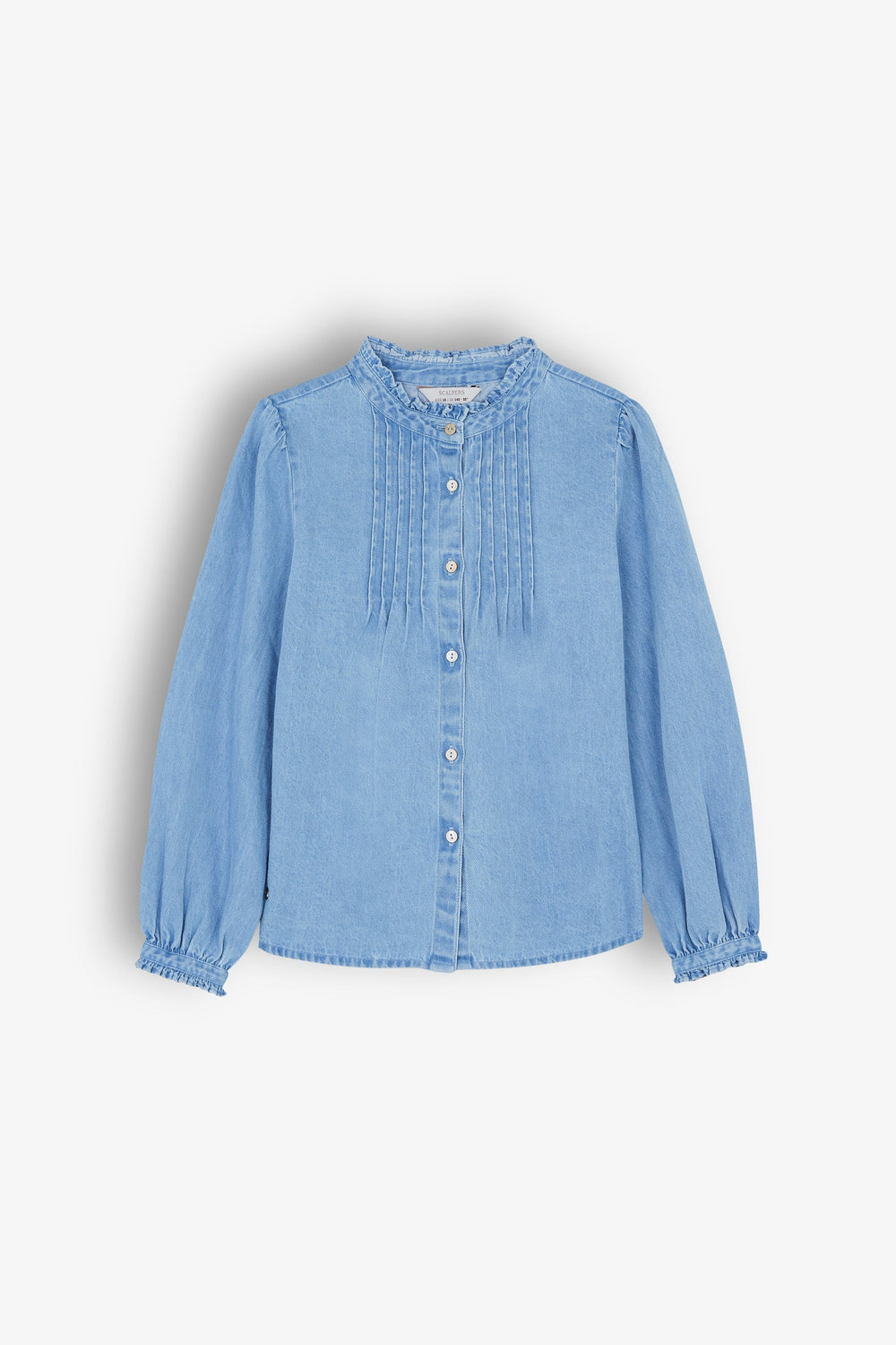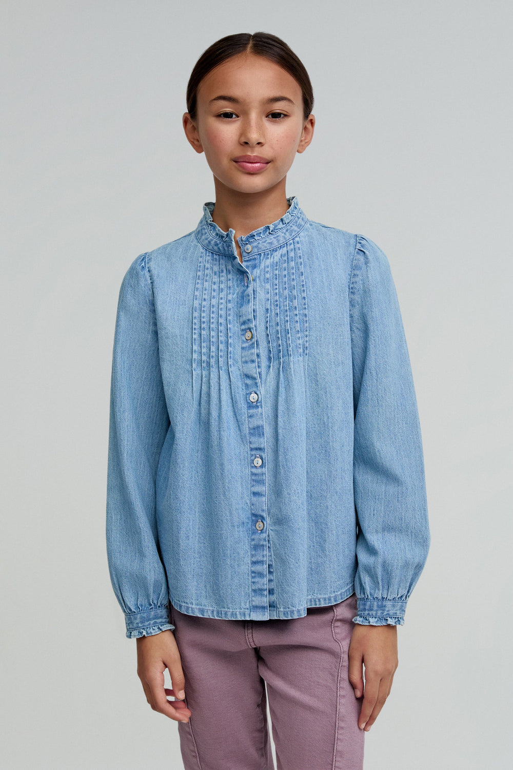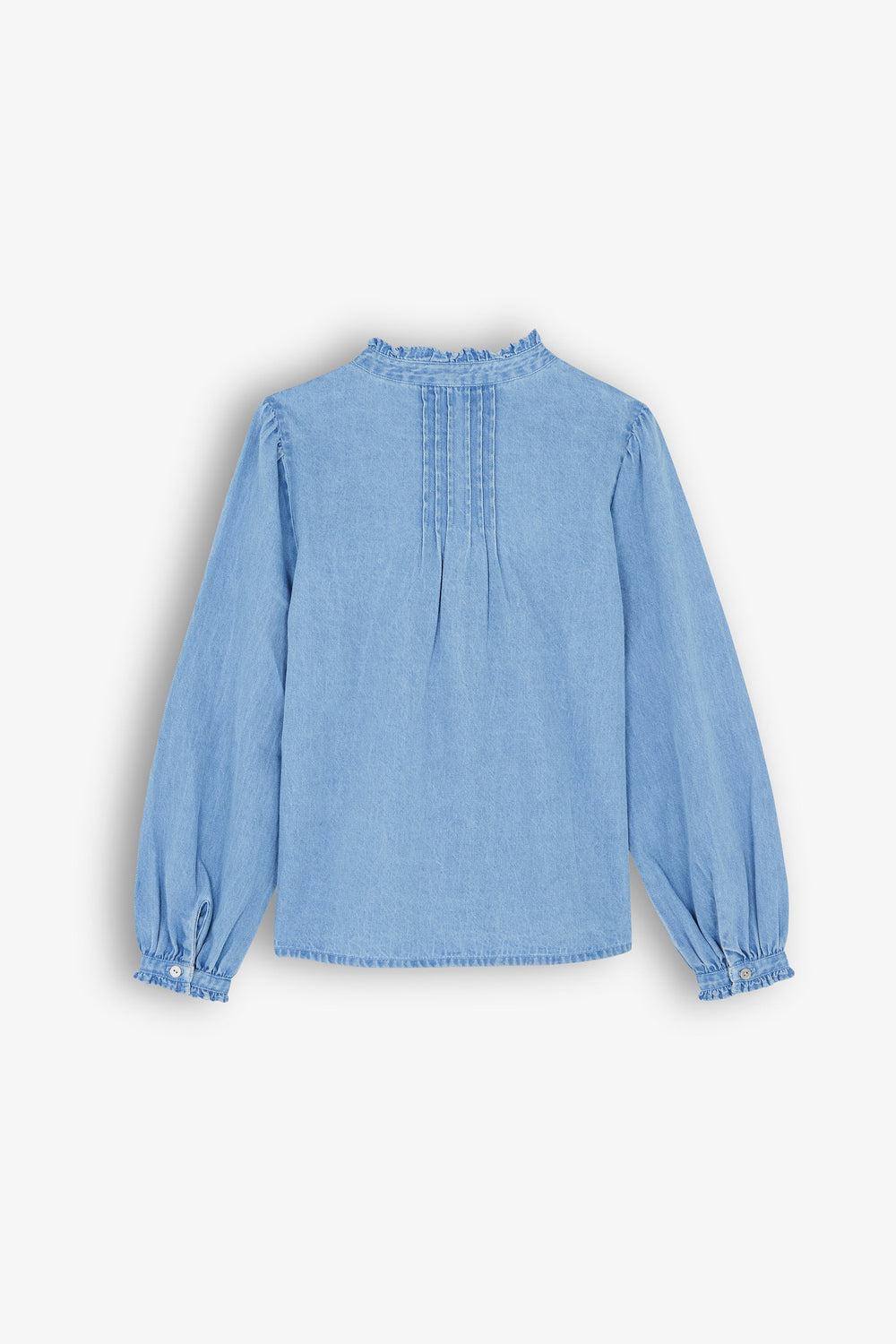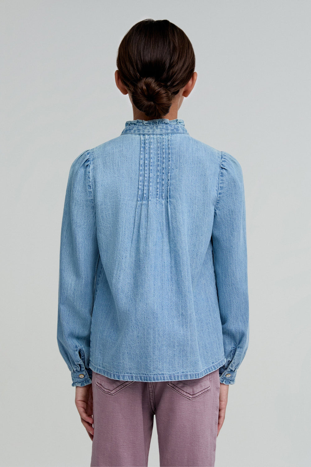 Camisa denim confeccionada en 100% algodón. Regular fit, cuello subido con volante y cierre con botones. Manga larga terminada en puño con botón y volante y jaretas en la parte frontal.