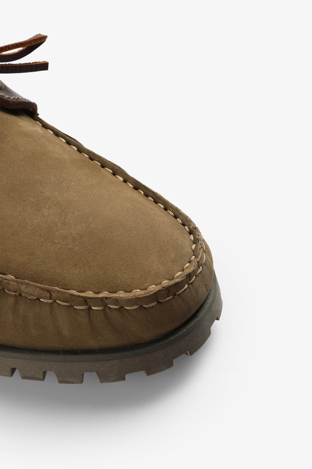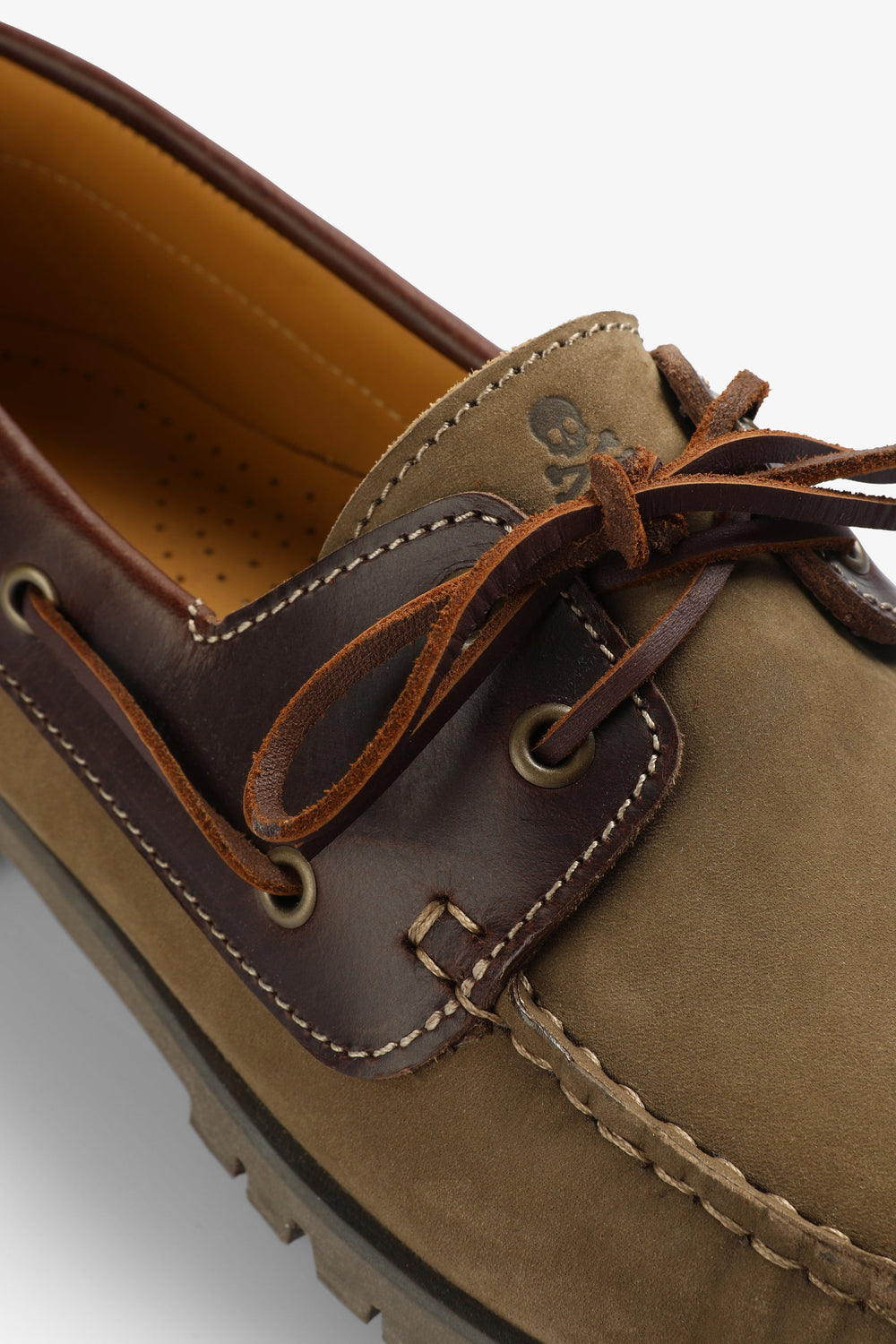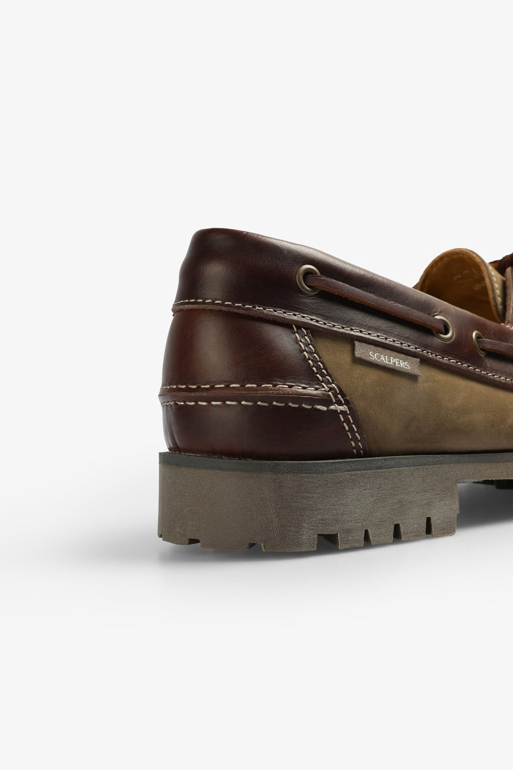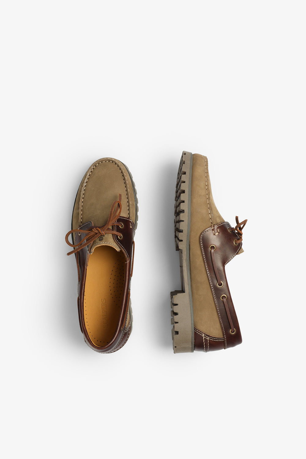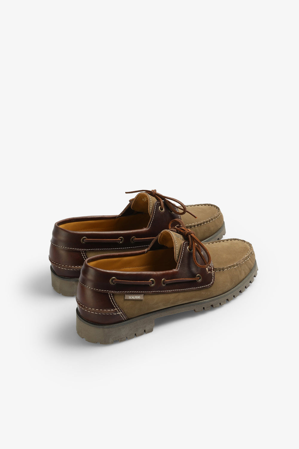 Zapatos tipo náuticos confeccionados en mezcla de pieles. Cierre con cordones, suela dentada pronunciada. Etiqueta lateral.