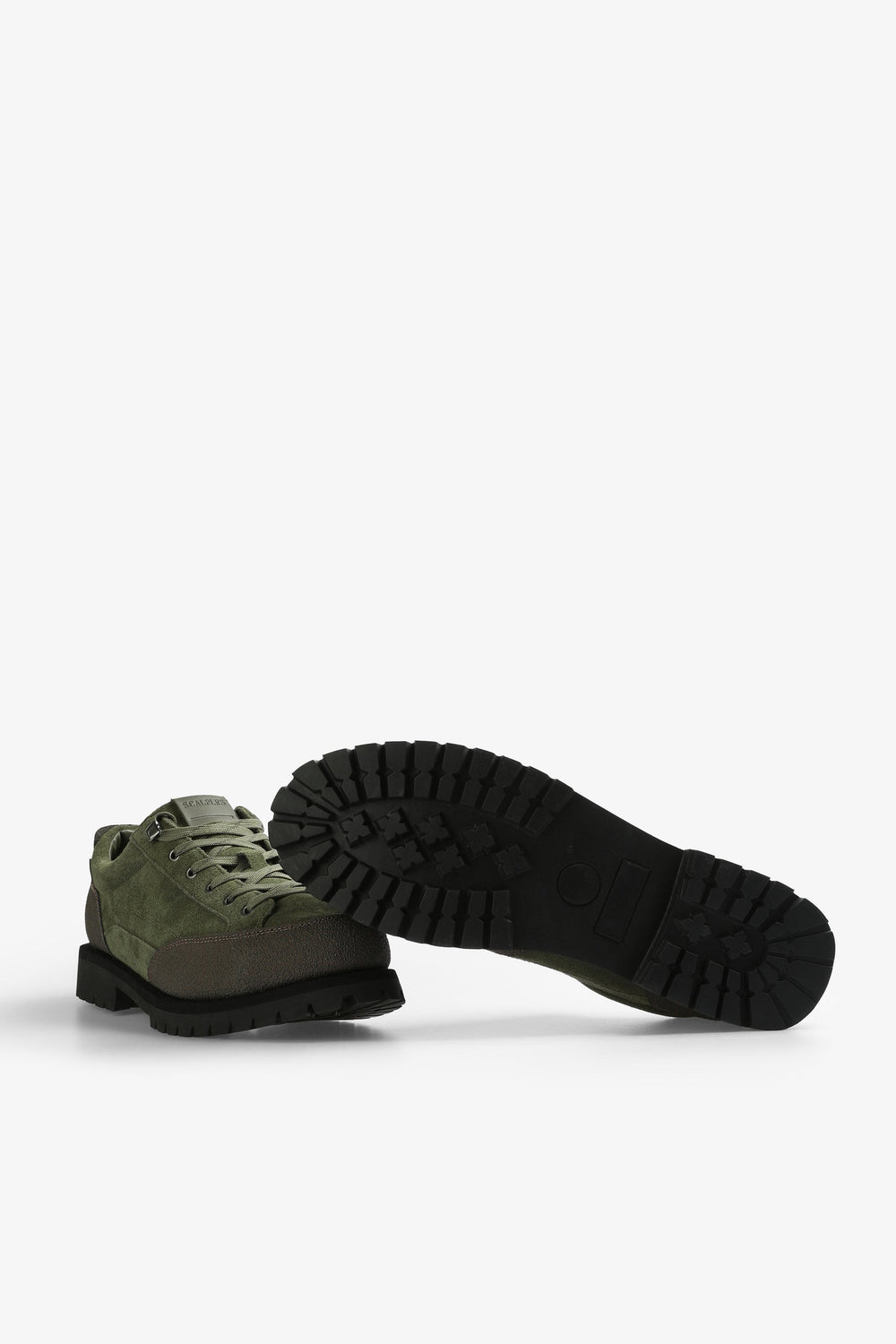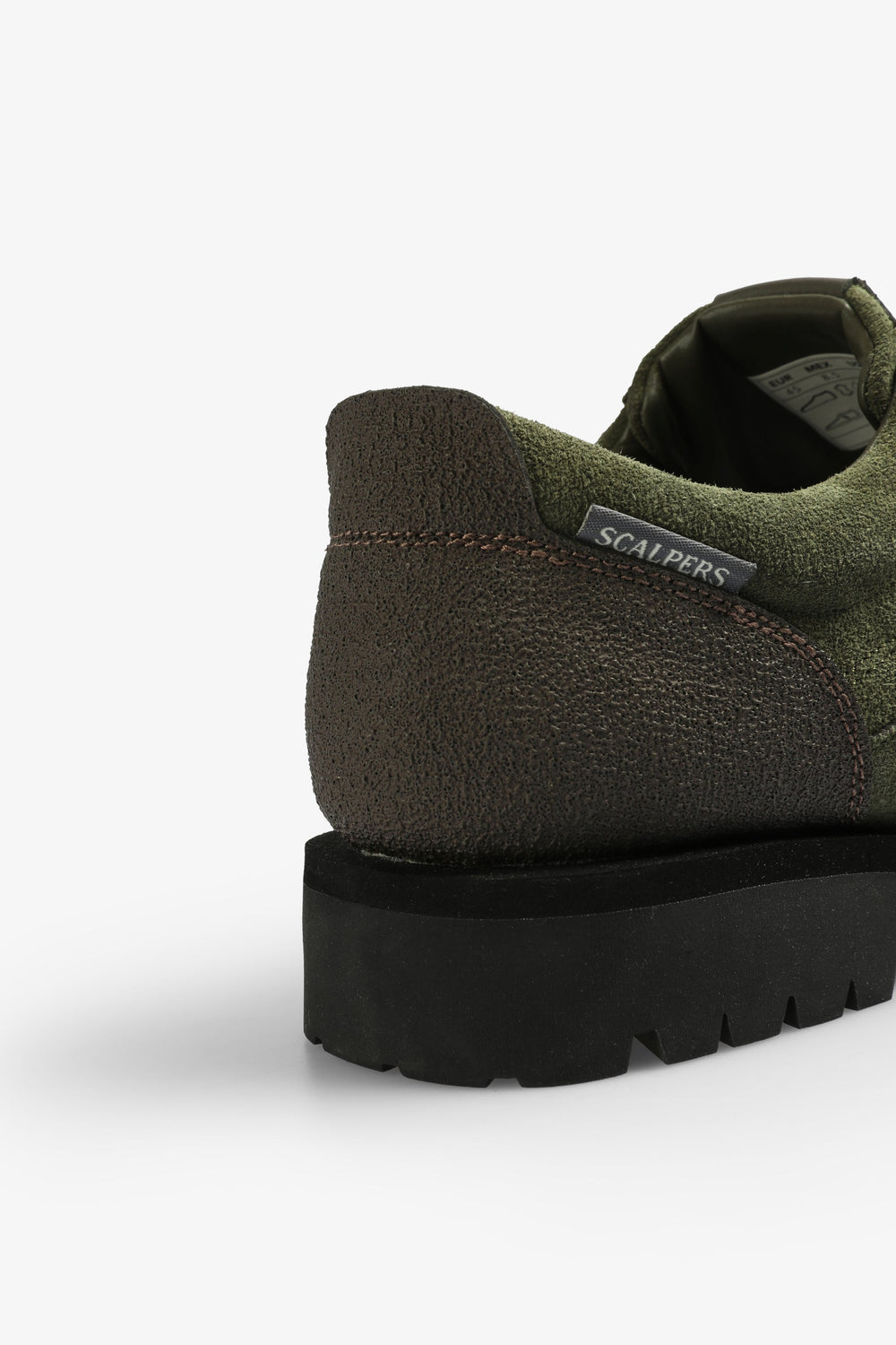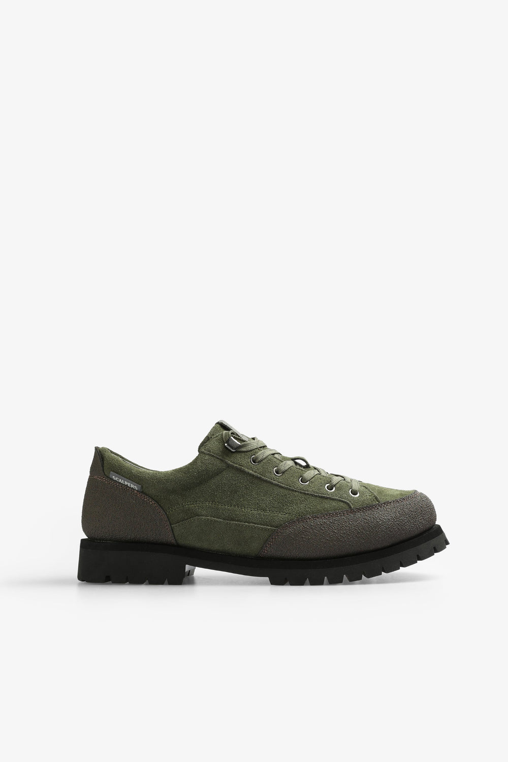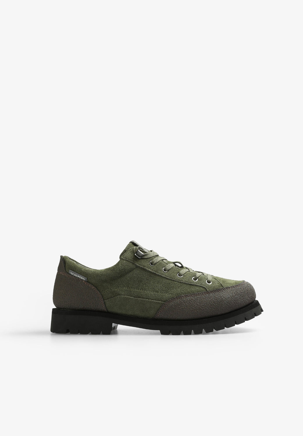 Zapatos confeccionados en 100% piel terminados en ante. Cierre con cordones tipo bota y suela de goma pronunciada dentada. Detalle de etiqueta lateral.