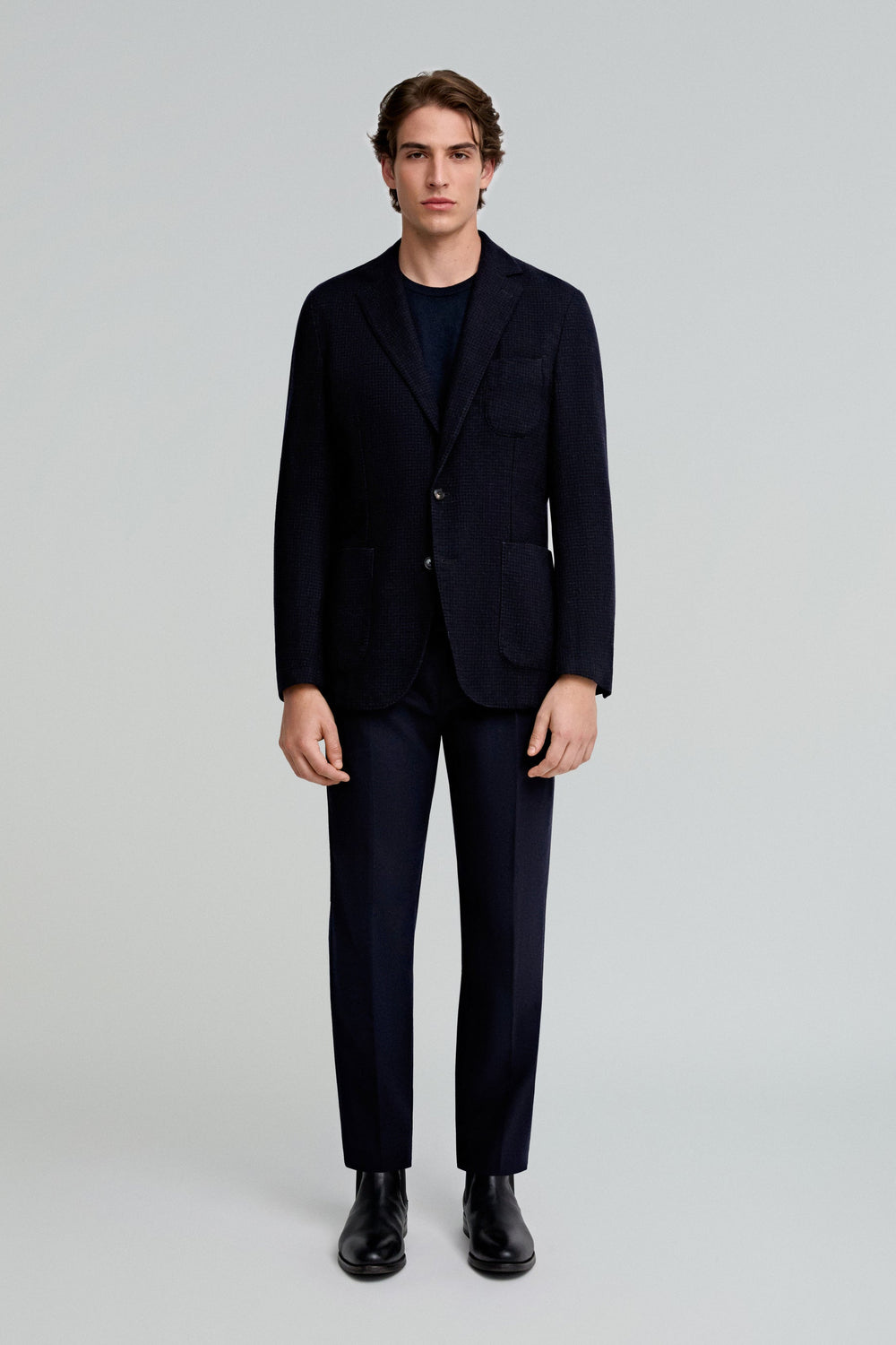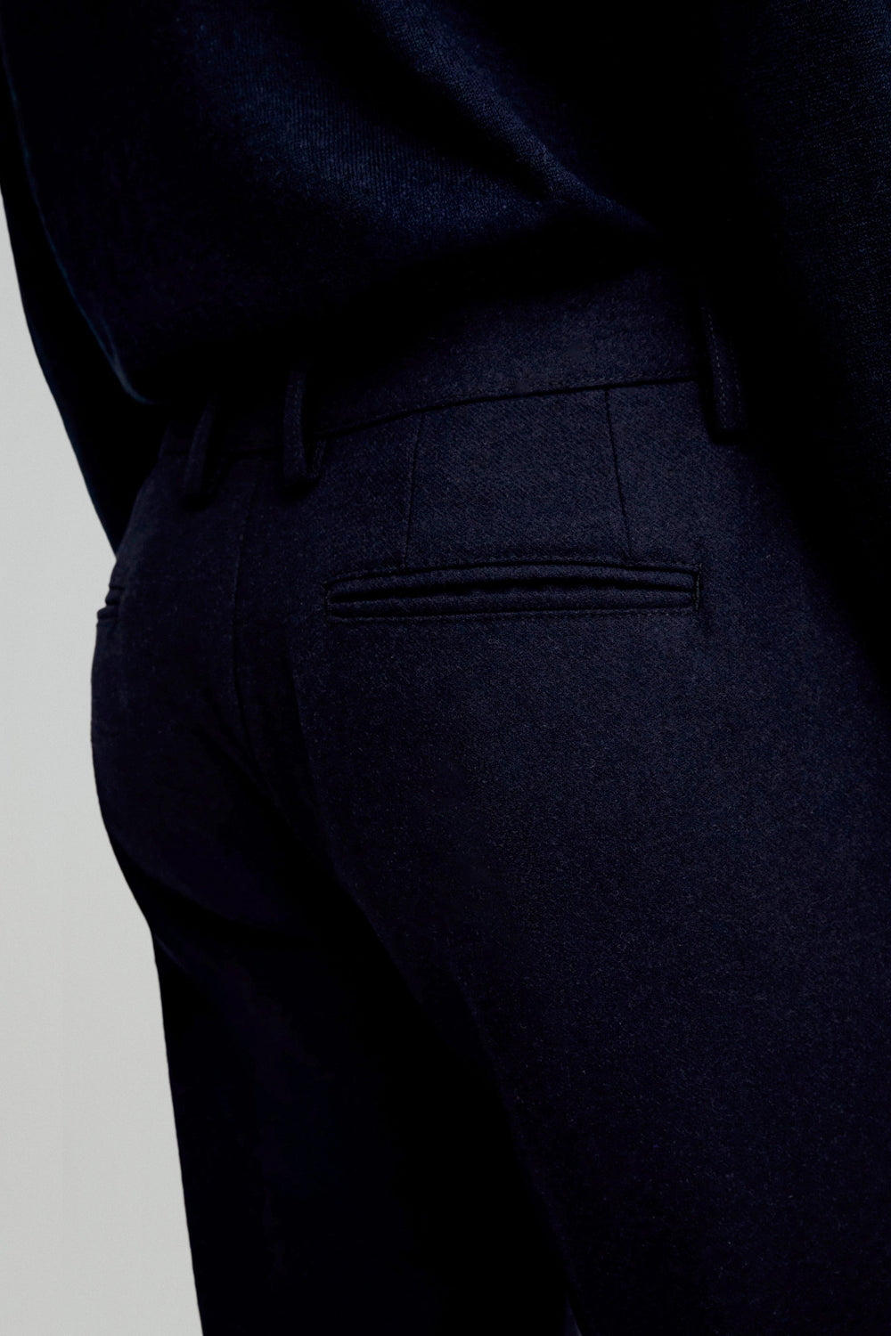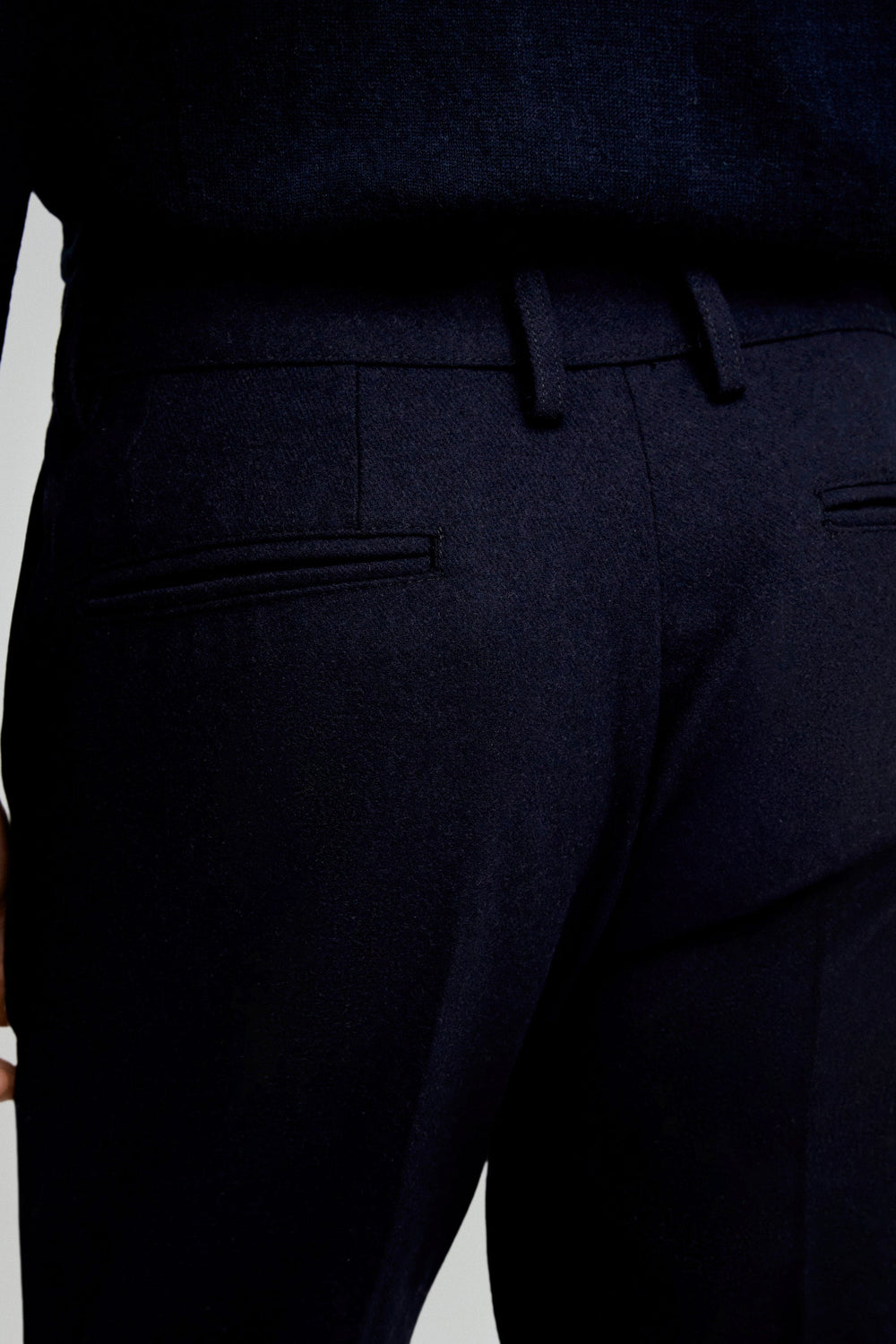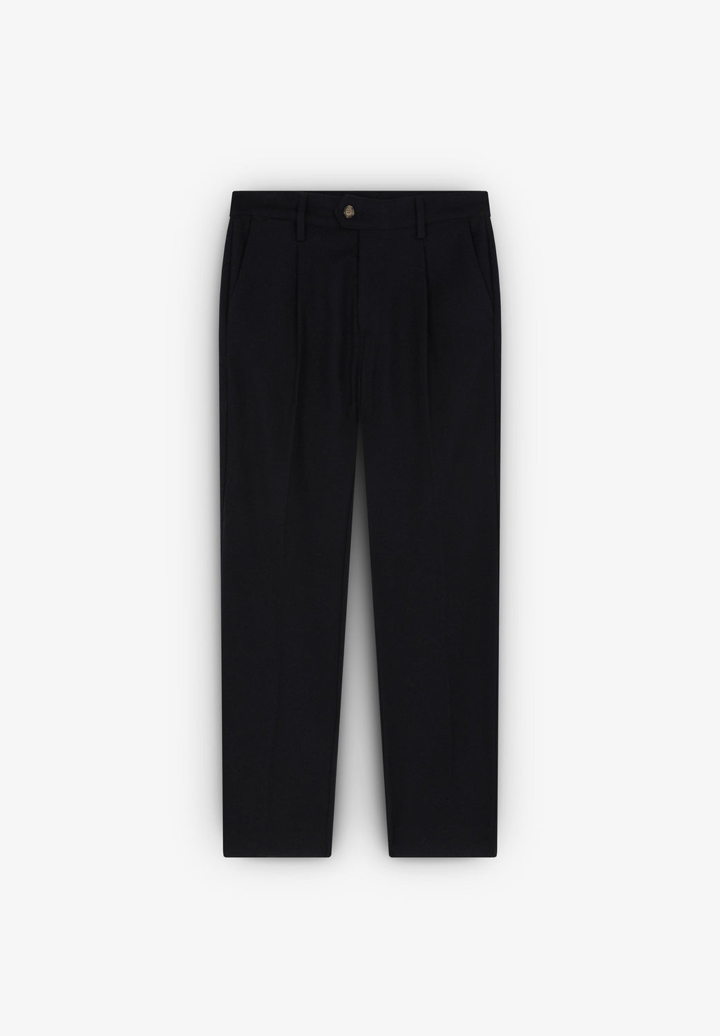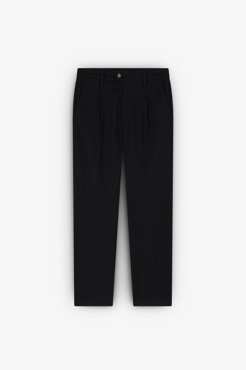 Pantalón confeccionado en mezcla de lana. Regular fit con pinzas, cierre prolongado con botón y cremallera. Bolsillos laterales y trabillas en cintura.