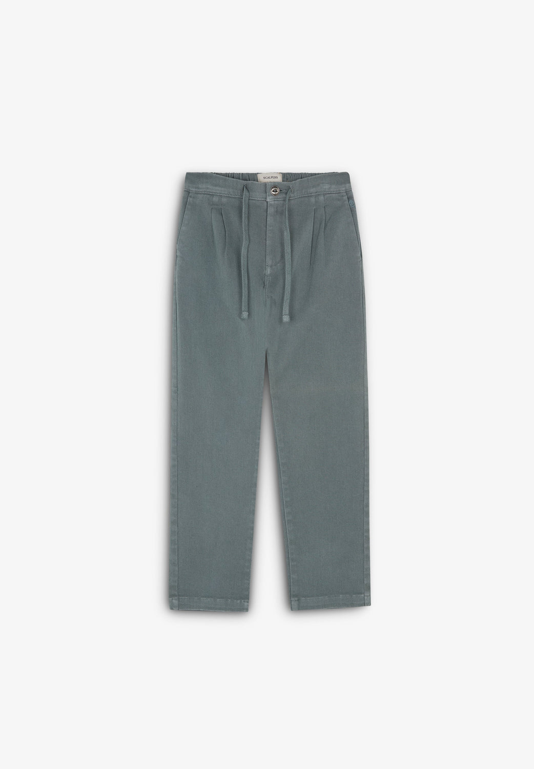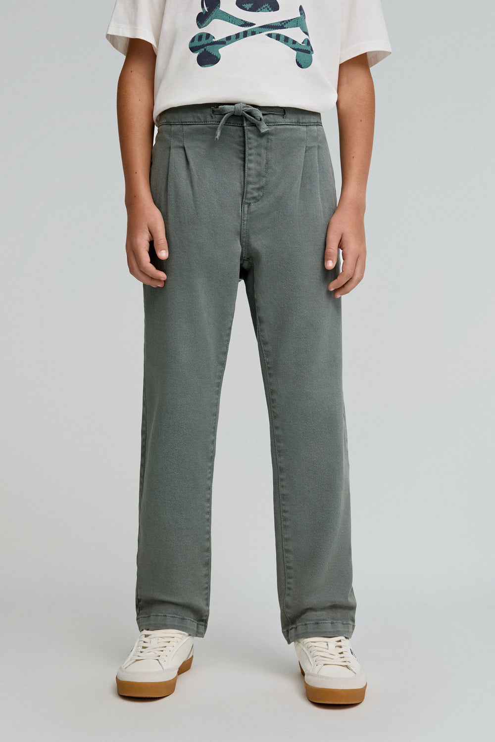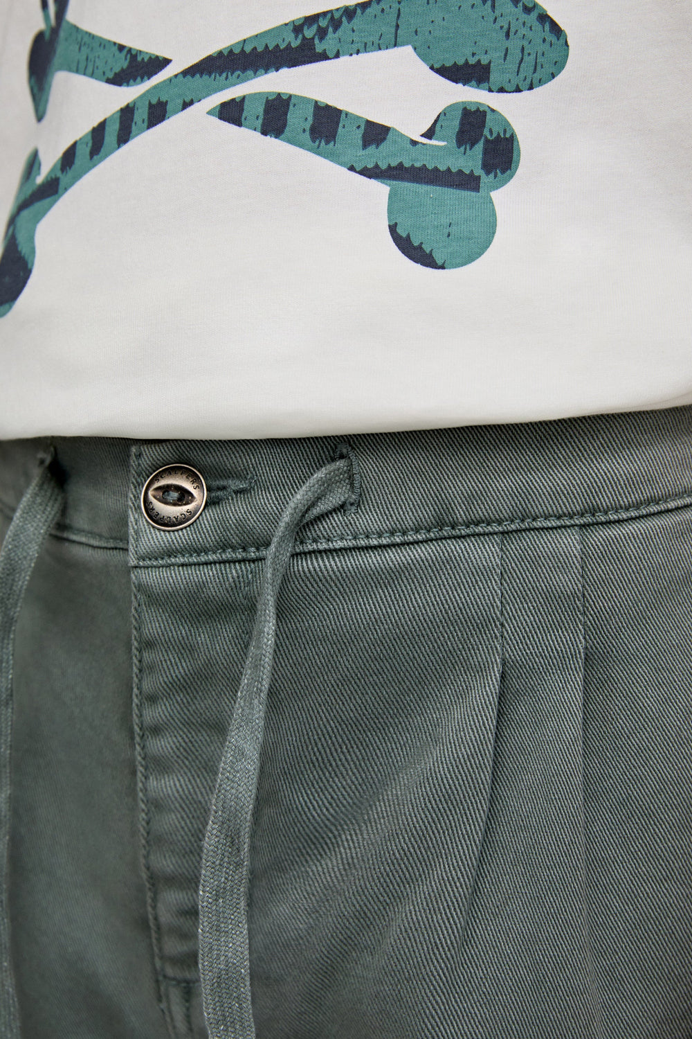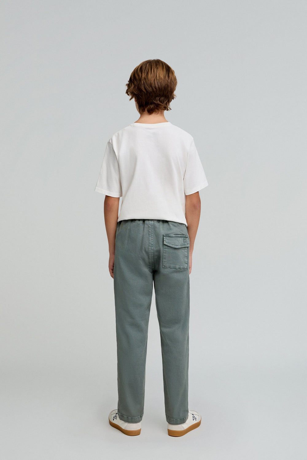 Pantalón confeccionado en algodón BCI ligeramente elástico. Corte recto con pinzas, cierre con botón y cremallera y cordones. Bolsillos laterales y trasero con tapeta.