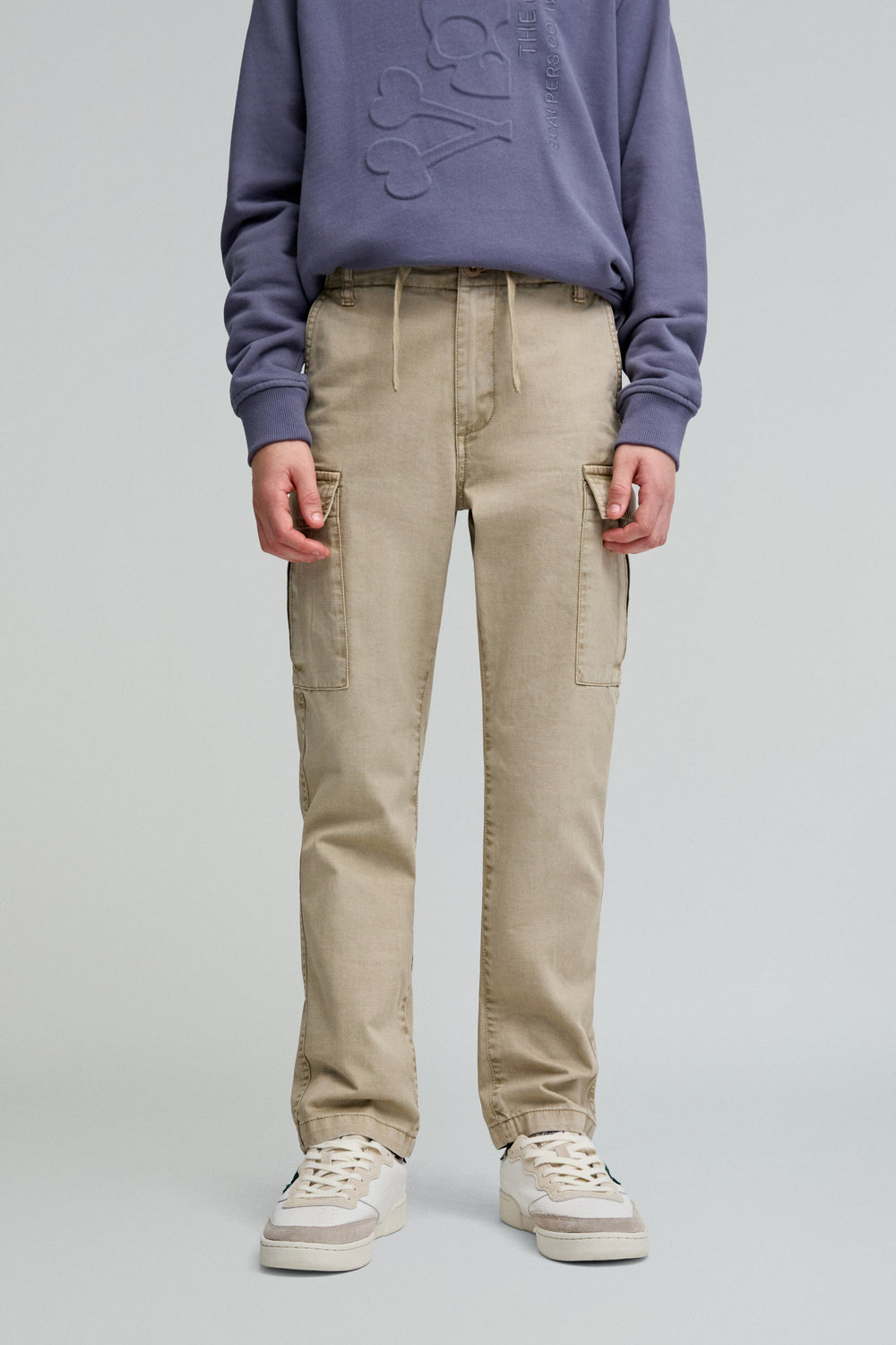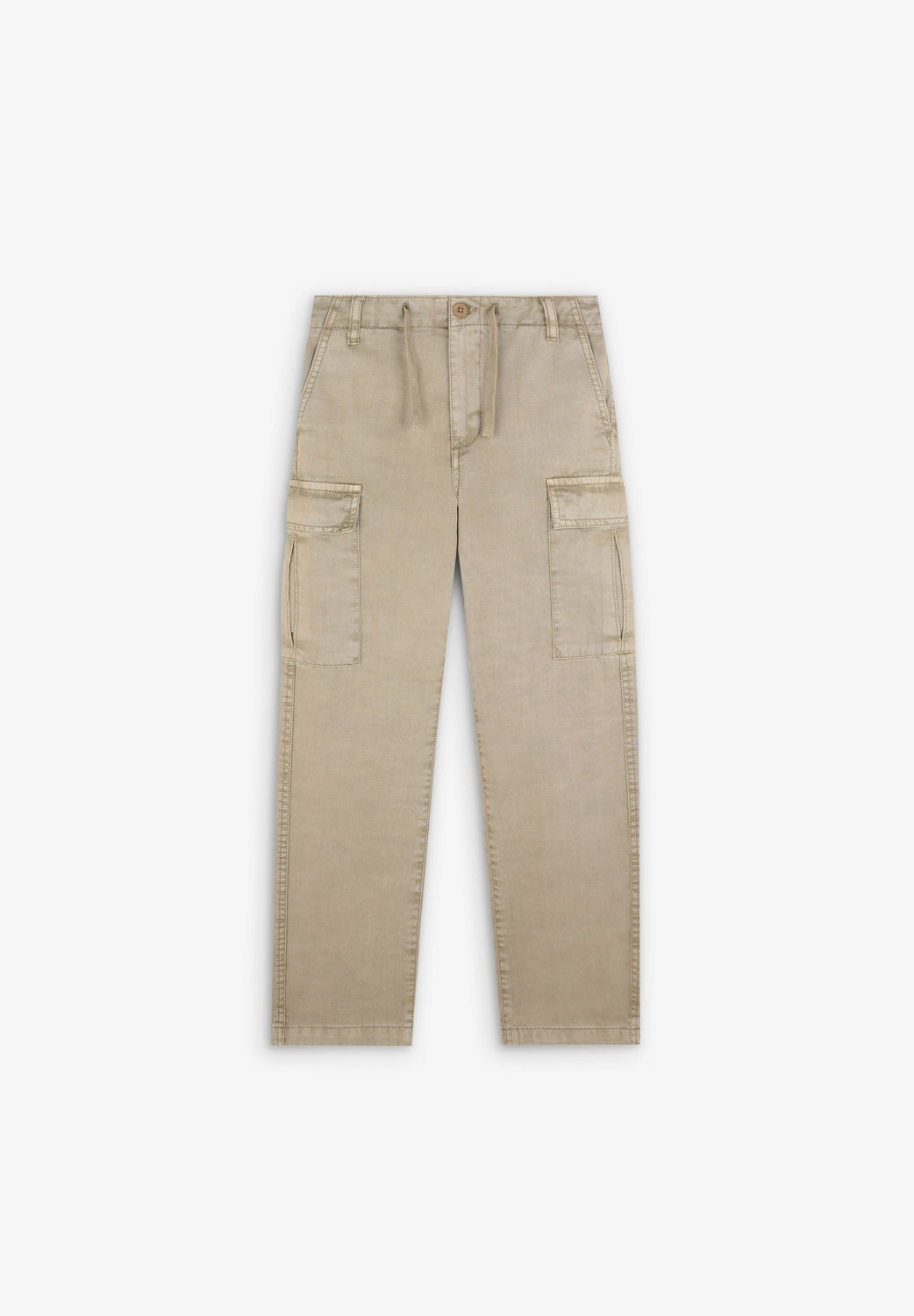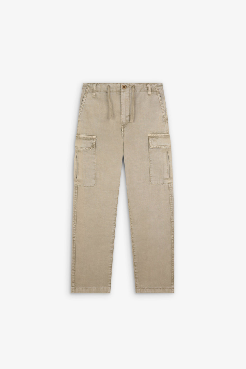 Pantalón cargo confeccionado en 100% algodón BCI. Corte recto, cierre con botón y cremallera y cordones en cintura. Trabillas en cintura y bolsillos en pernera y laterales.