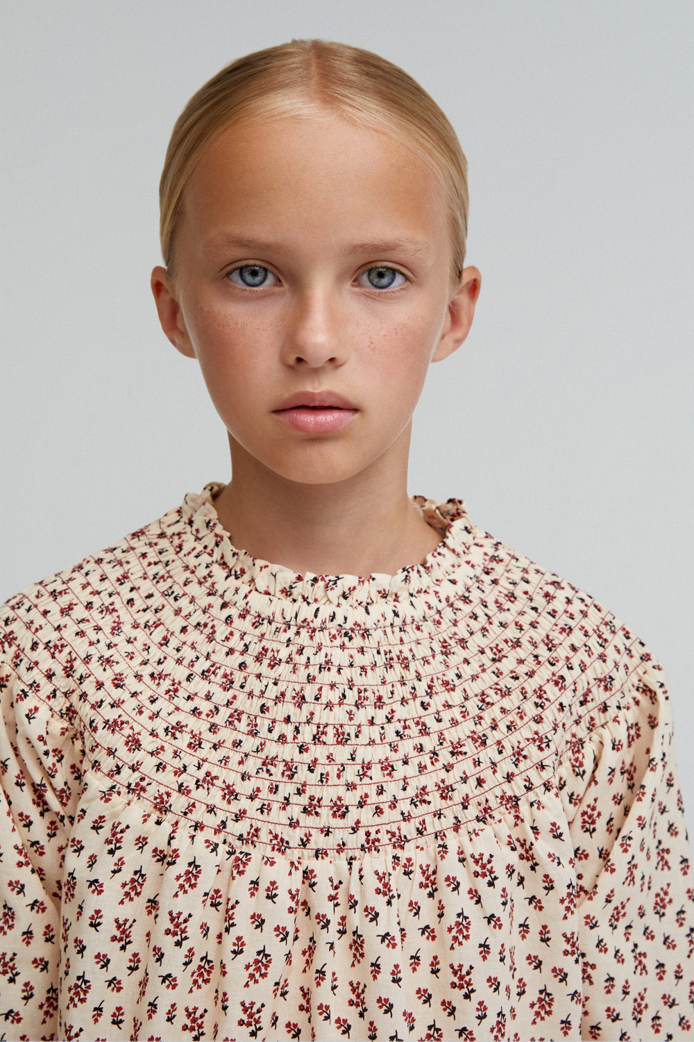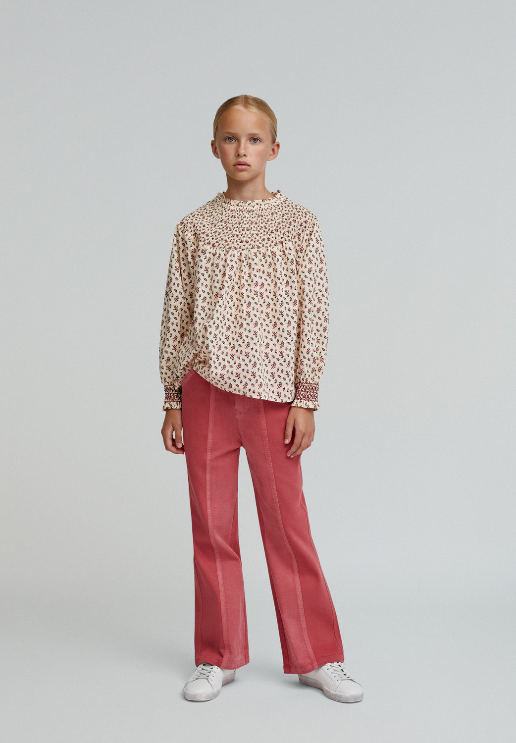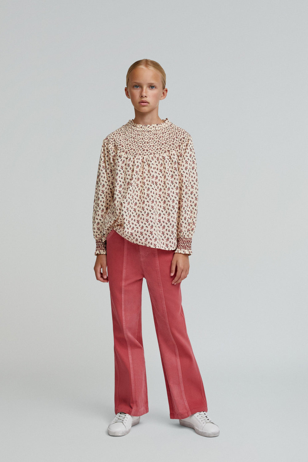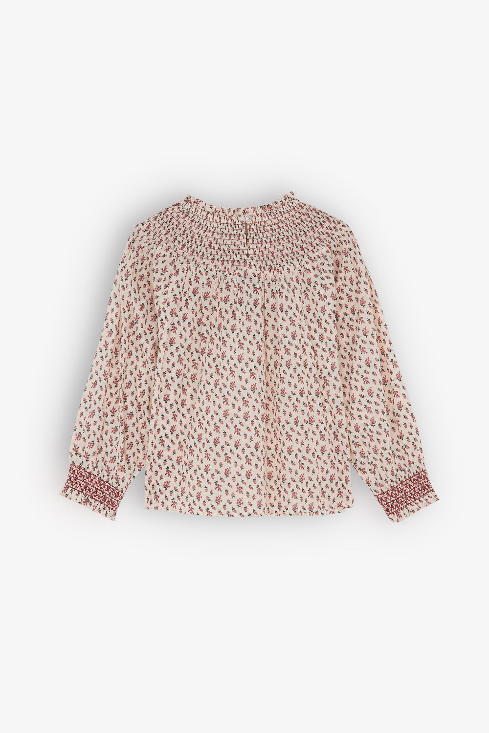 Blusa de flores confeccionada en 100% algodón BCI. Regular fit, cuello con volante y cierre trasero con botón. Manga larga terminada en puño y detalle de nido de abeja en escote y puños.