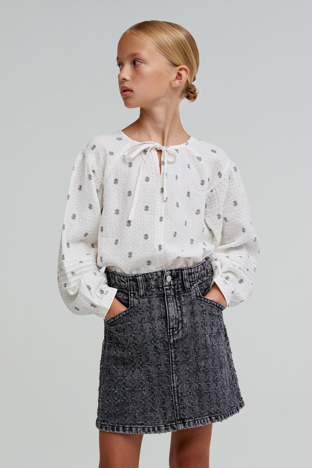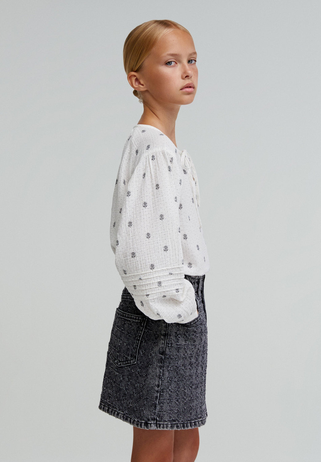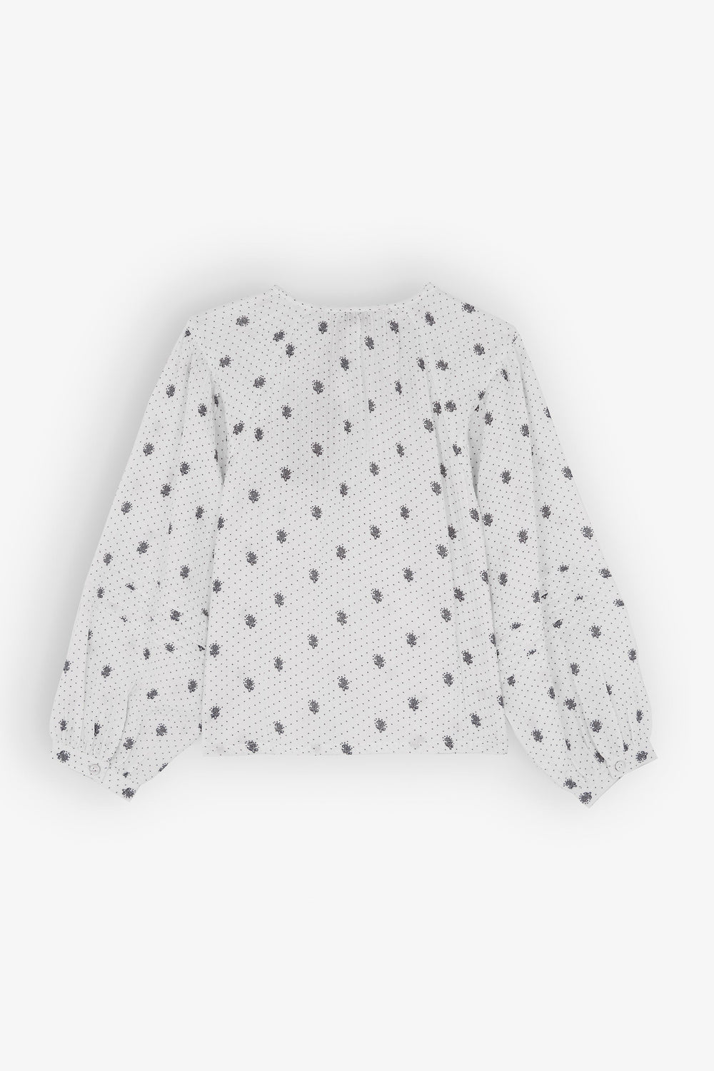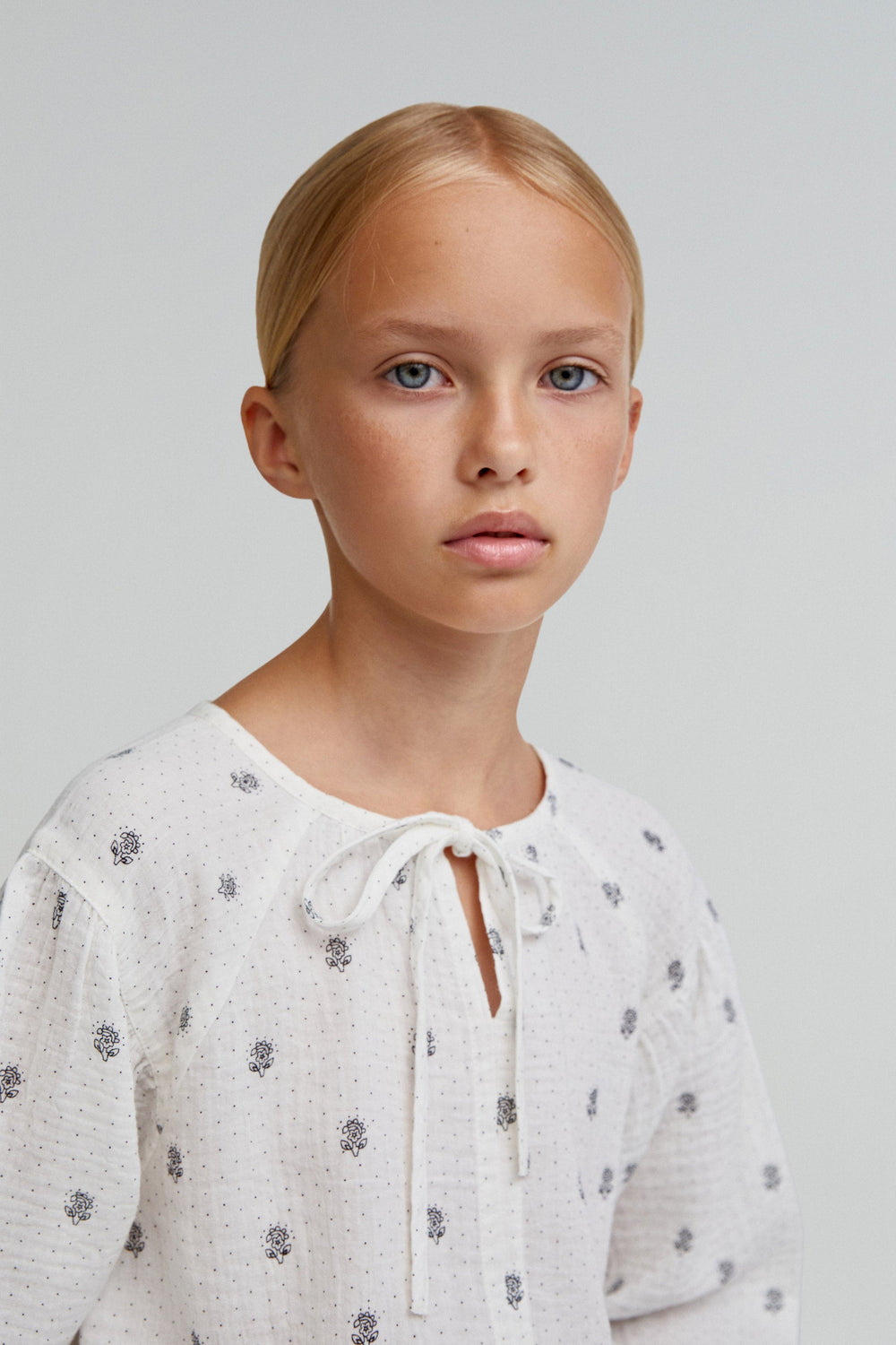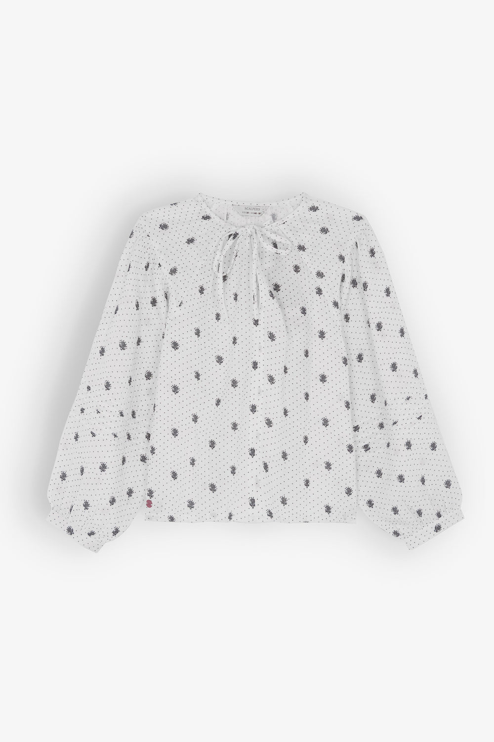 Blusa con print confeccionada en 100% algodón BCI. Regular fit, cuello redondo con lazada y manga larga abullonada con detalle de jaretas.