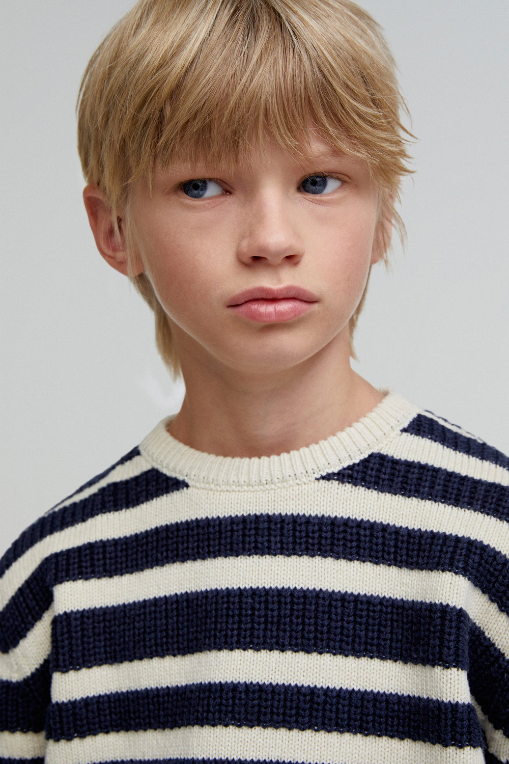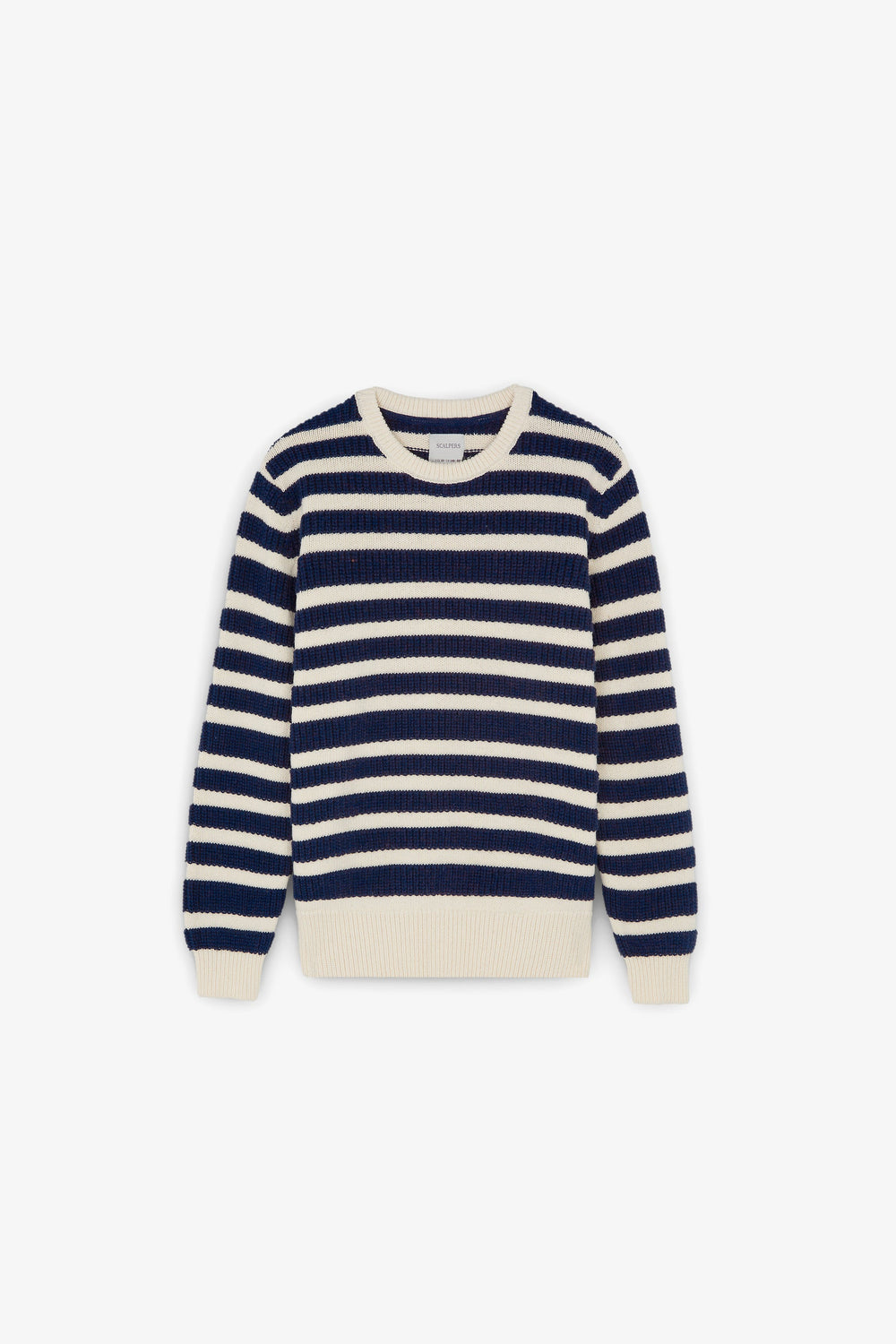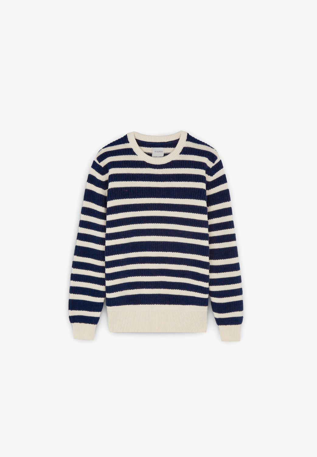 Jersey de rayas confeccionado en mezcla de algodón y lana. Regular fit, cuello redondo y manga larga.