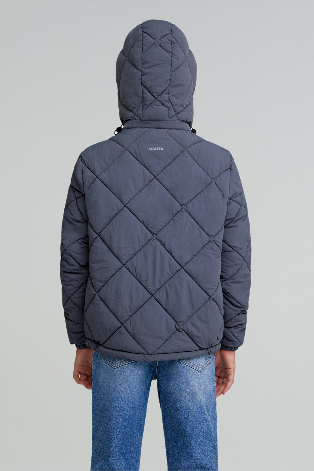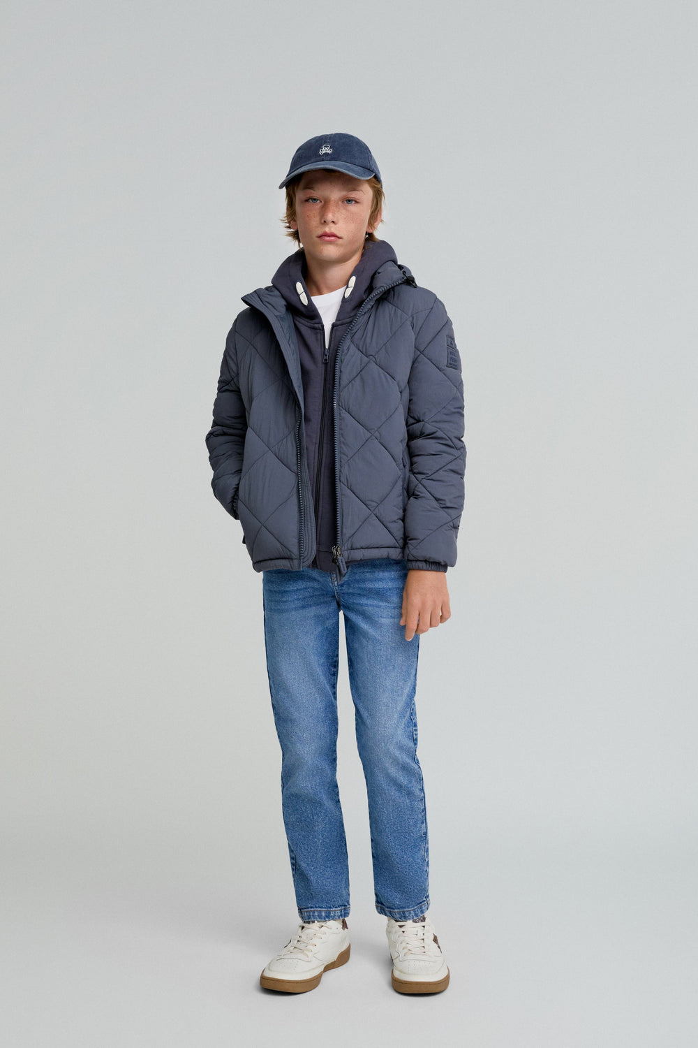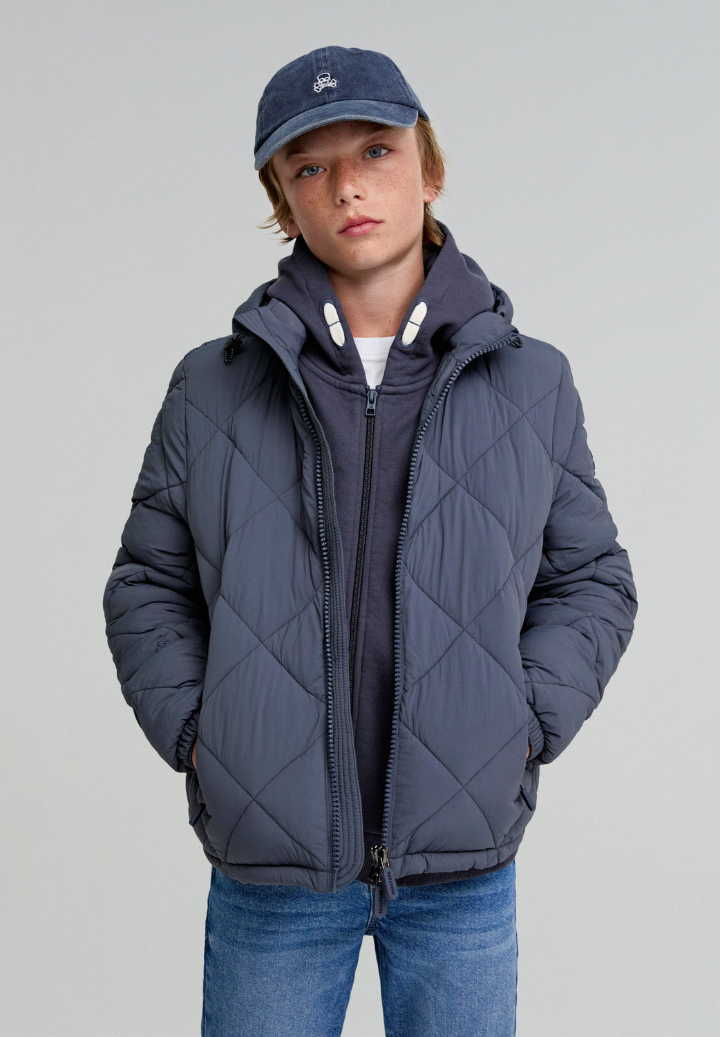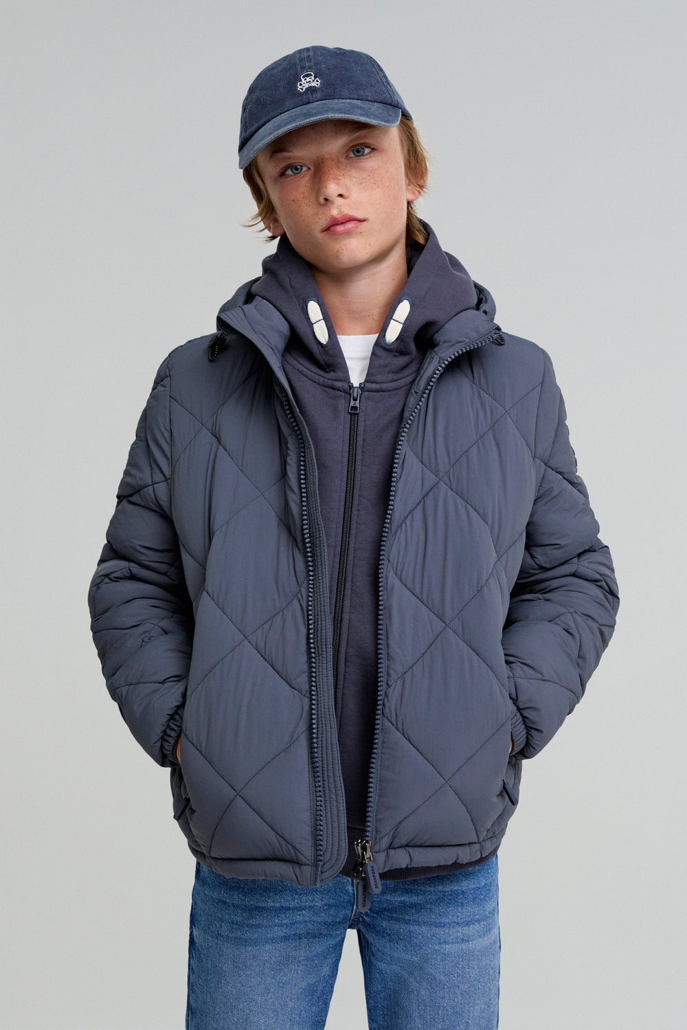 Abrigo acolchado confeccionado en tejido técnico. Regular fit, cuello subido y con capucha ajustable y desmontable y cierre con cremallera de doble carro. Manga larga terminada en puño con elástico y bolsillos con cremallera.