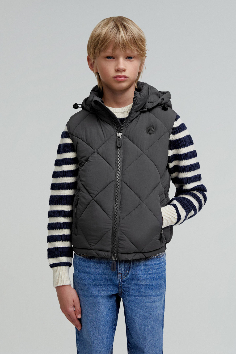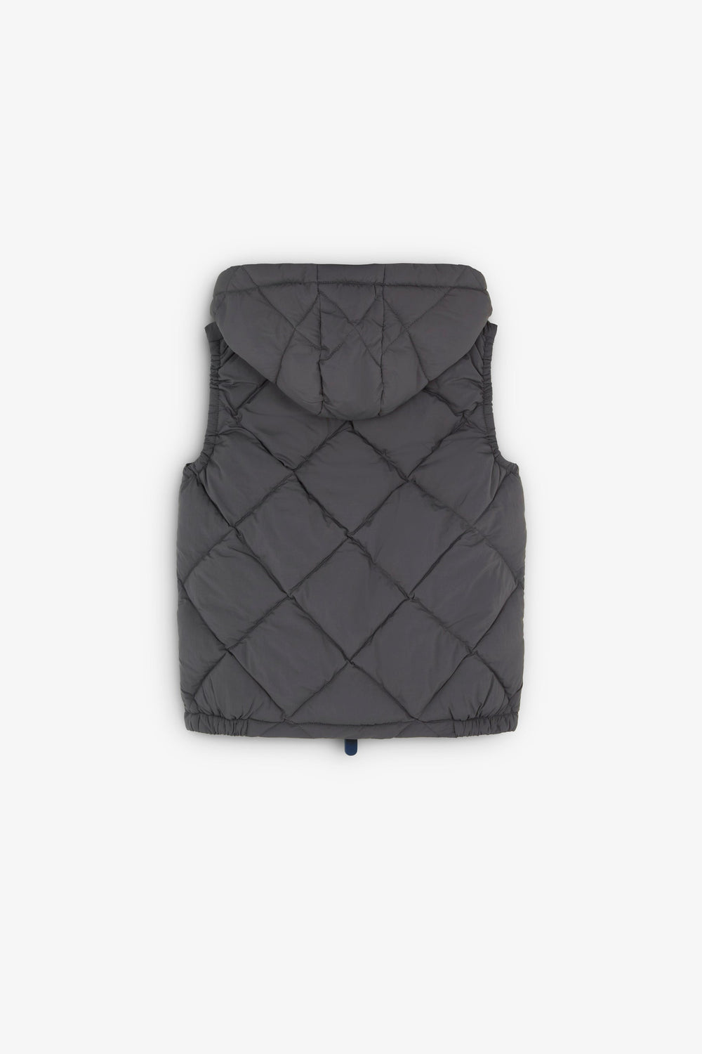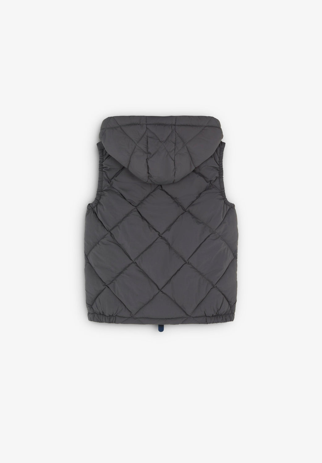 Chaleco acolchado con capucha desmontable y ajustadores. Confeccionado en tejido técnico. Corte Regular fit. Cuello subido con protector de barbilla y capucha. Cierre con cremallera de doble carro. Manga en sisa. Bolsillo laterales con cremallera y bolsillo interior. Detalle de parche de goma en el pecho a tono.