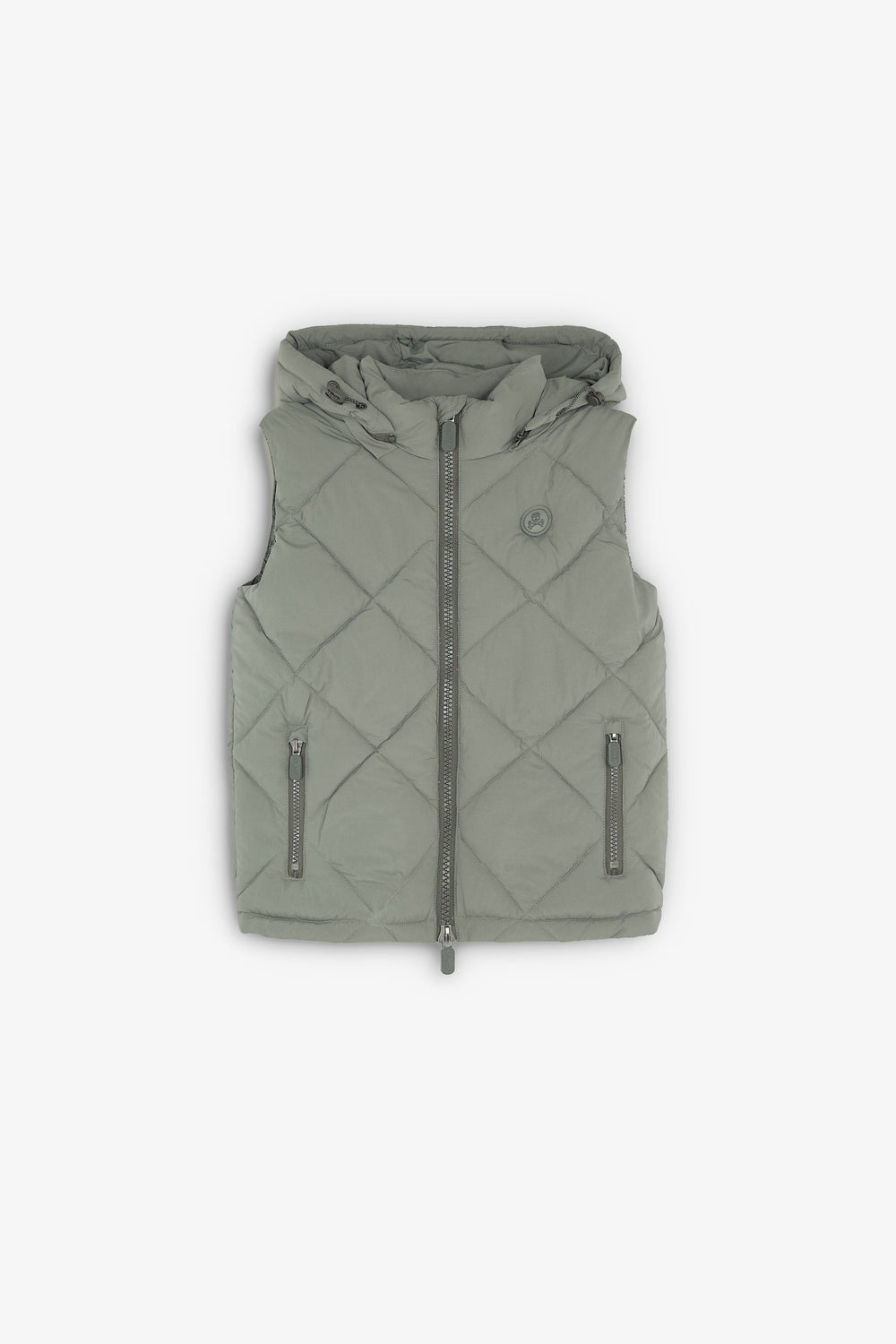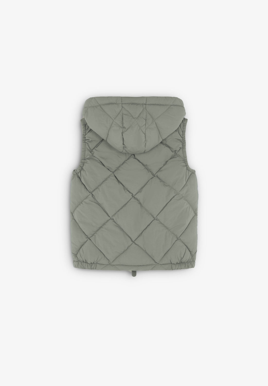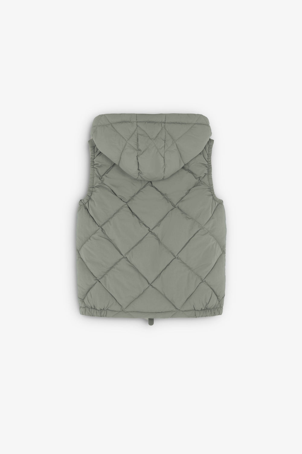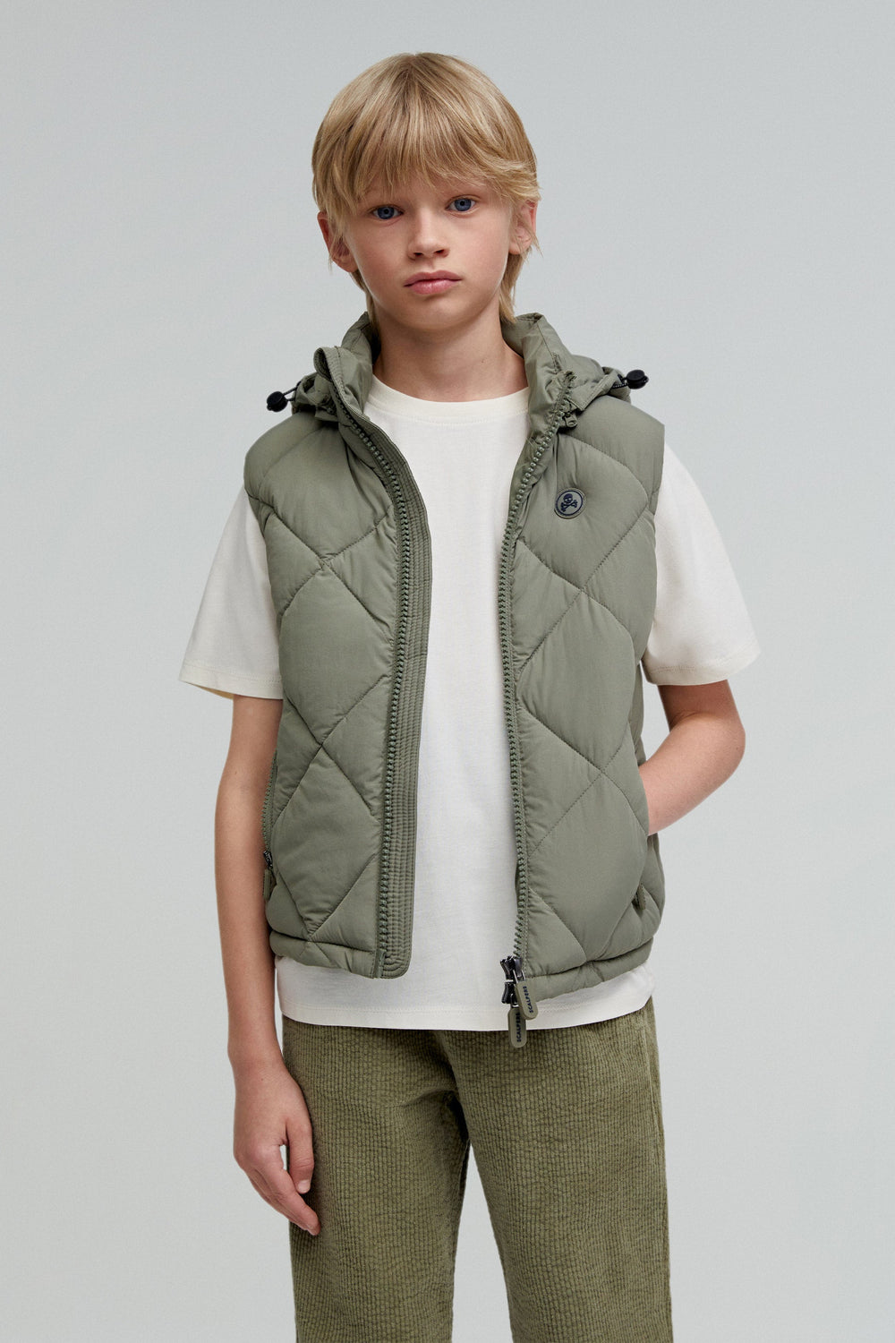 Chaleco acolchado con capucha desmontable y ajustadores. Confeccionado en tejido técnico. Corte Regular fit. Cuello subido con protector de barbilla y capucha. Cierre con cremallera de doble carro. Manga en sisa. Bolsillo laterales con cremallera y bolsillo interior. Detalle de parche de goma en el pecho a tono.