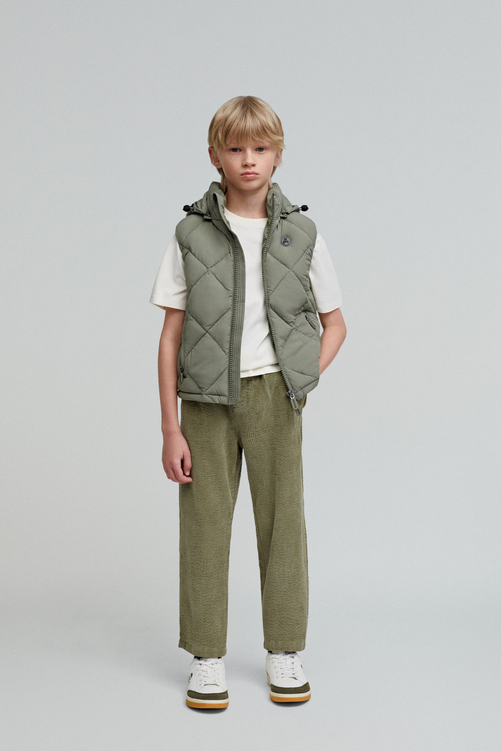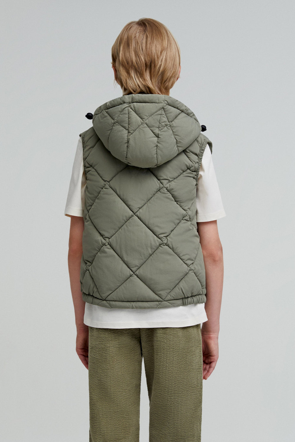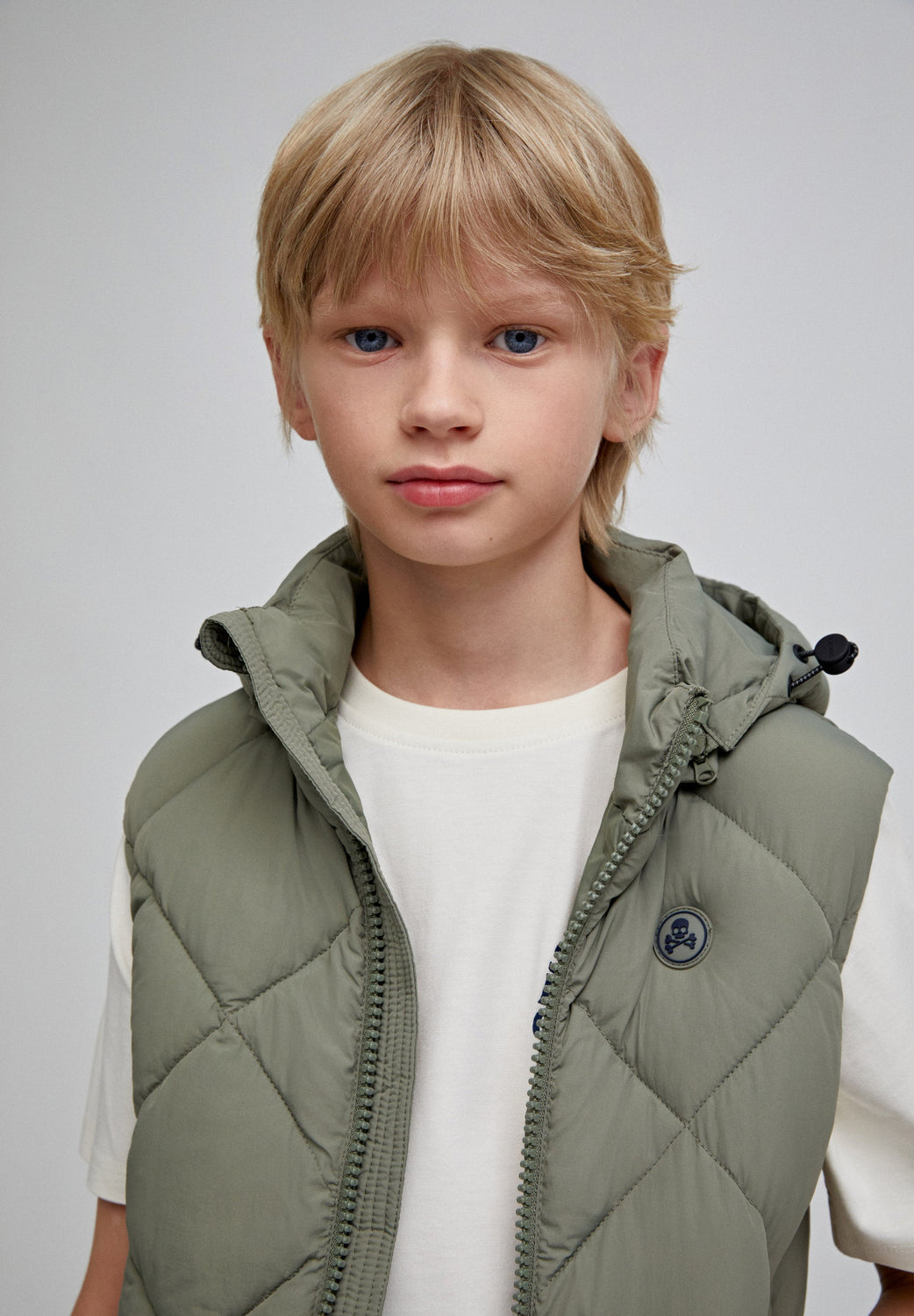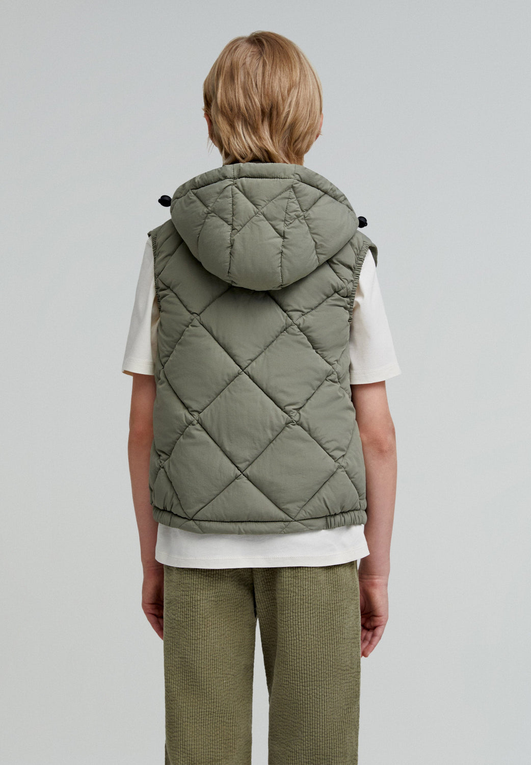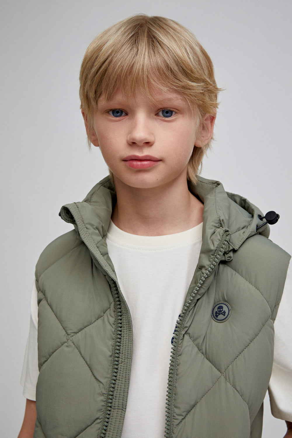 Chaleco acolchado con capucha desmontable y ajustadores. Confeccionado en tejido técnico. Corte Regular fit. Cuello subido con protector de barbilla y capucha. Cierre con cremallera de doble carro. Manga en sisa. Bolsillo laterales con cremallera y bolsillo interior. Detalle de parche de goma en el pecho a tono.
