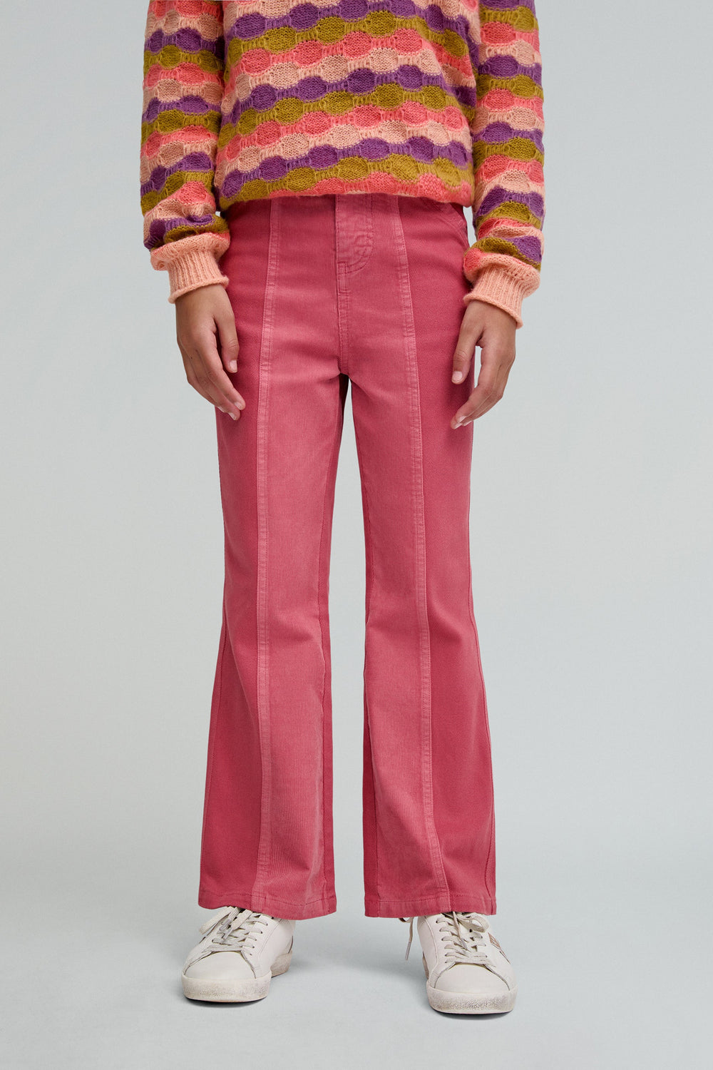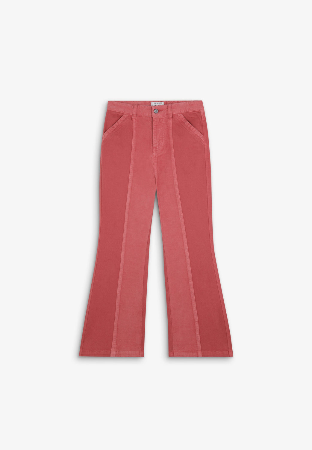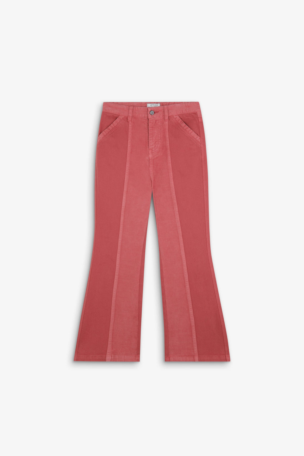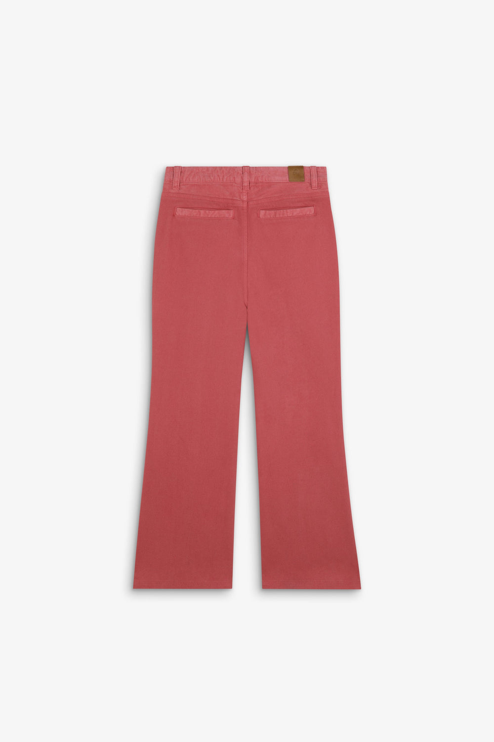 Pantalón confeccionado en algodón BCI ligeramente elástico. Corte flare, cierre con botón y cremallera y bolsillos laterales y traseros. Detalle de costura marcada central.