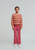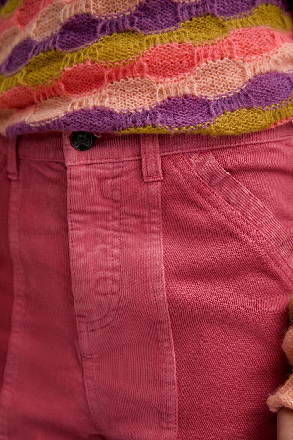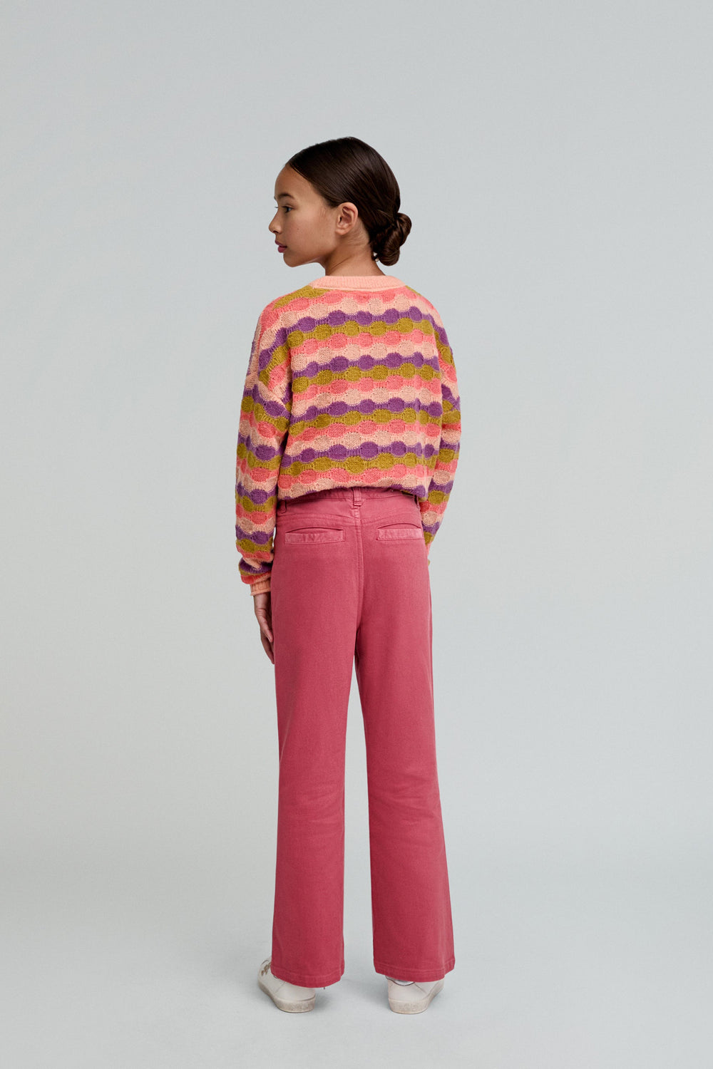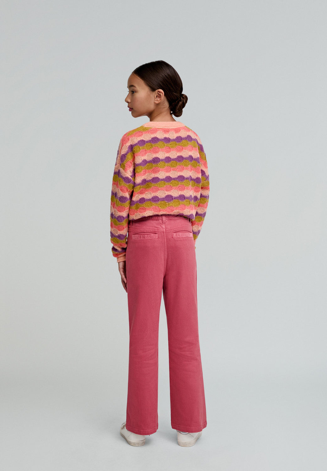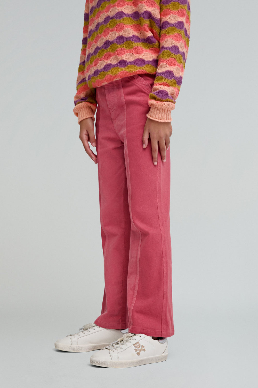 Pantalón confeccionado en algodón BCI ligeramente elástico. Corte flare, cierre con botón y cremallera y bolsillos laterales y traseros. Detalle de costura marcada central.